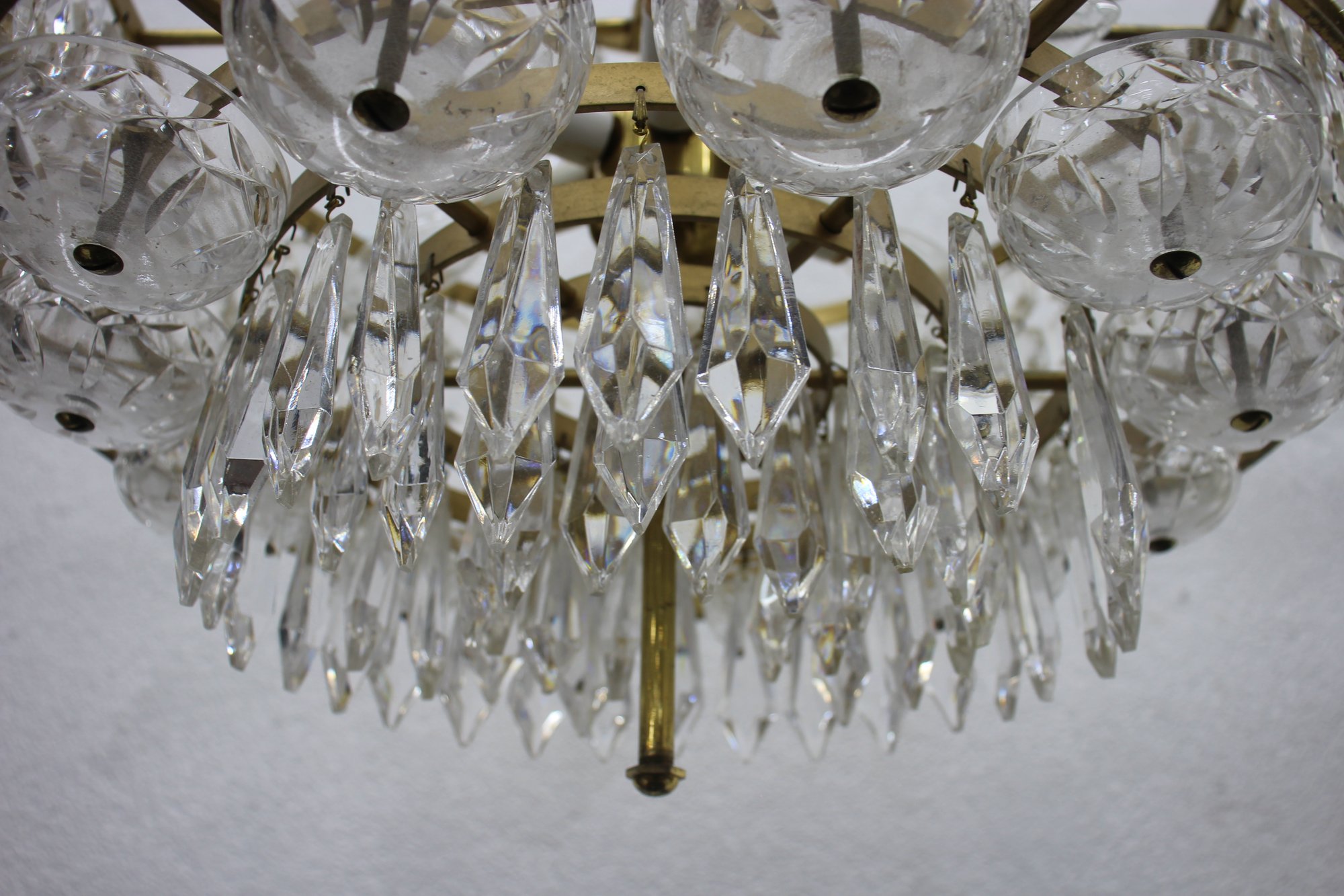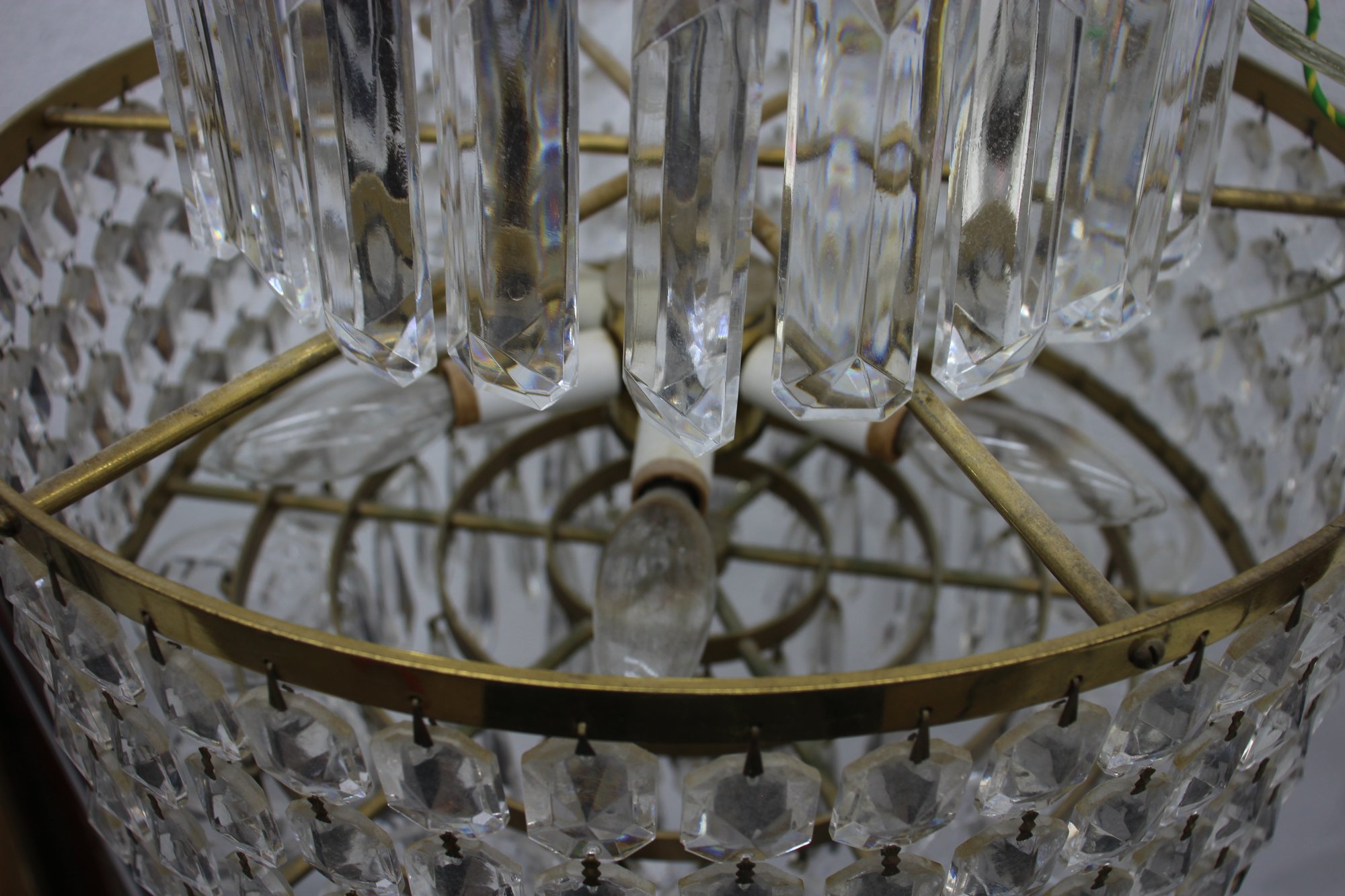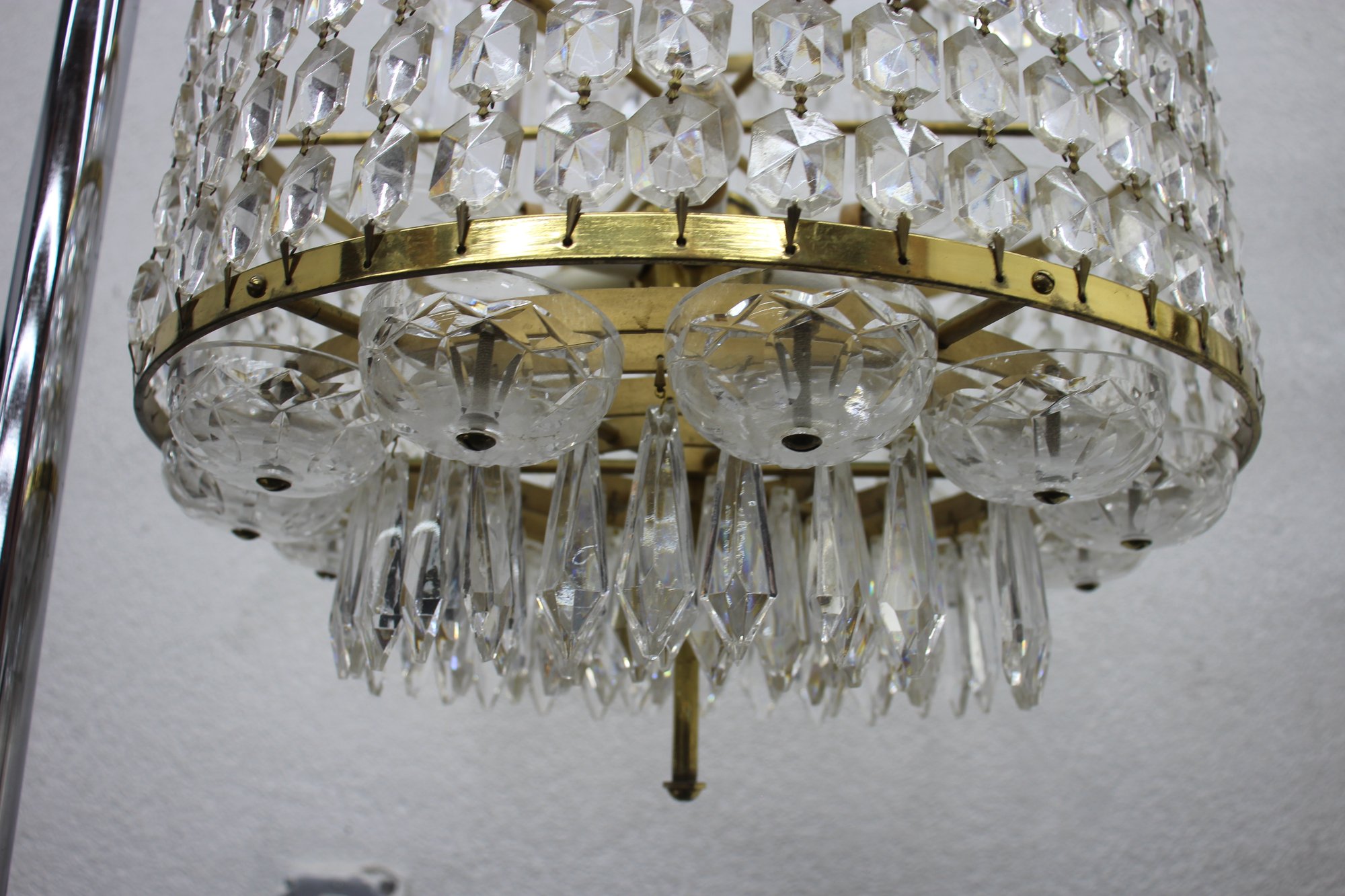 this stunning Waterford Crystal two-tier chandelier. Featuring shimmering cut crystal prisms arranged in concentric rings, this exquisite piece combines classic elegance with timeless craftsmanship. The chandelier's brass frame adds a warm, luxurious touch, complementing the brilliance of the crystal drops. Ideal for formal dining areas, entryways, or any room that calls for a statement lighting fixture.