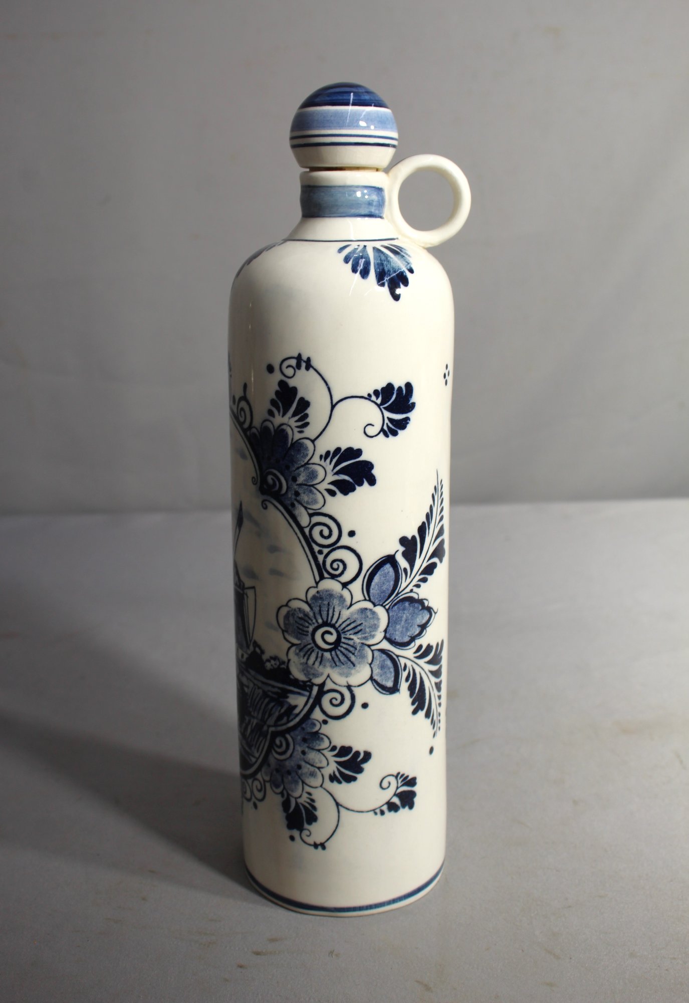 a stunning example of Dutch craftsmanship. This beautifully designed decanter features intricate blue floral patterns set against a pristine white background, showcasing the timeless beauty and artistry of traditional Delftware.