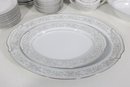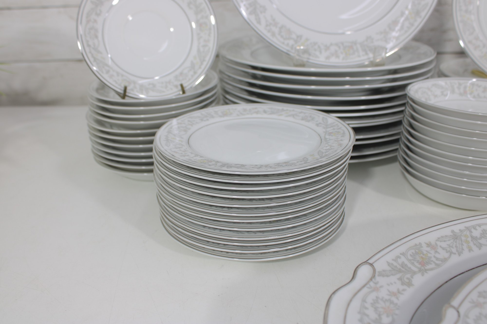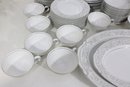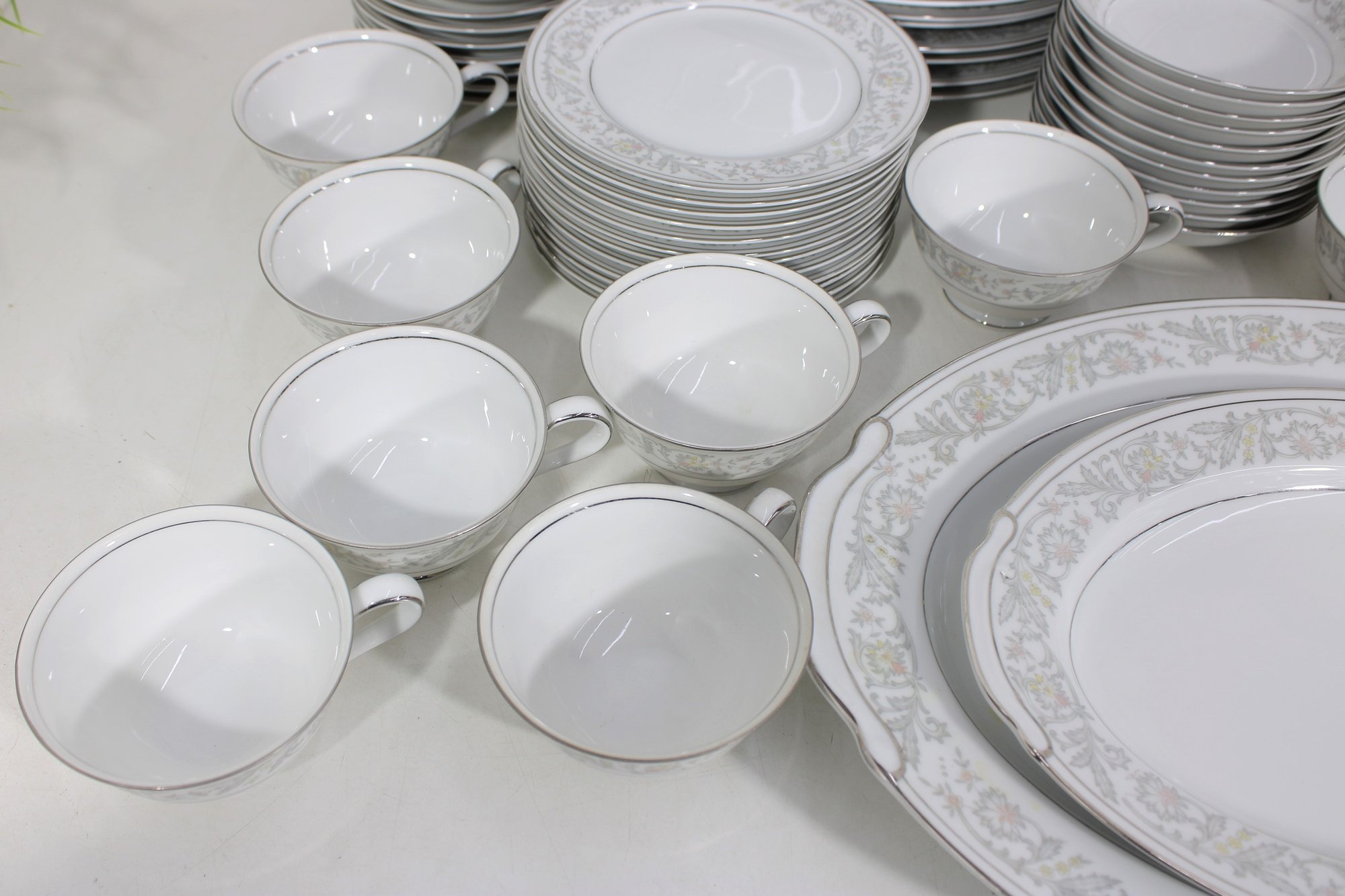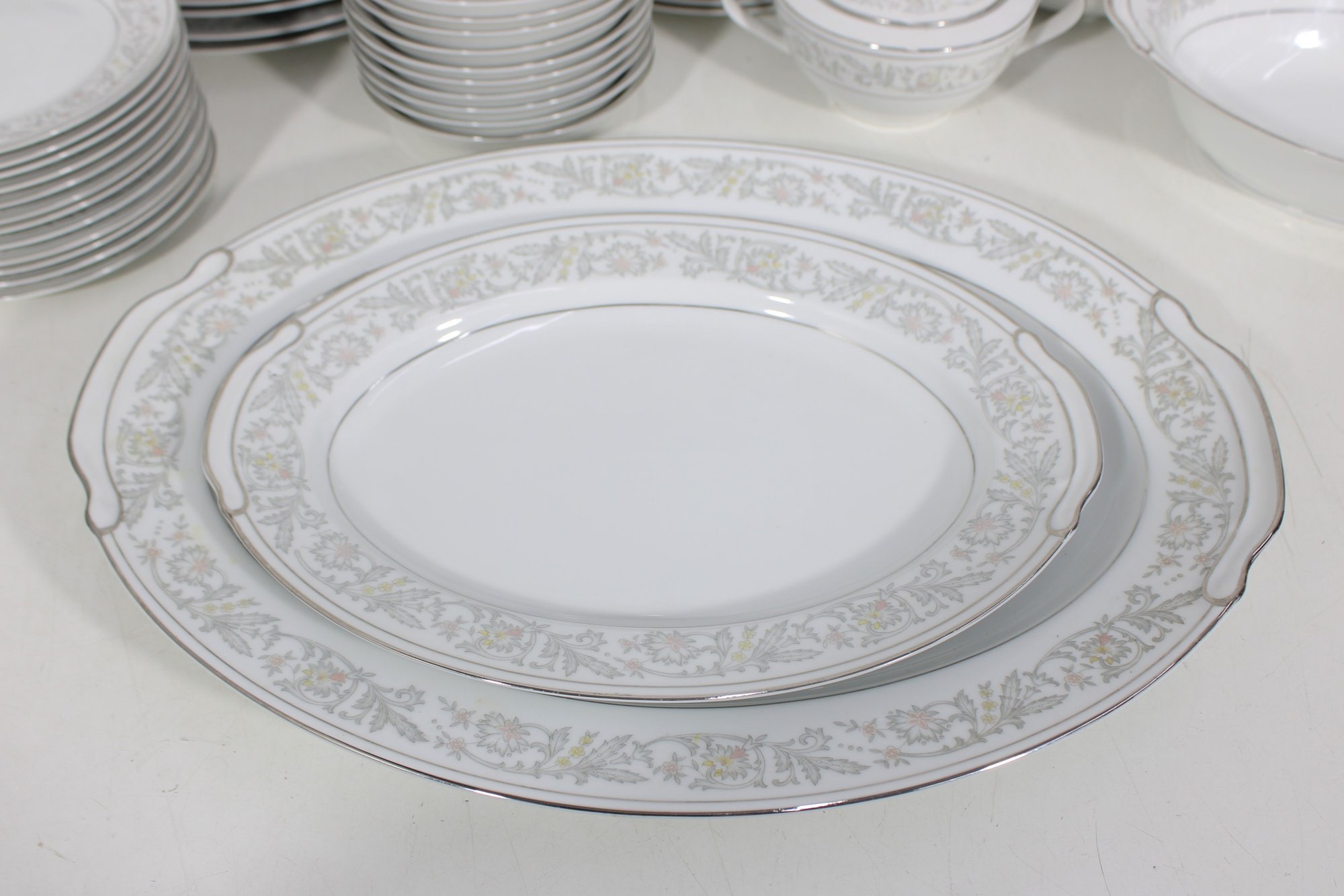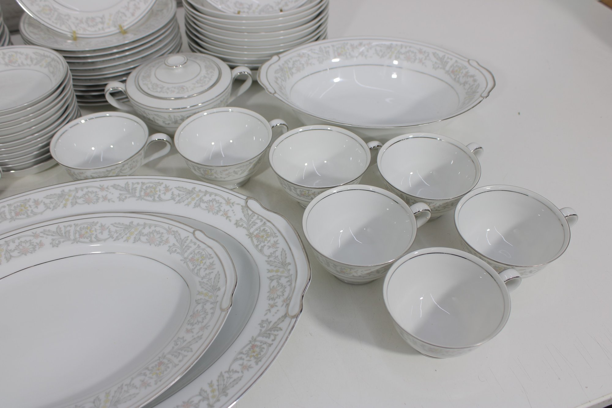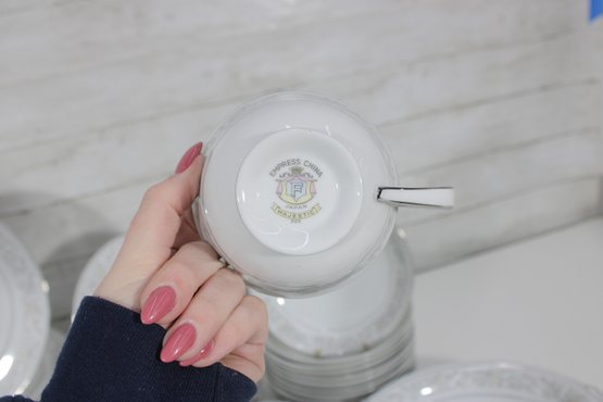 Elegant Empress China “Majestic” partial dinnerware set in white with a soft gray floral scroll border and fine trim detail. This classic pattern includes a generous assortment of plates, cups, bowls, and serving pieces, making it well suited for formal dining, holiday use, display, or adding to an existing Majestic collection.