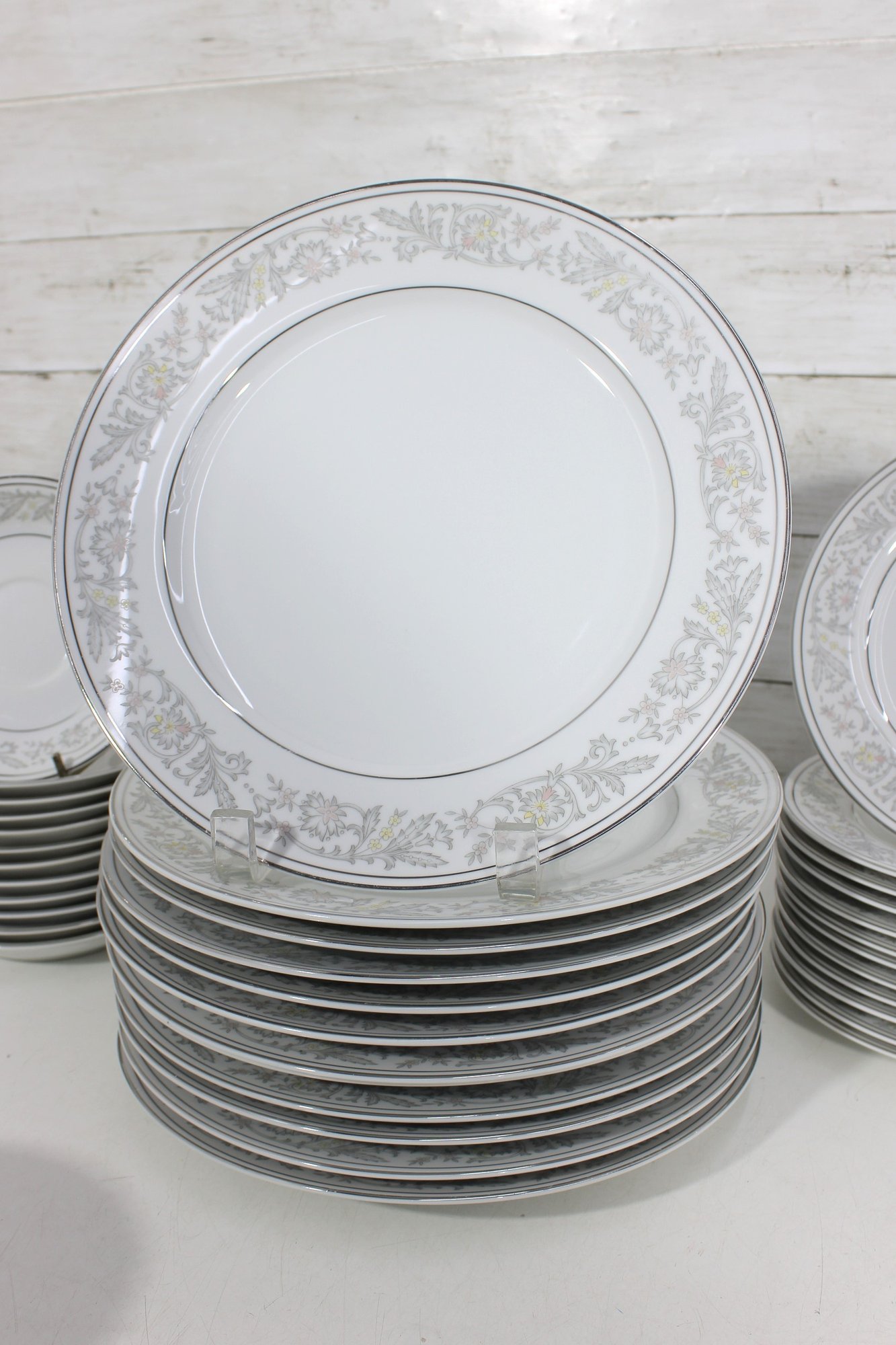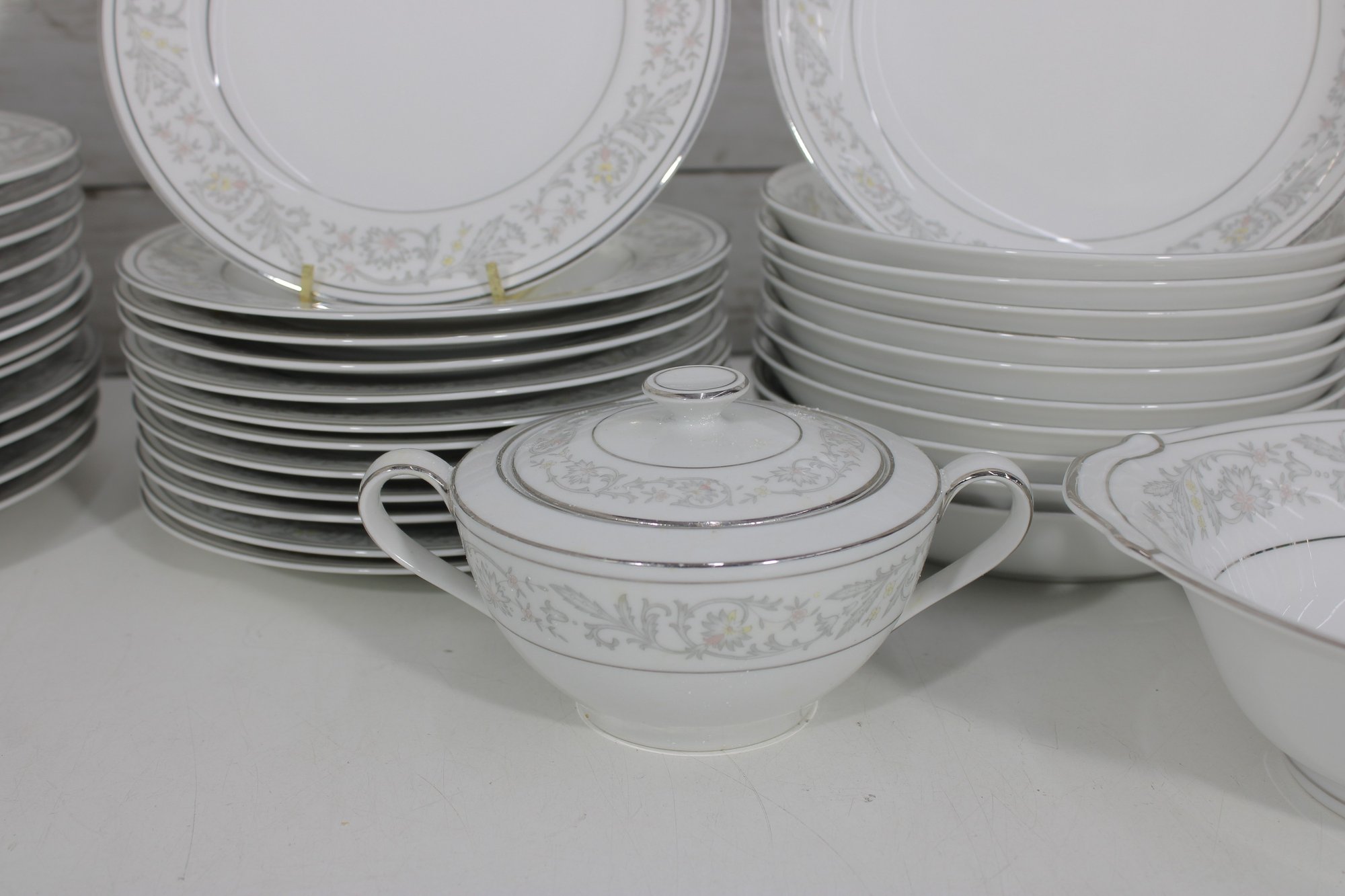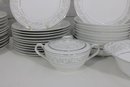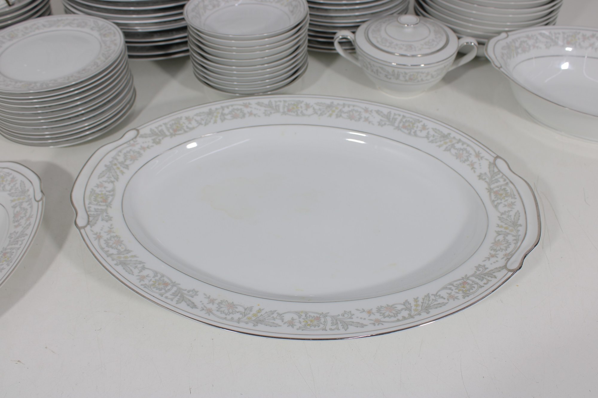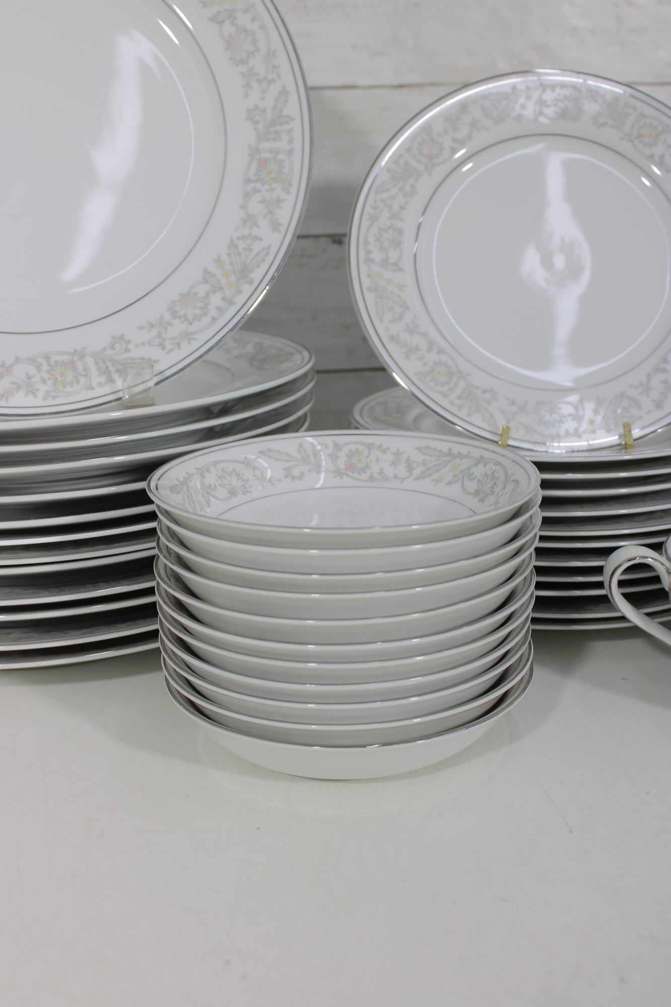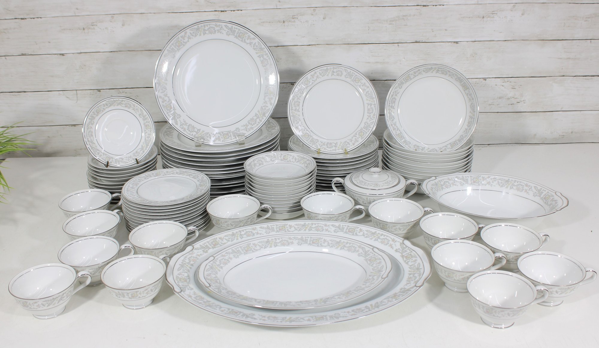 Elegant Empress China “Majestic” partial dinnerware set in white with a soft gray floral scroll border and fine trim detail. This classic pattern includes a generous assortment of plates, cups, bowls, and serving pieces, making it well suited for formal dining, holiday use, display, or adding to an existing Majestic collection.