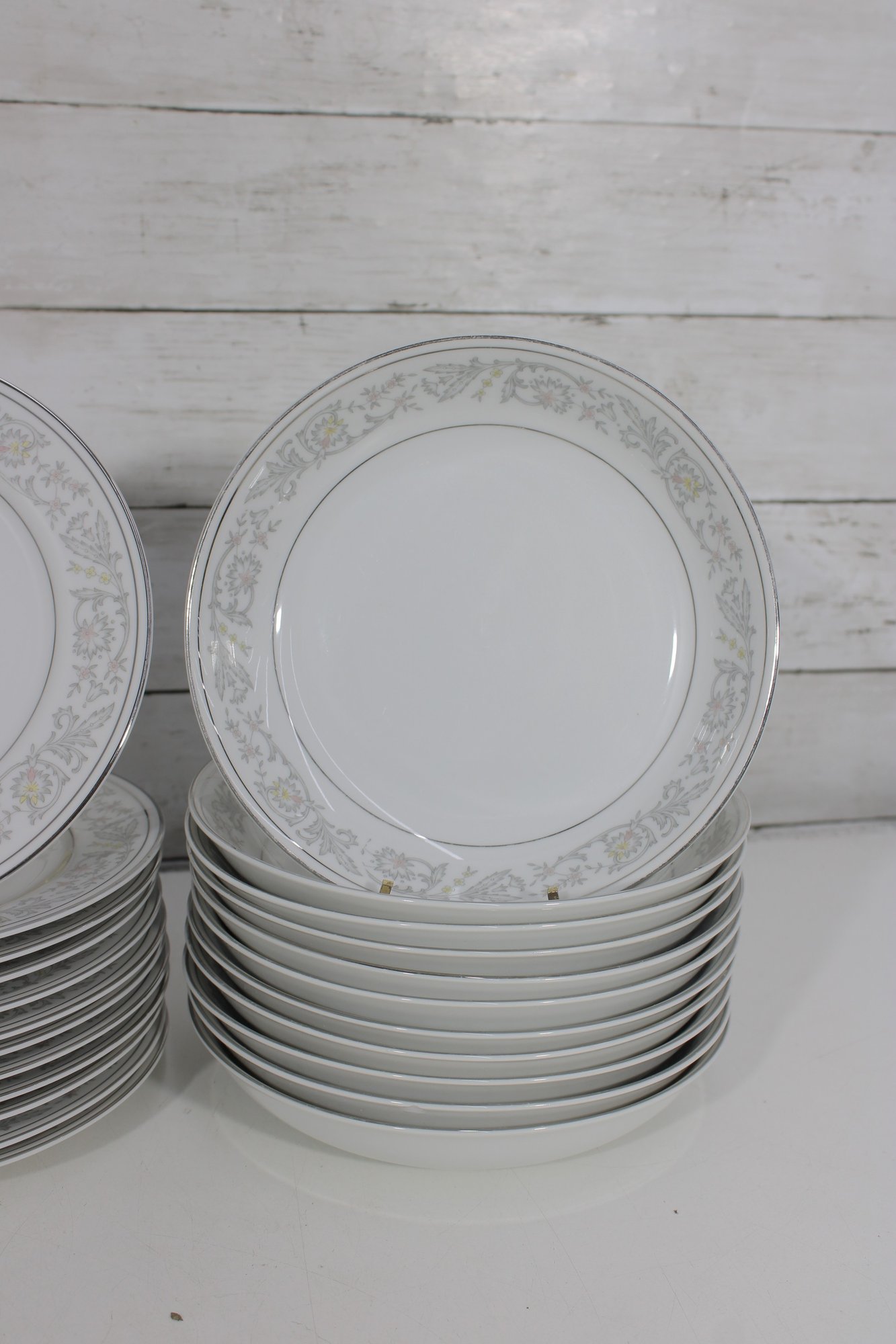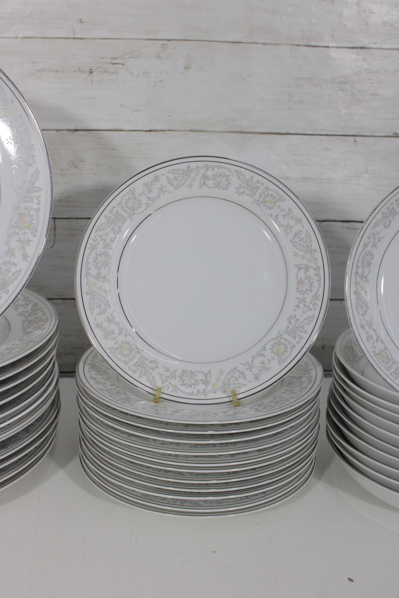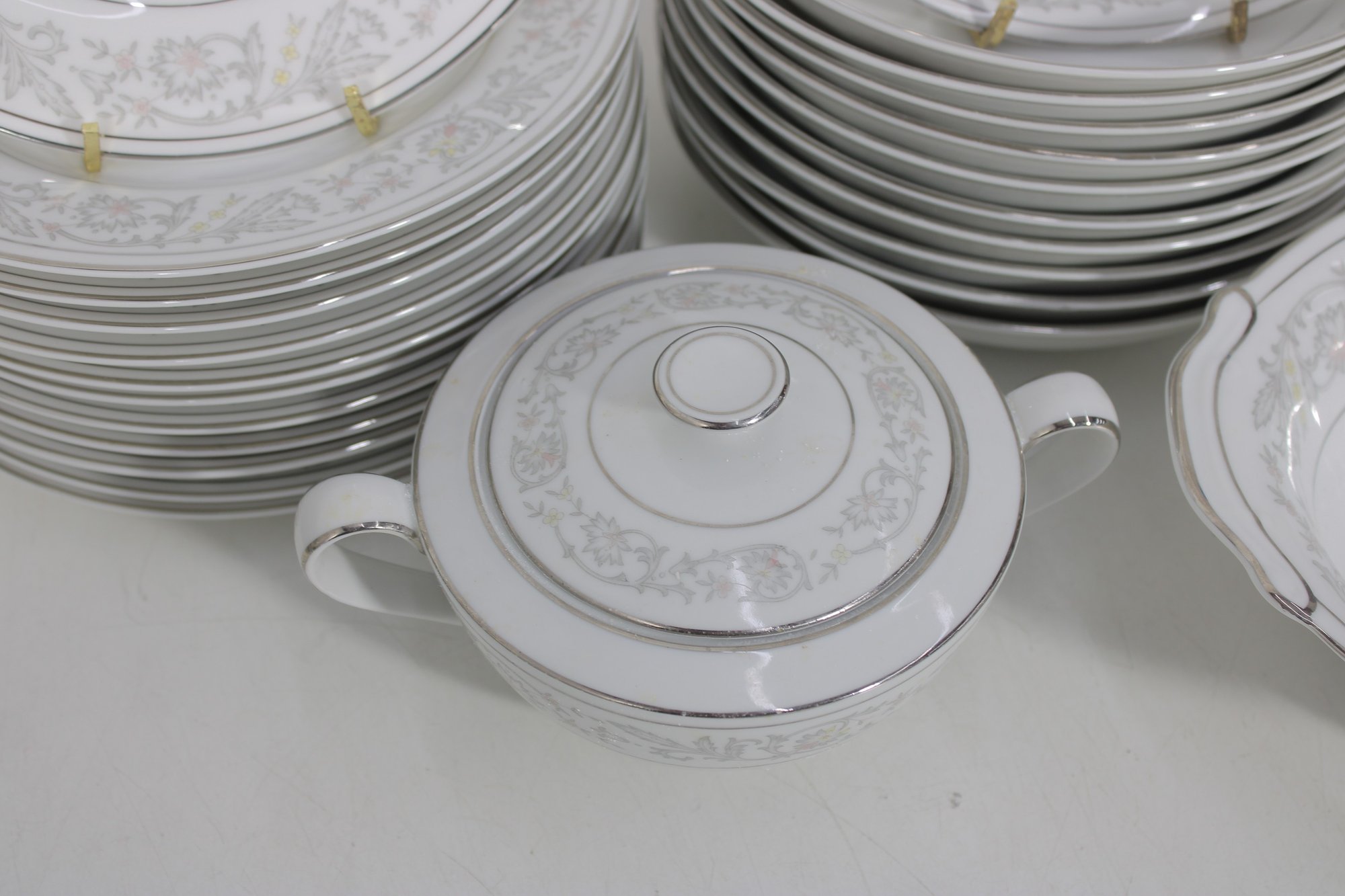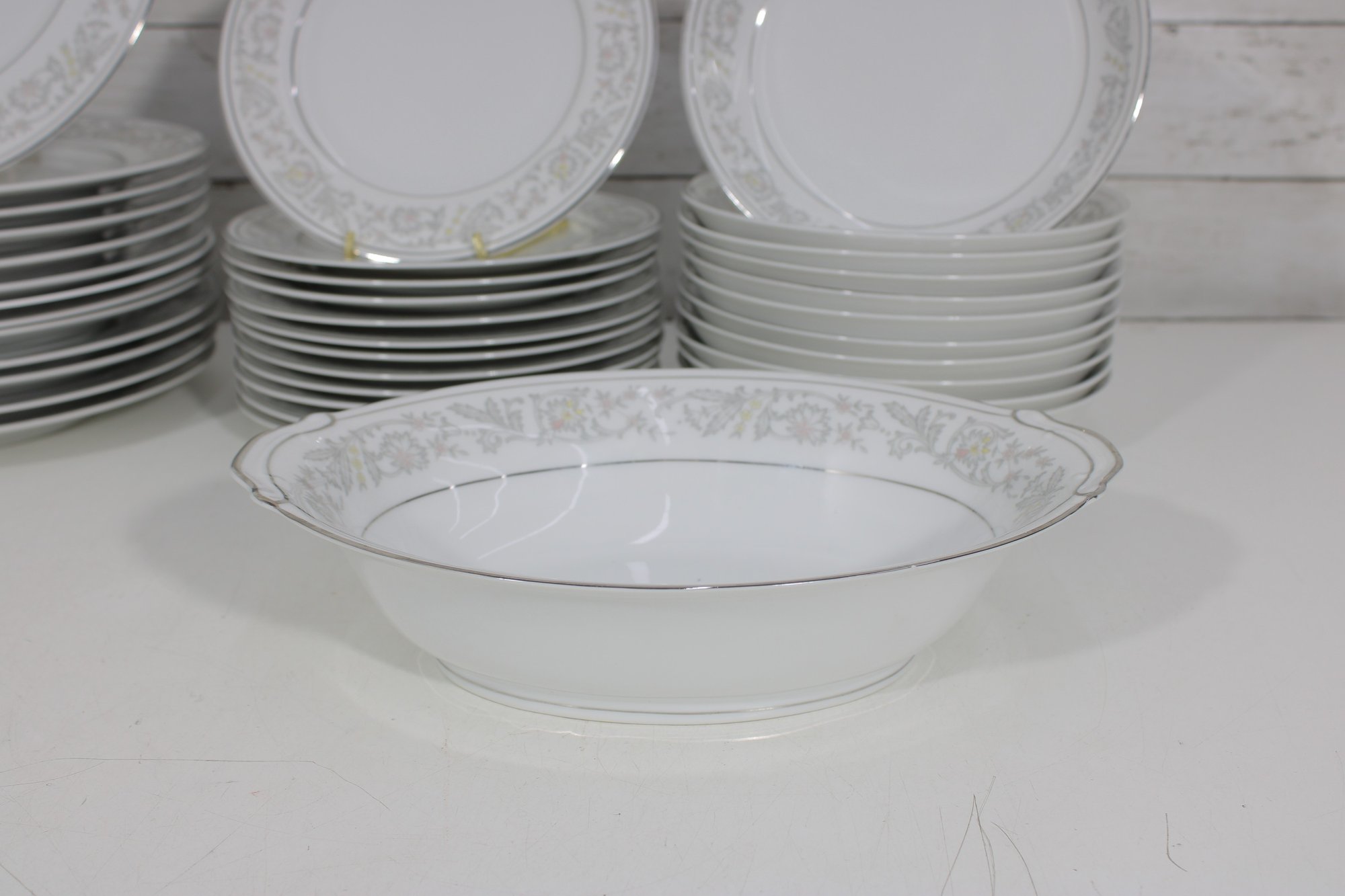 Elegant Empress China “Majestic” partial dinnerware set in white with a soft gray floral scroll border and fine trim detail. This classic pattern includes a generous assortment of plates, cups, bowls, and serving pieces, making it well suited for formal dining, holiday use, display, or adding to an existing Majestic collection.