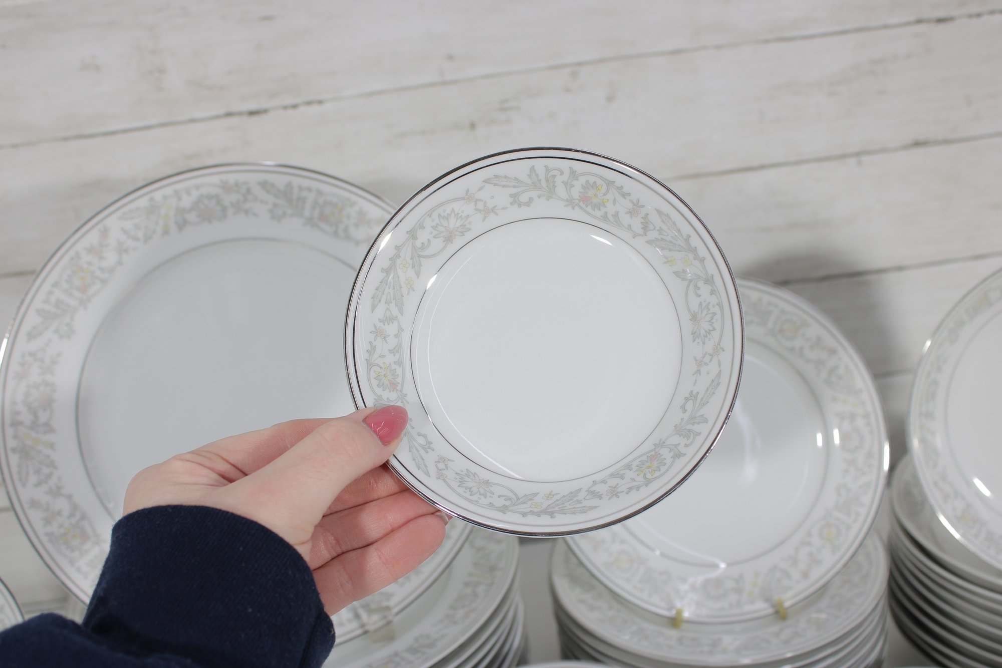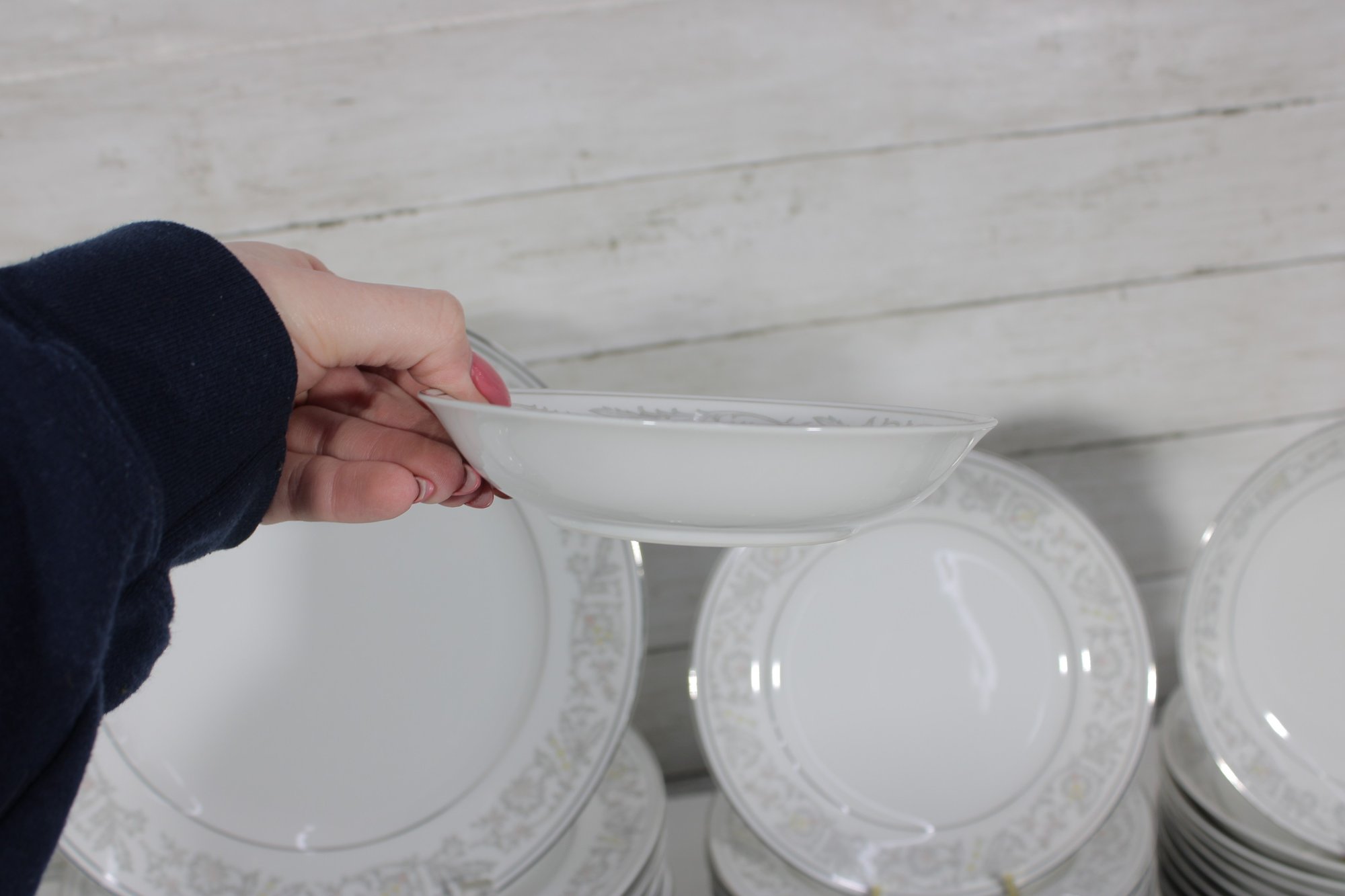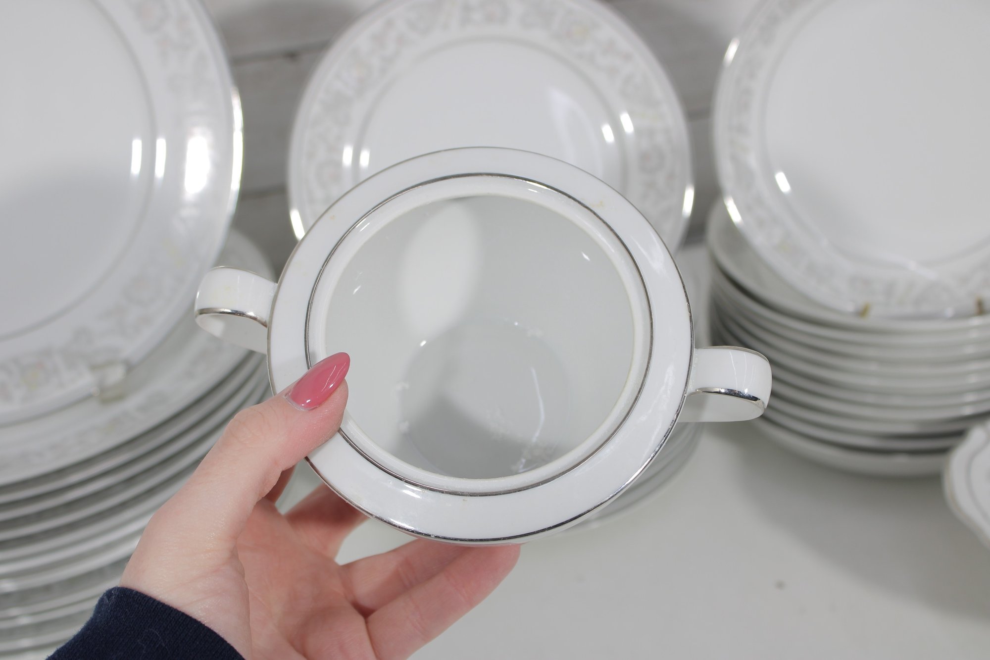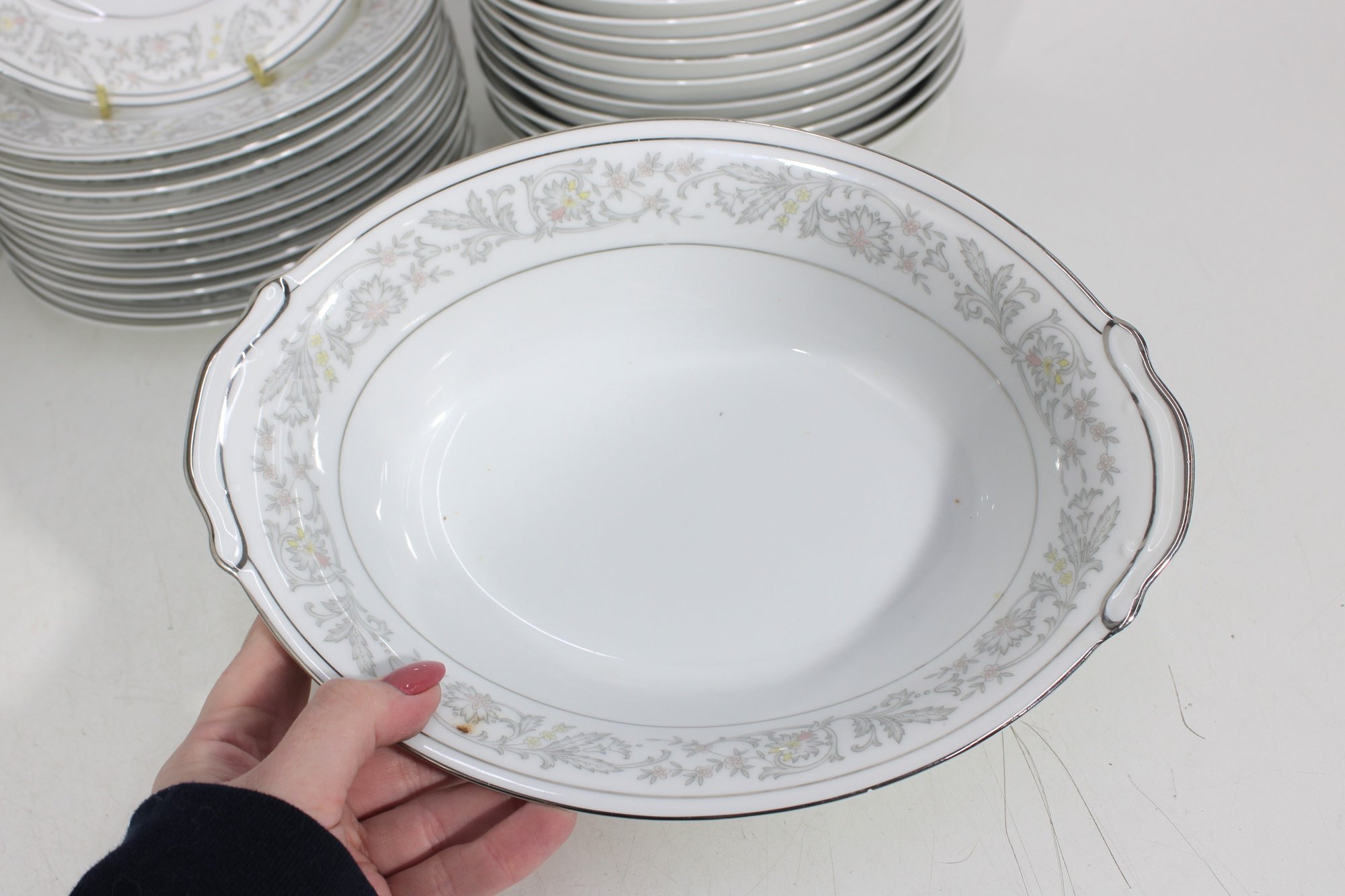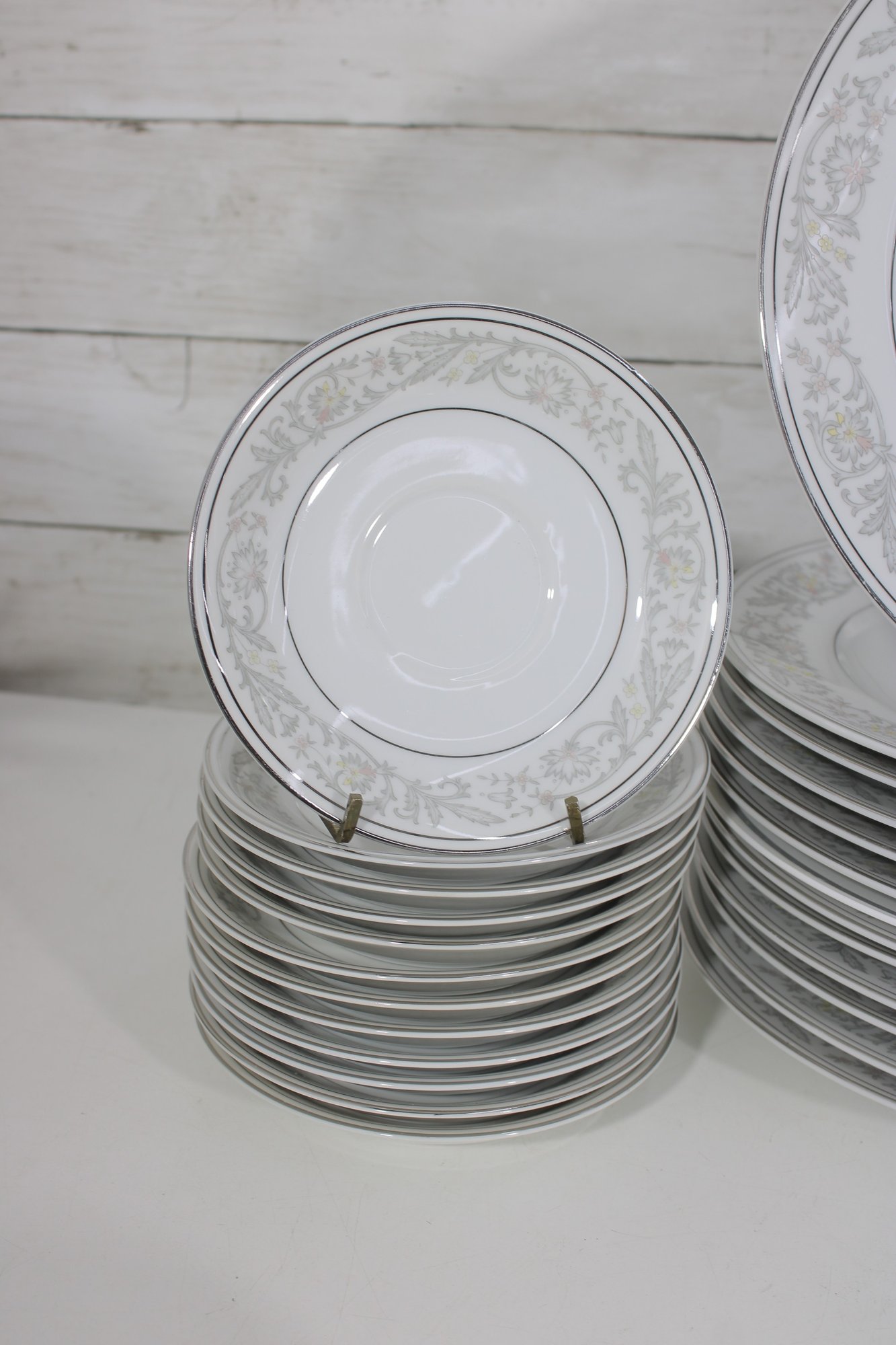 Elegant Empress China “Majestic” partial dinnerware set in white with a soft gray floral scroll border and fine trim detail. This classic pattern includes a generous assortment of plates, cups, bowls, and serving pieces, making it well suited for formal dining, holiday use, display, or adding to an existing Majestic collection.
