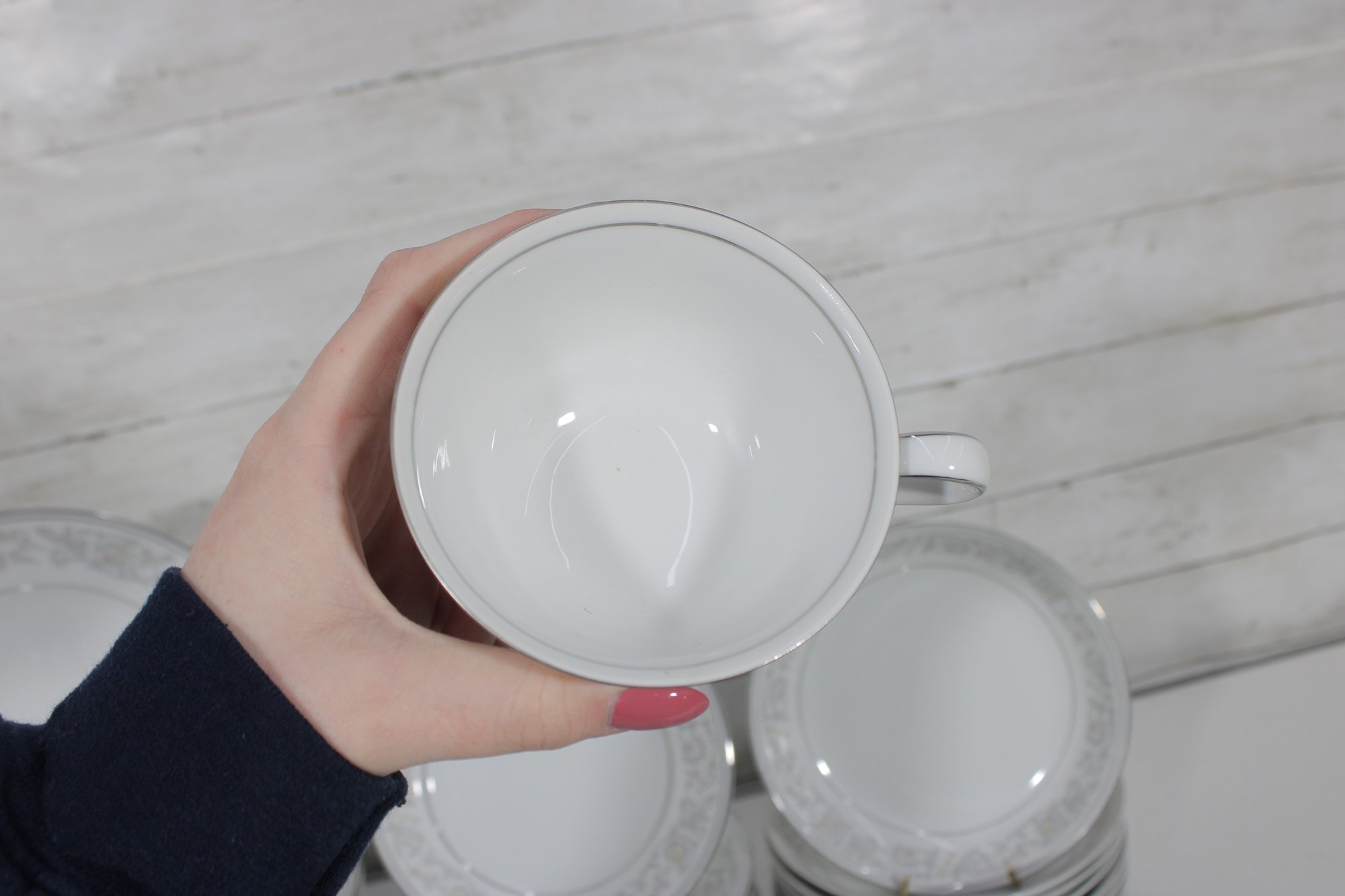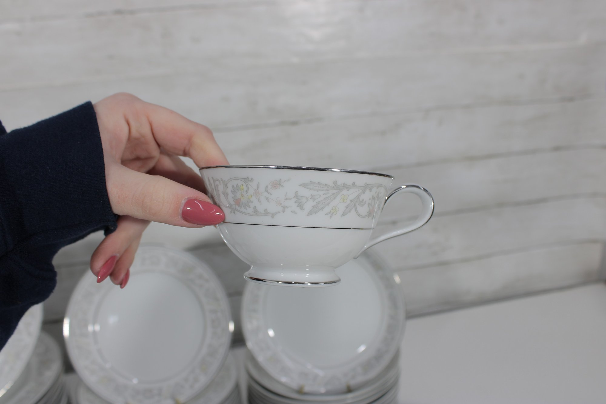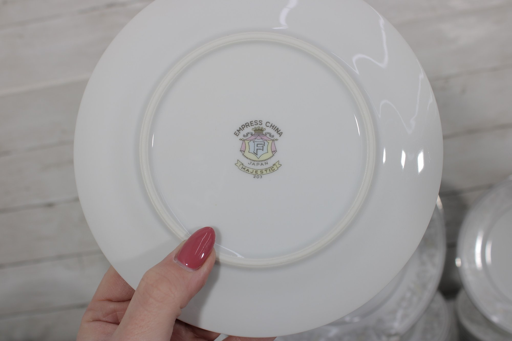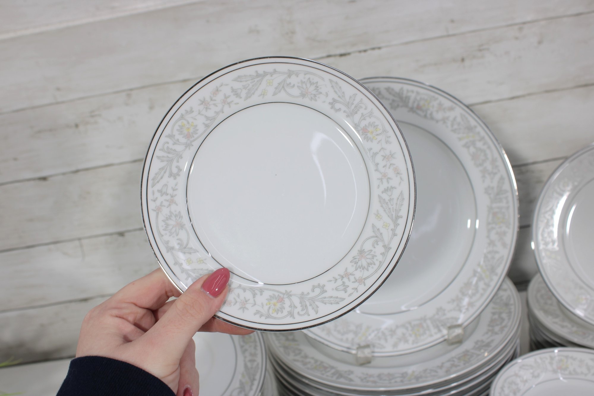 Elegant Empress China “Majestic” partial dinnerware set in white with a soft gray floral scroll border and fine trim detail. This classic pattern includes a generous assortment of plates, cups, bowls, and serving pieces, making it well suited for formal dining, holiday use, display, or adding to an existing Majestic collection.