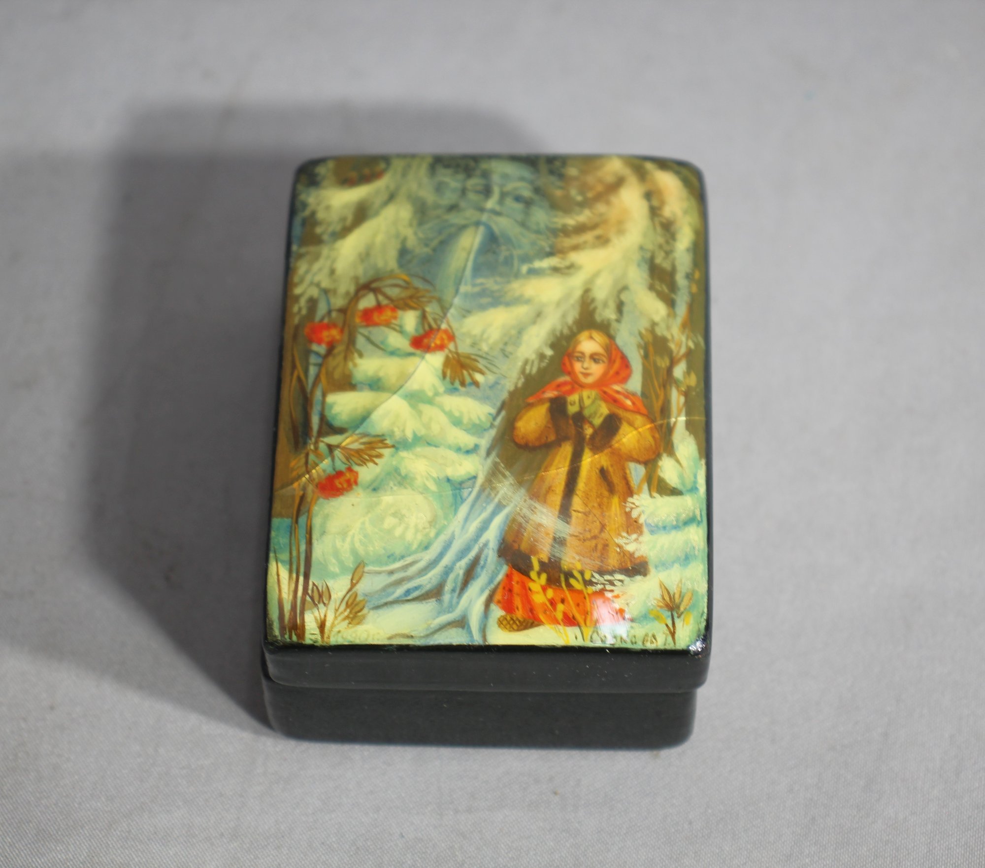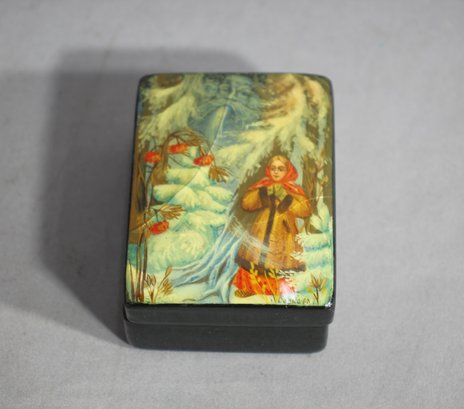 The scene depicted on the lid is one of ethereal beauty, featuring a rosy-cheeked maiden amidst a snowy landscape, her delicate features framed by a traditional headscarf. The artwork is rich in vibrant colors and fine details, showcasing the distinctive style that Russian lacquer art is renowned for.