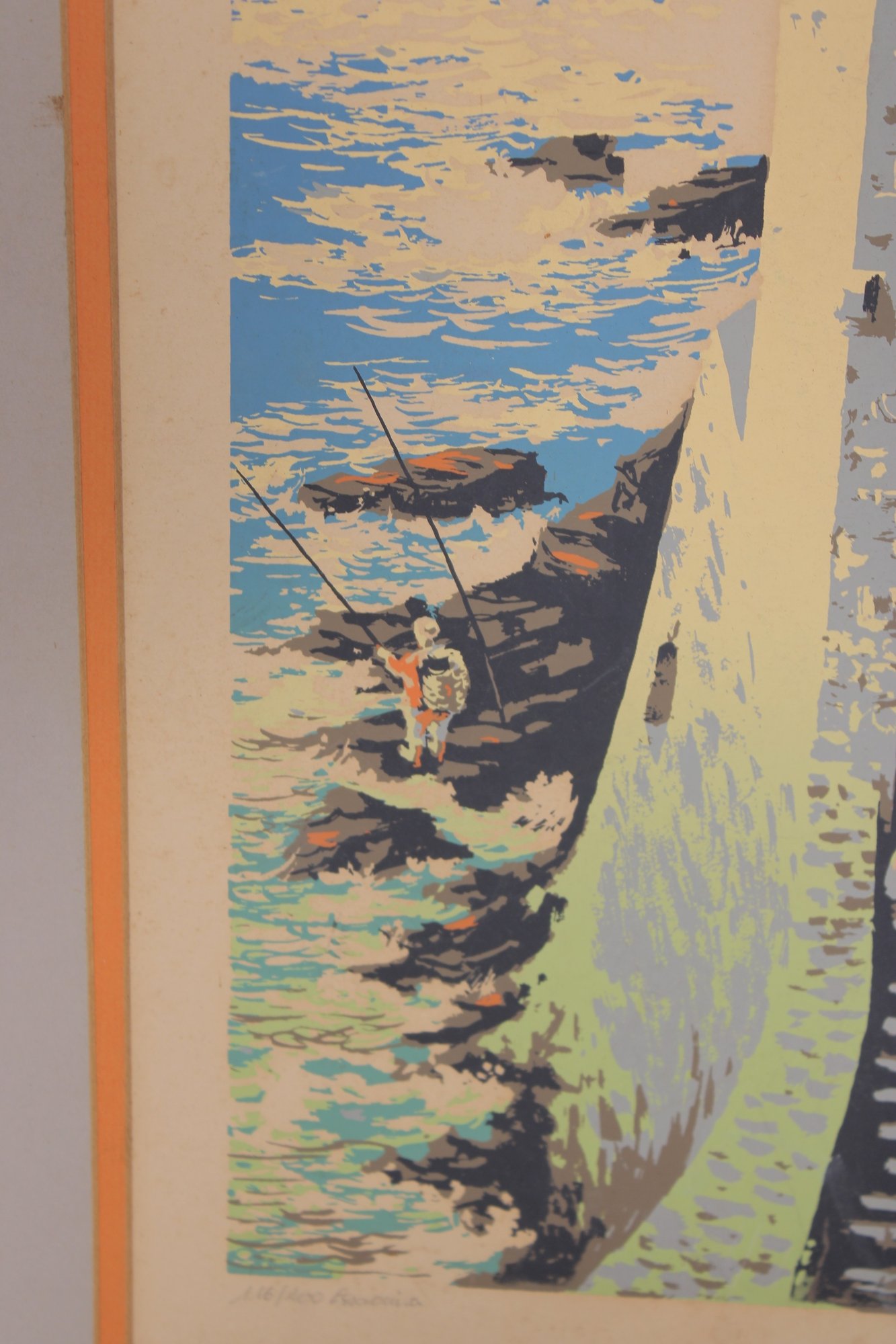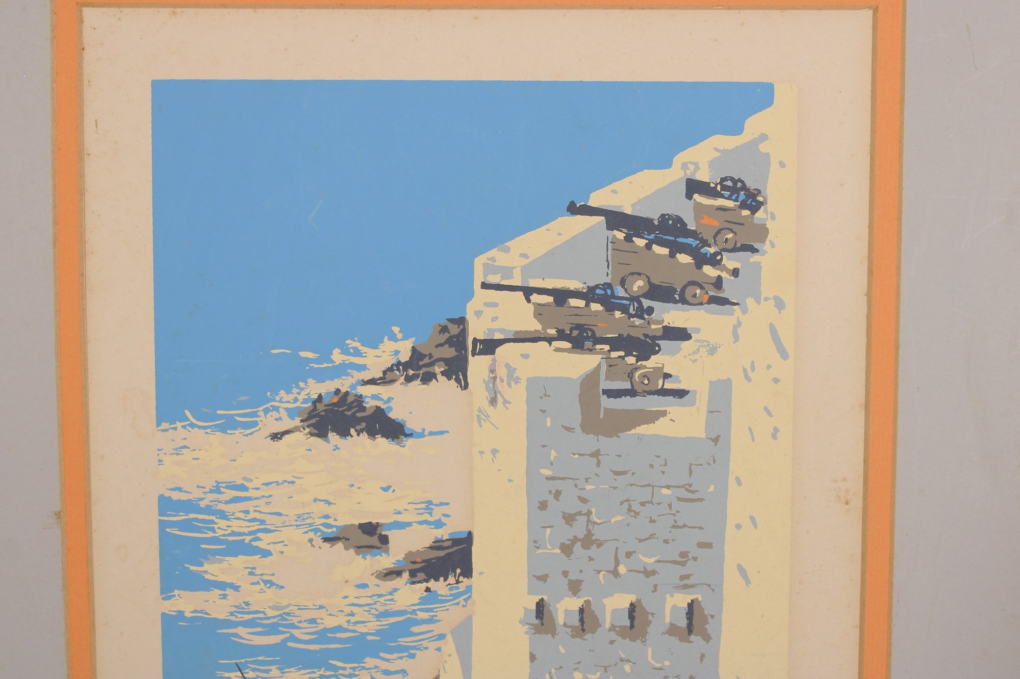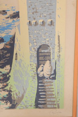 limited edition coastal print, pencil signed and numbered 116/200, featuring a picturesque Mediterranean-style seaside scene. This vertically oriented composition depicts a stone tower overlooking the ocean, with waves crashing against the rocky shoreline and figures ascending a staircaseācapturing a warm, sunlit coastal atmosphere.