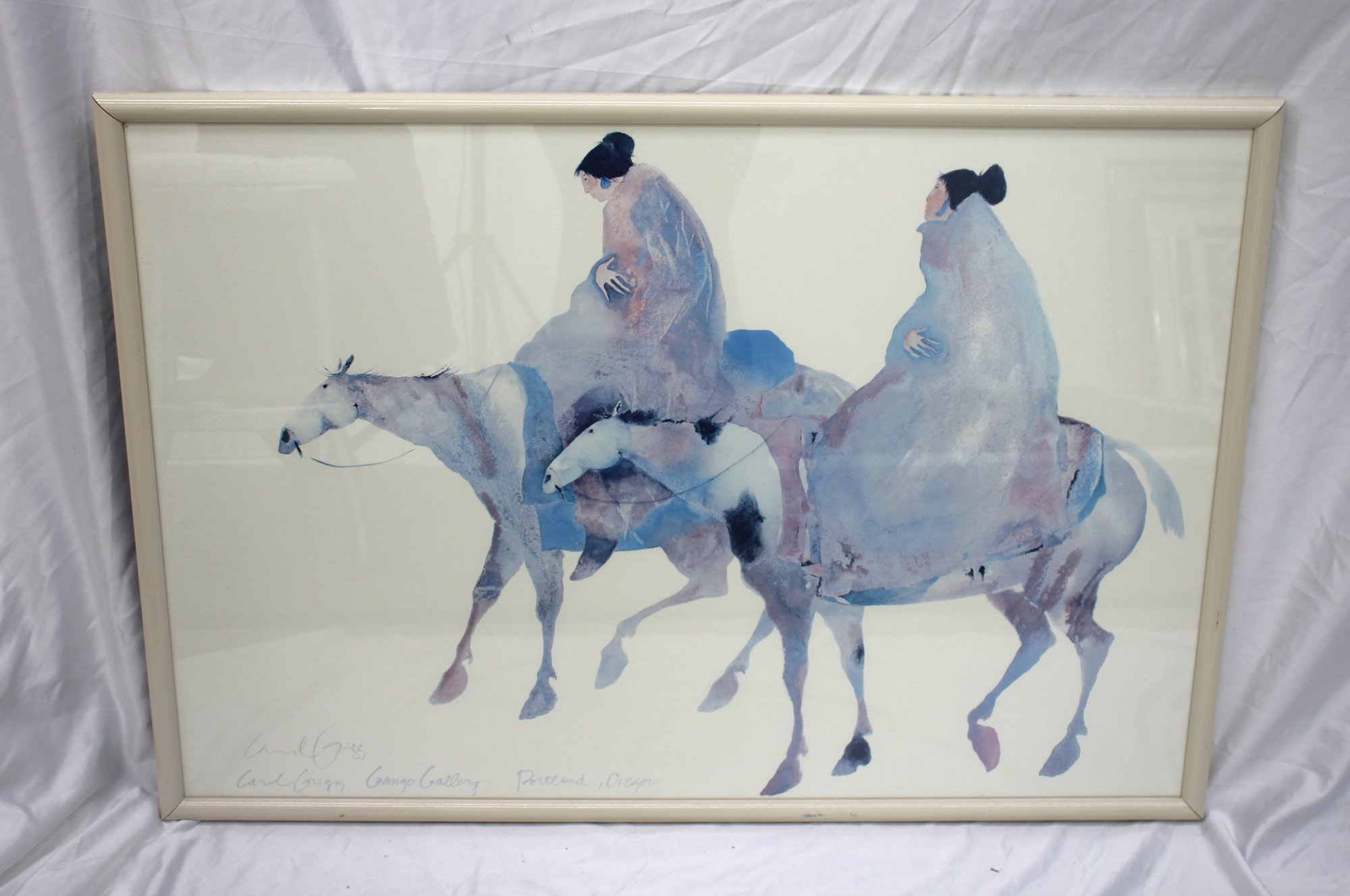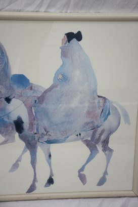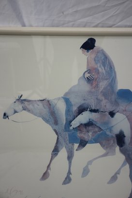 This elegant and serene pencil-signed art print features two Native American riders on horseback, rendered in a soft, ethereal palette of blues, purples, and muted earth tones. The delicate, almost watercolor-like composition captures a sense of movement and tranquility, making it a timeless and visually striking piece.