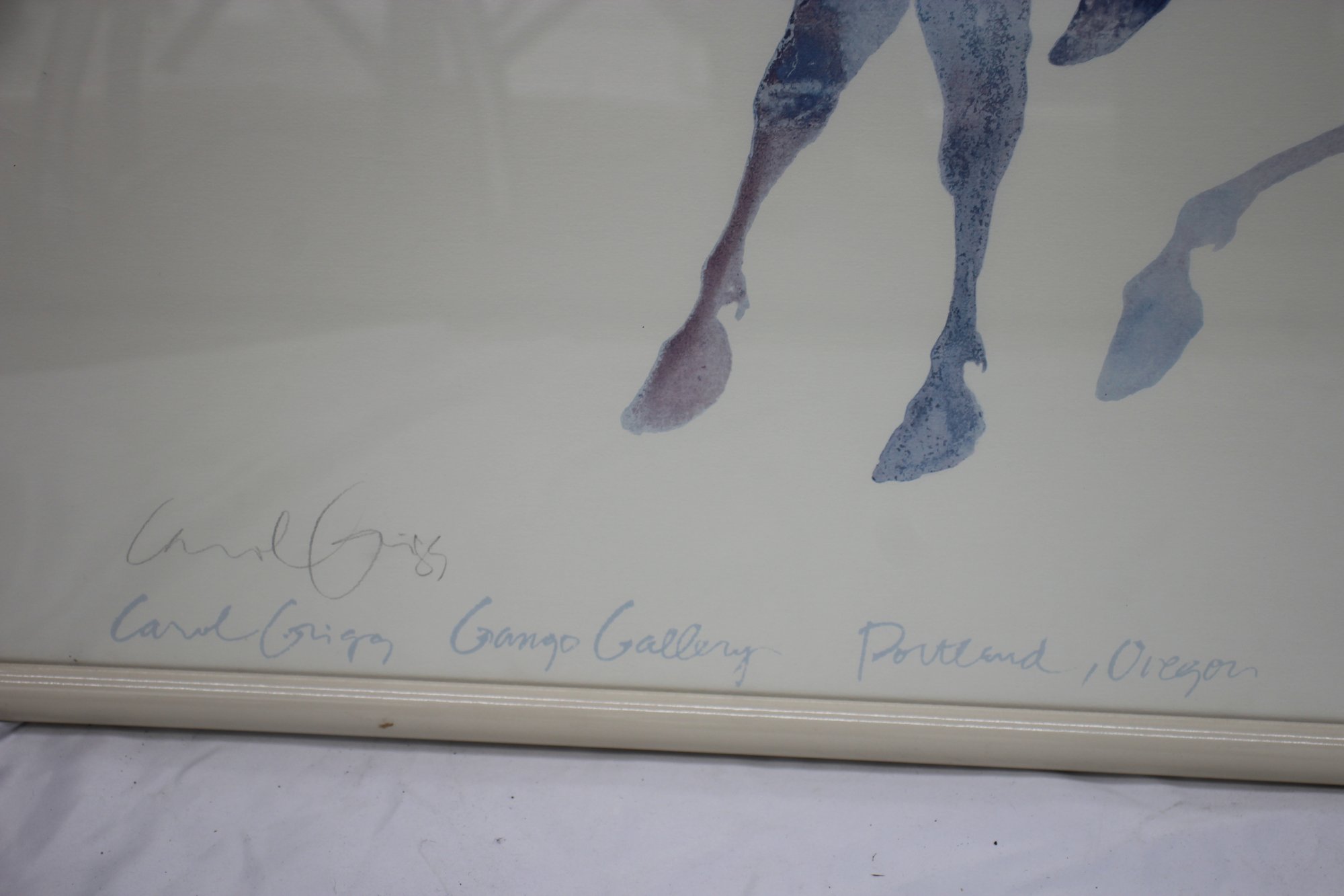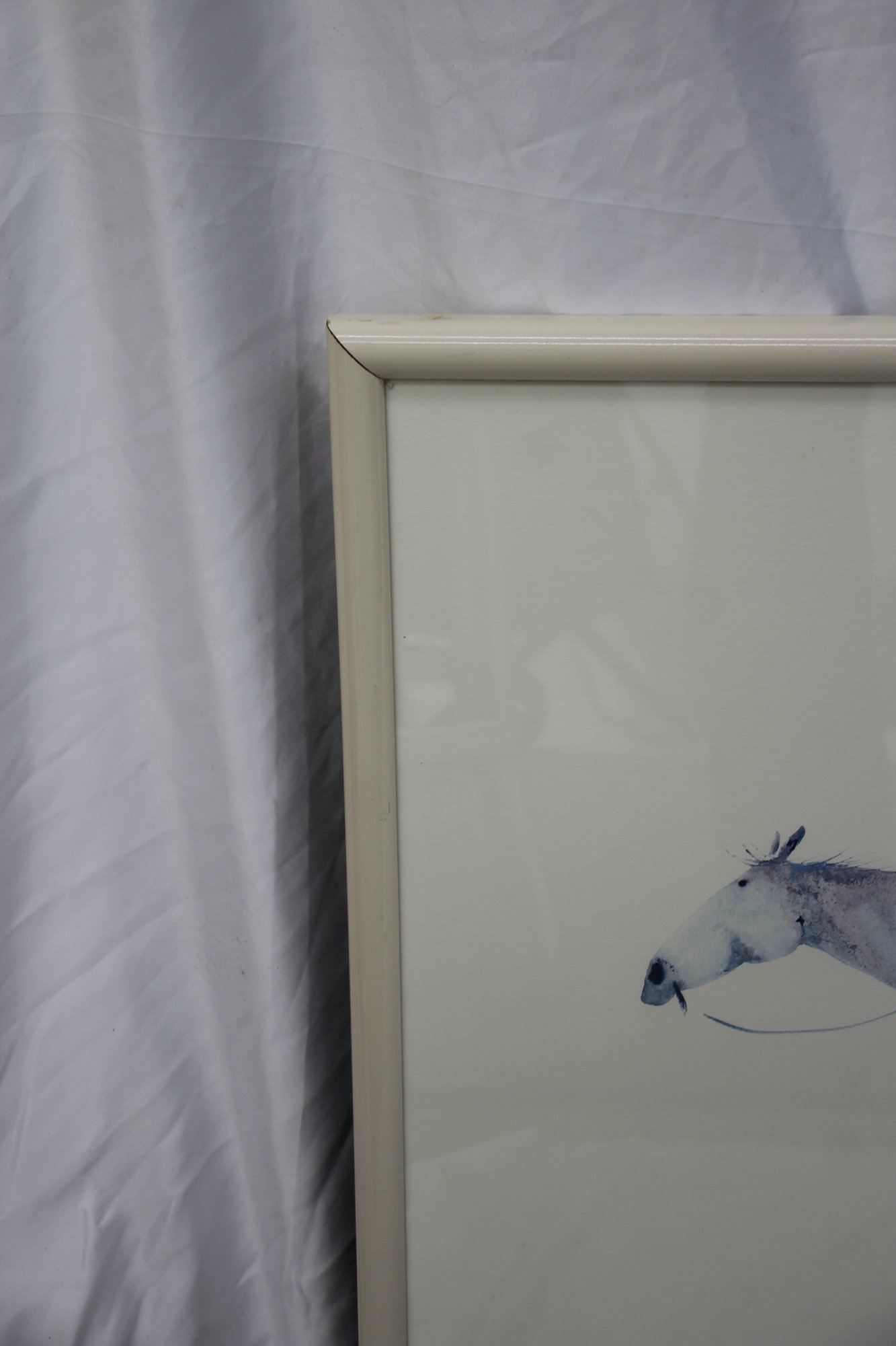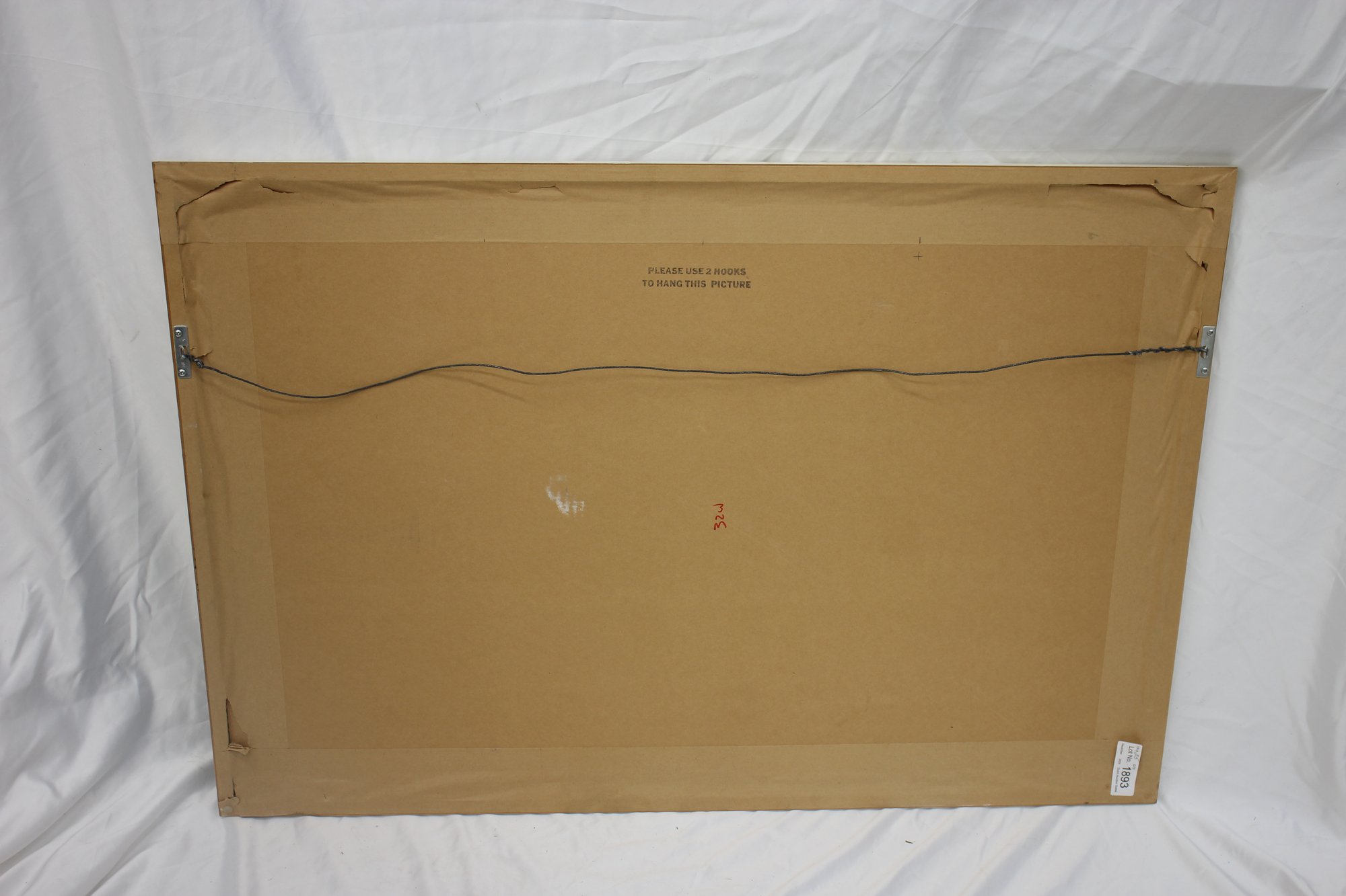 Measuring 27 inches in height and 39.5 inches in width, this artwork is presented in a simple yet refined white frame under glass, complementing its minimalist and contemporary aesthetic. The artist’s pencil signature is visible in the lower left corner, along with inscriptions indicating its provenance from a gallery in Portland, Oregon.