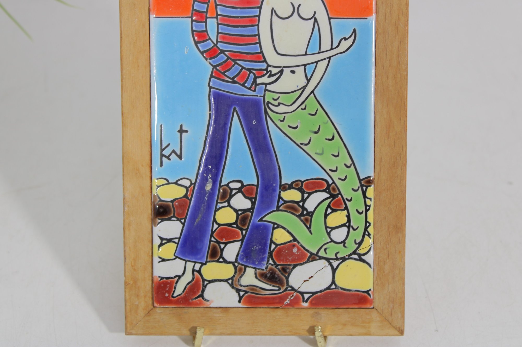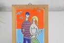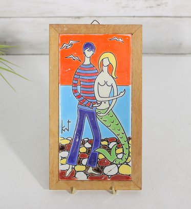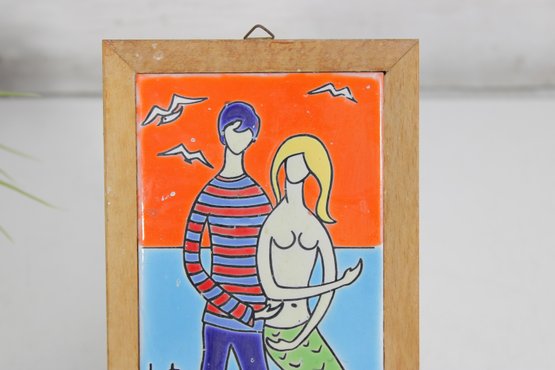Colorful hand-painted ceramic tile by Neofitou Keramik, crafted in Faliraki, Rhodes (Rodos), Greece. This vibrant piece features a whimsical figural scene of a couple, including a mermaid figure, set against a bold orange and blue background with stylized landscape elements.