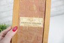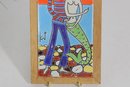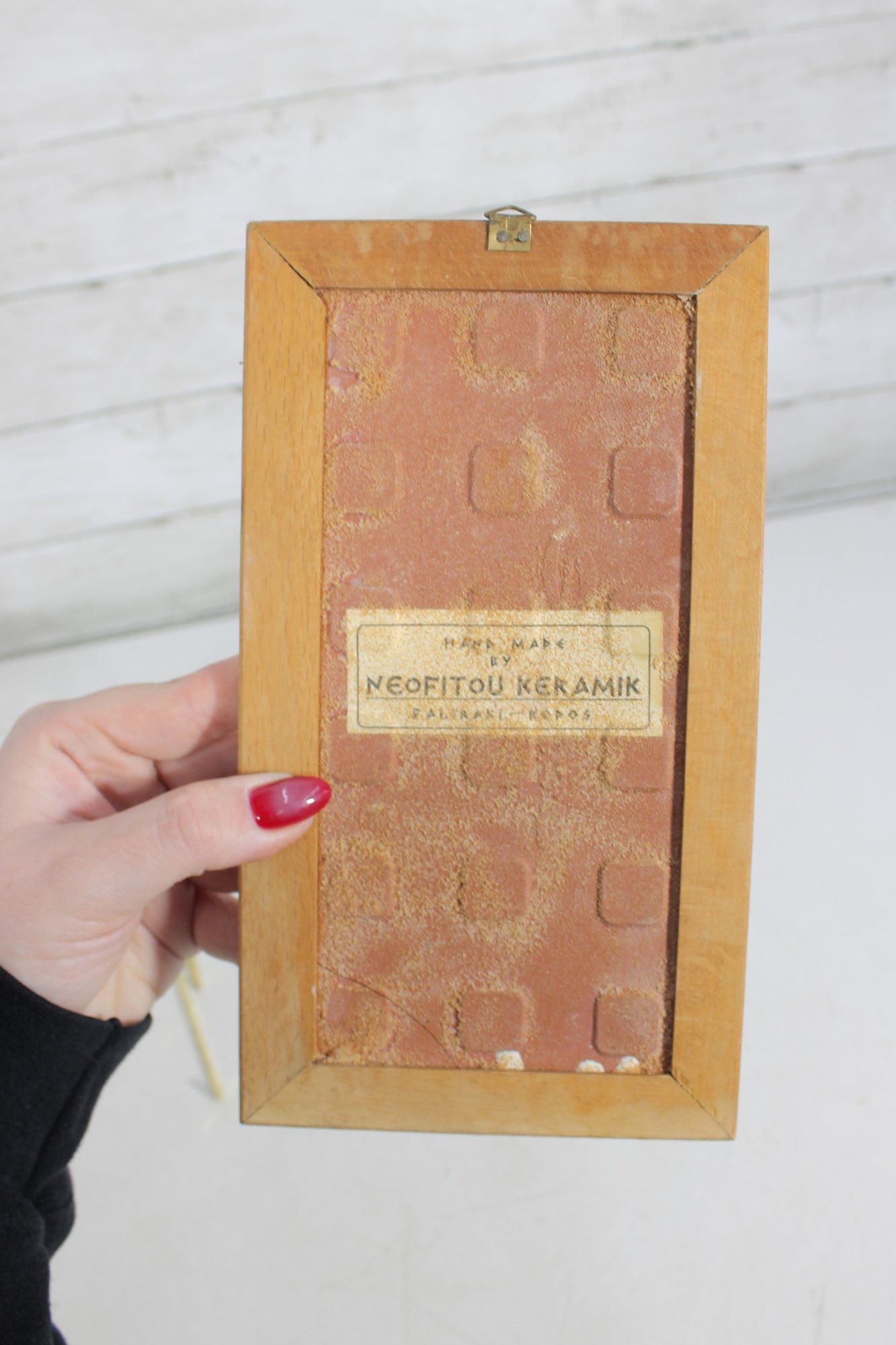 The tile is mounted in a simple wooden frame and retains its original maker’s label on the reverse reading “Neofitou Keramik.” The artwork reflects traditional Greek folk-art influences with a playful, modern decorative style.