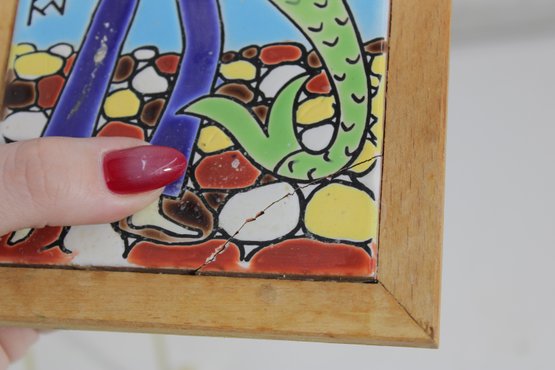 There is a visible crack to the tile (see photos), but the piece remains stable within the frame. Otherwise, light wear consistent with age.