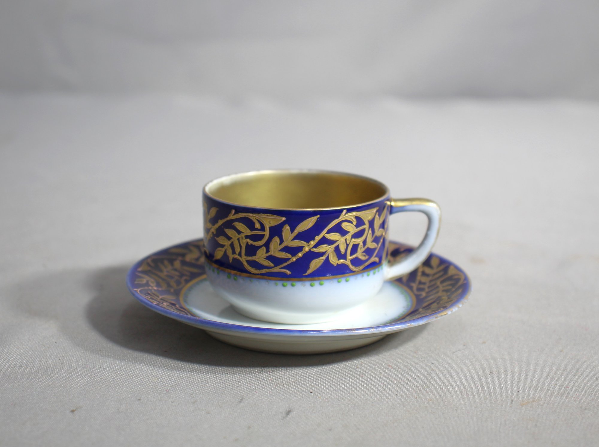 The teacup is enveloped in a deep cobalt blue, a color historically associated with royalty and opulence. Adorning the exterior are hand-painted gold laurel leaves, a symbol of victory and honor, adding to the cup's aristocratic presence. The interior's rich gold wash offers a striking contrast, providing an unexpected flash of brilliance with every sip...