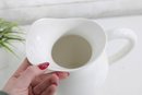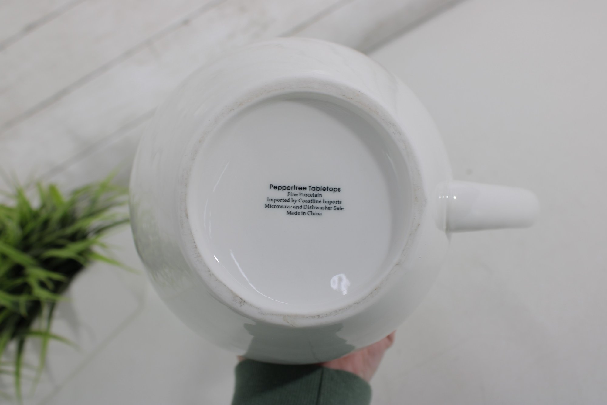 Clean and modern Peppertree Tabletops white ceramic pitcher, measuring approximately 10 inches tall. This versatile piece features a smooth, glossy finish with a simple yet elegant silhouette, including a gently curved spout and comfortable handle.