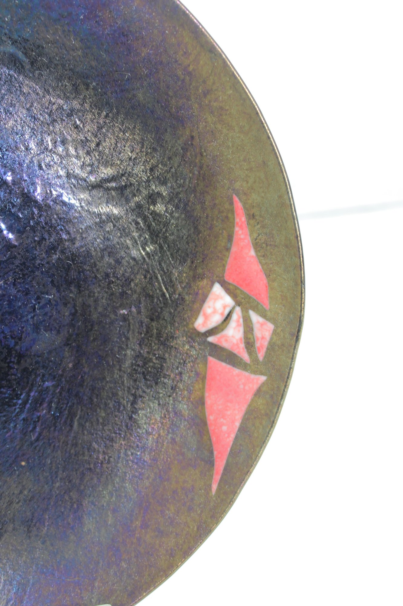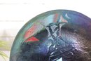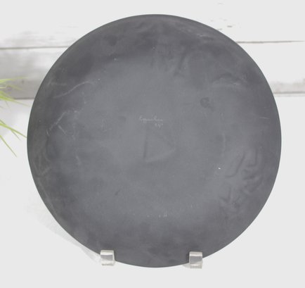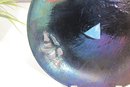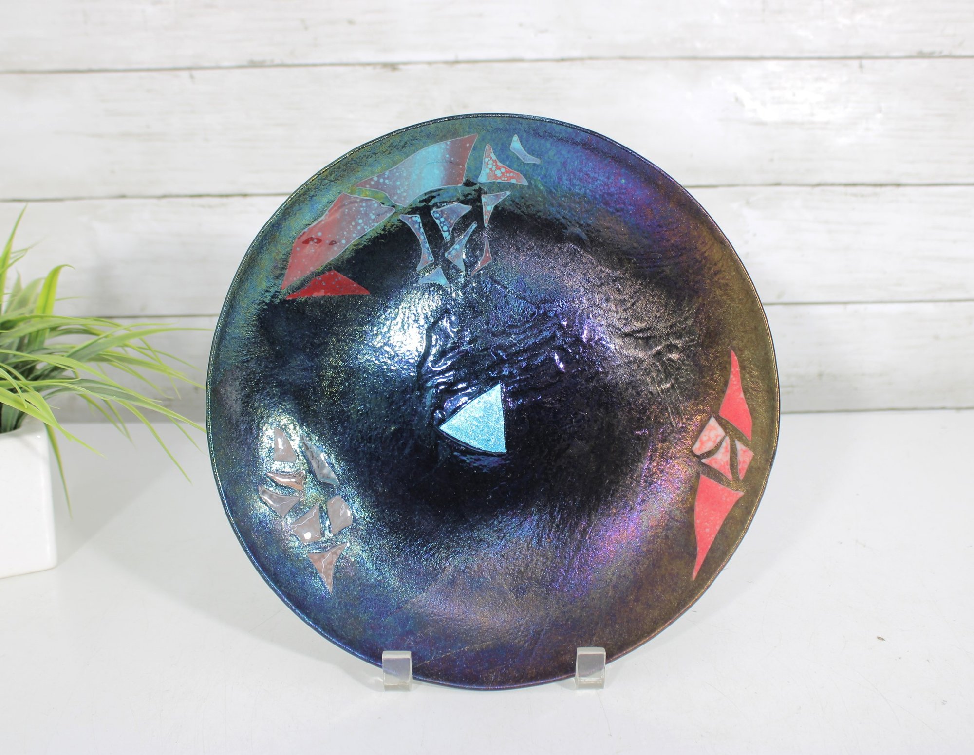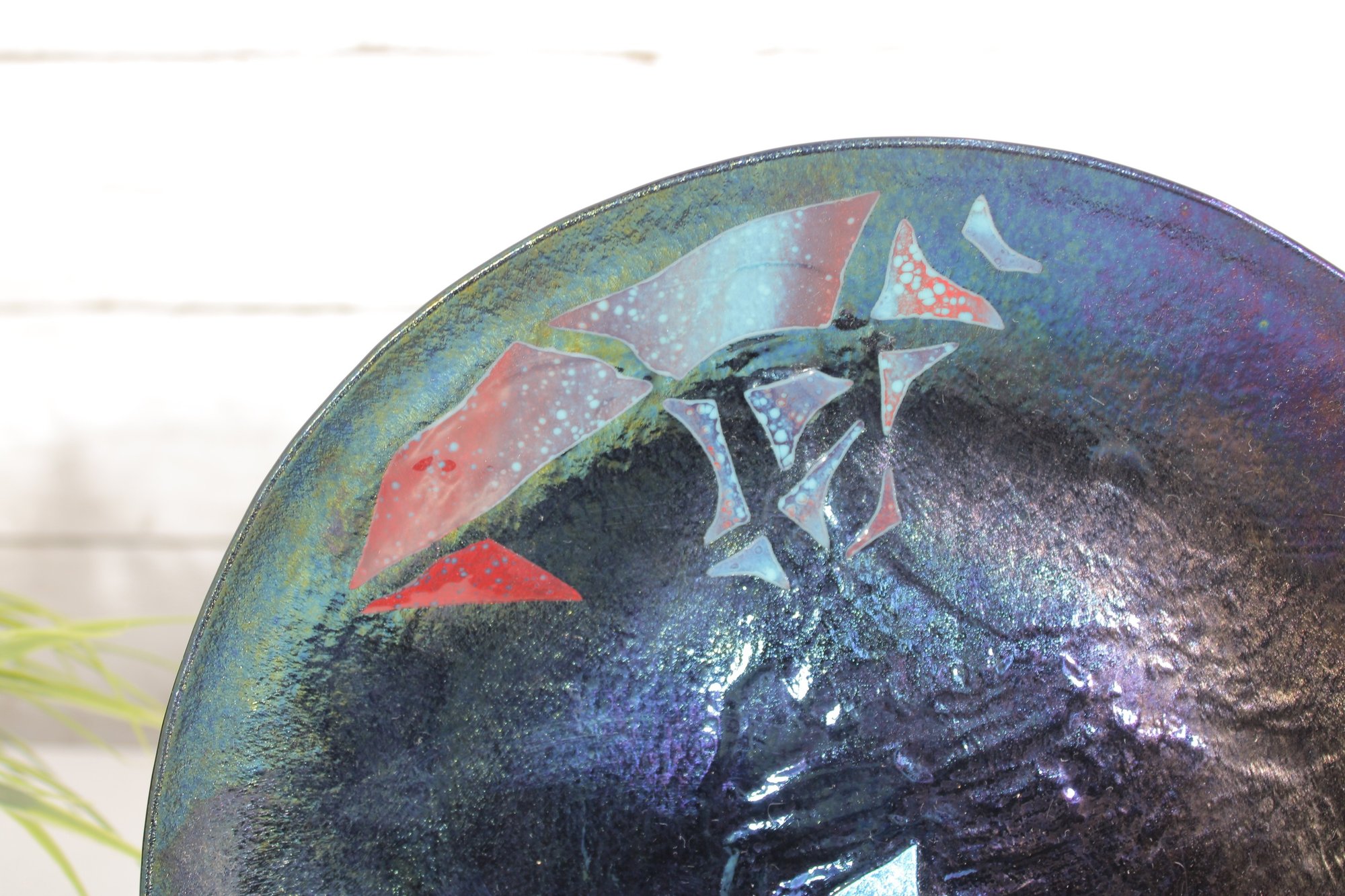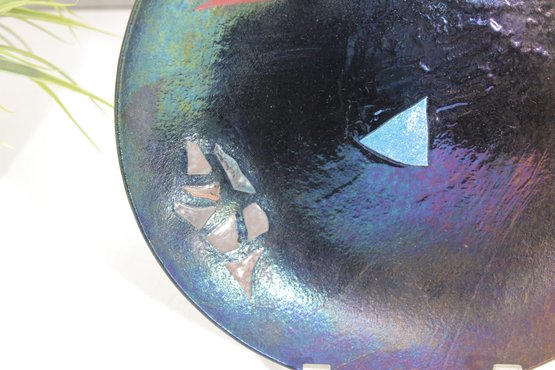 Striking studio art pottery plate by Equihua, signed on the reverse and dated 1994. This 10-inch round piece features a dramatic iridescent surface with deep metallic tones shifting between purple, blue, and black, accented by abstract geometric inlays in vibrant colors.