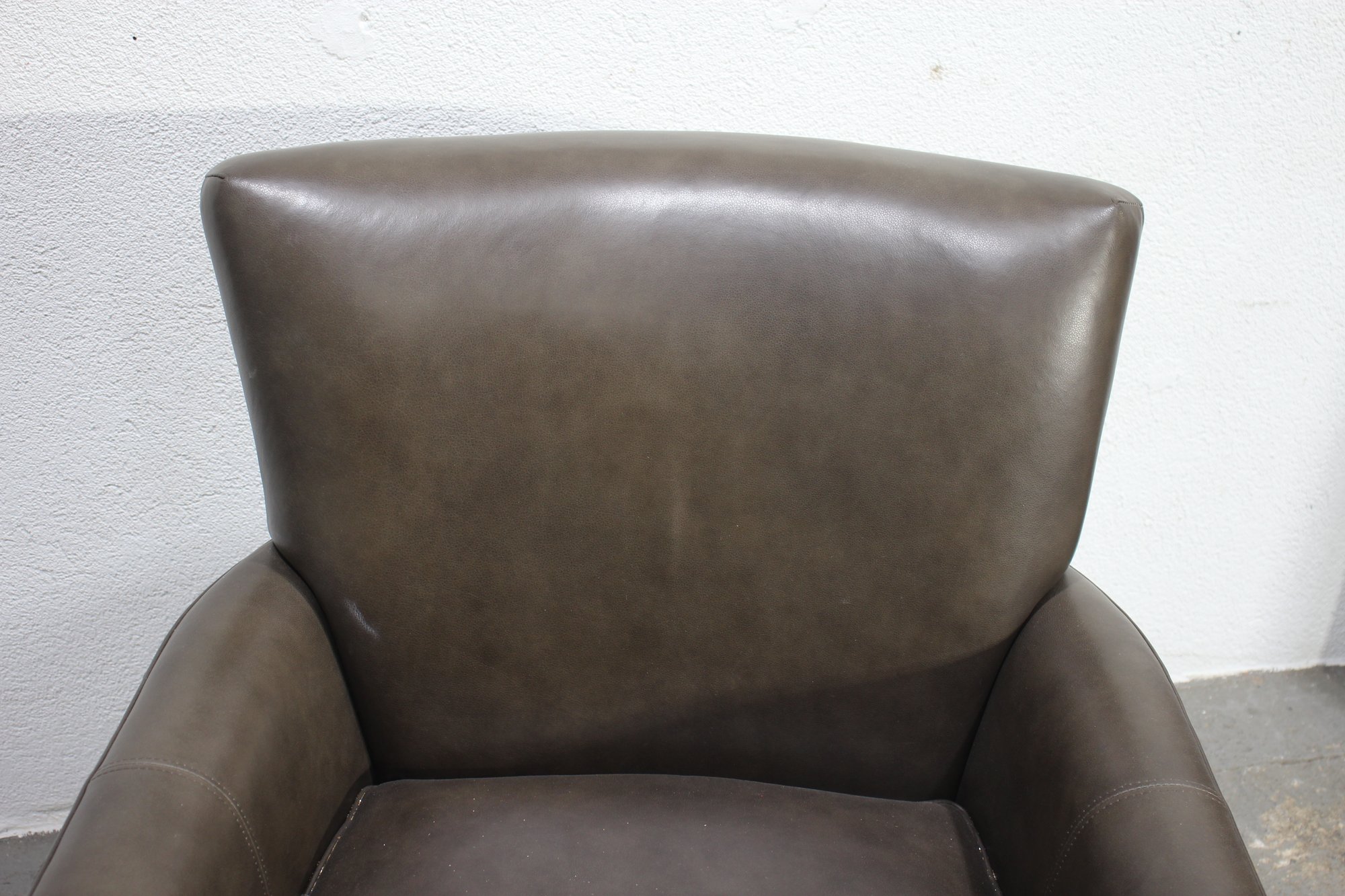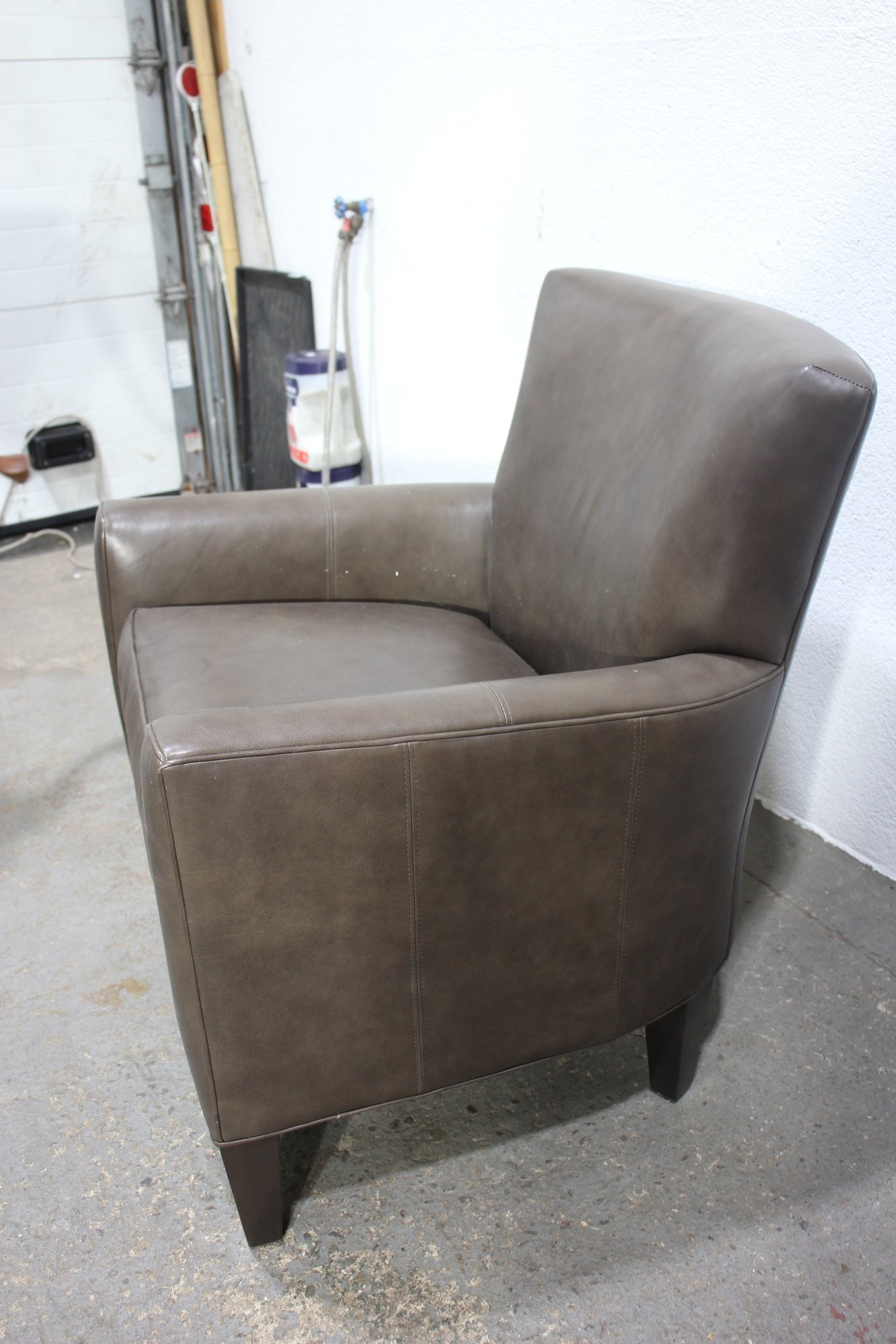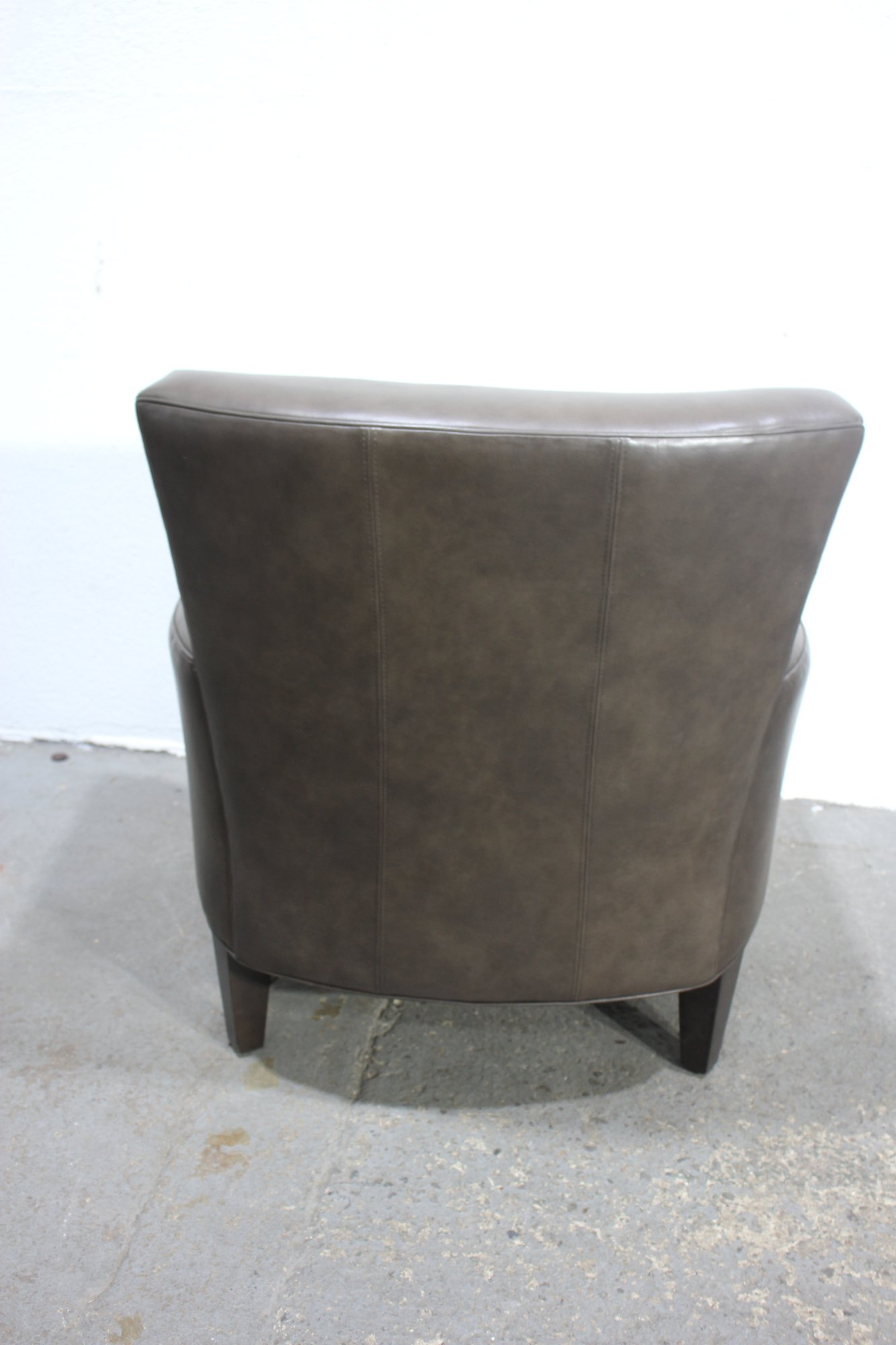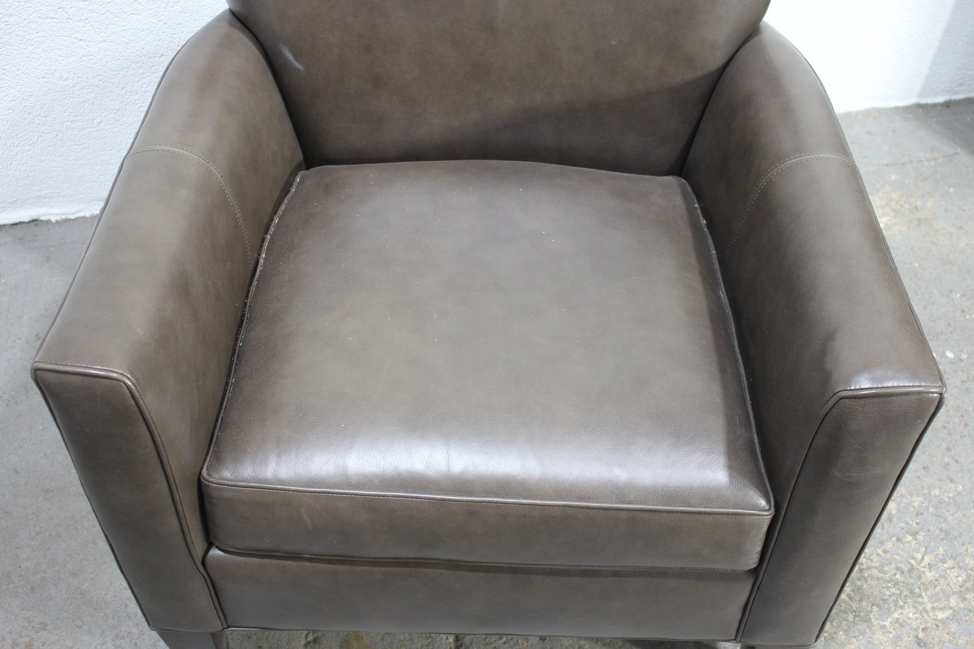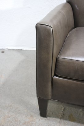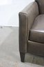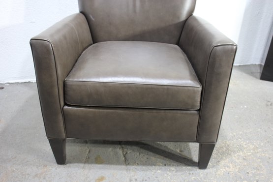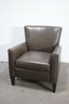 a luxurious Ethan Allen genuine leather club chair, perfect for adding a touch of sophistication and comfort to your living space. This modern brown leather armchair features a sleek, minimalist design with clean lines, a comfortable cushioned seat, and slightly tapered wooden legs for a contemporary feel.