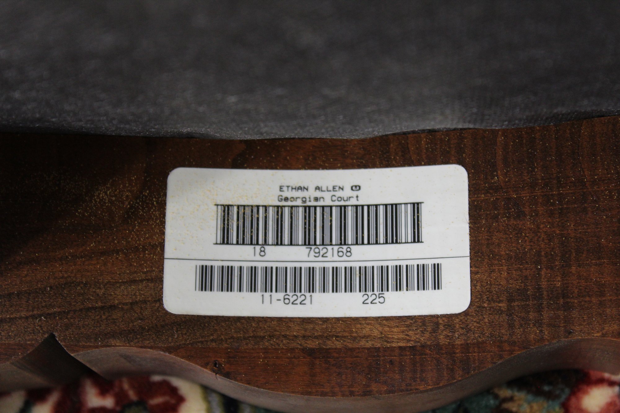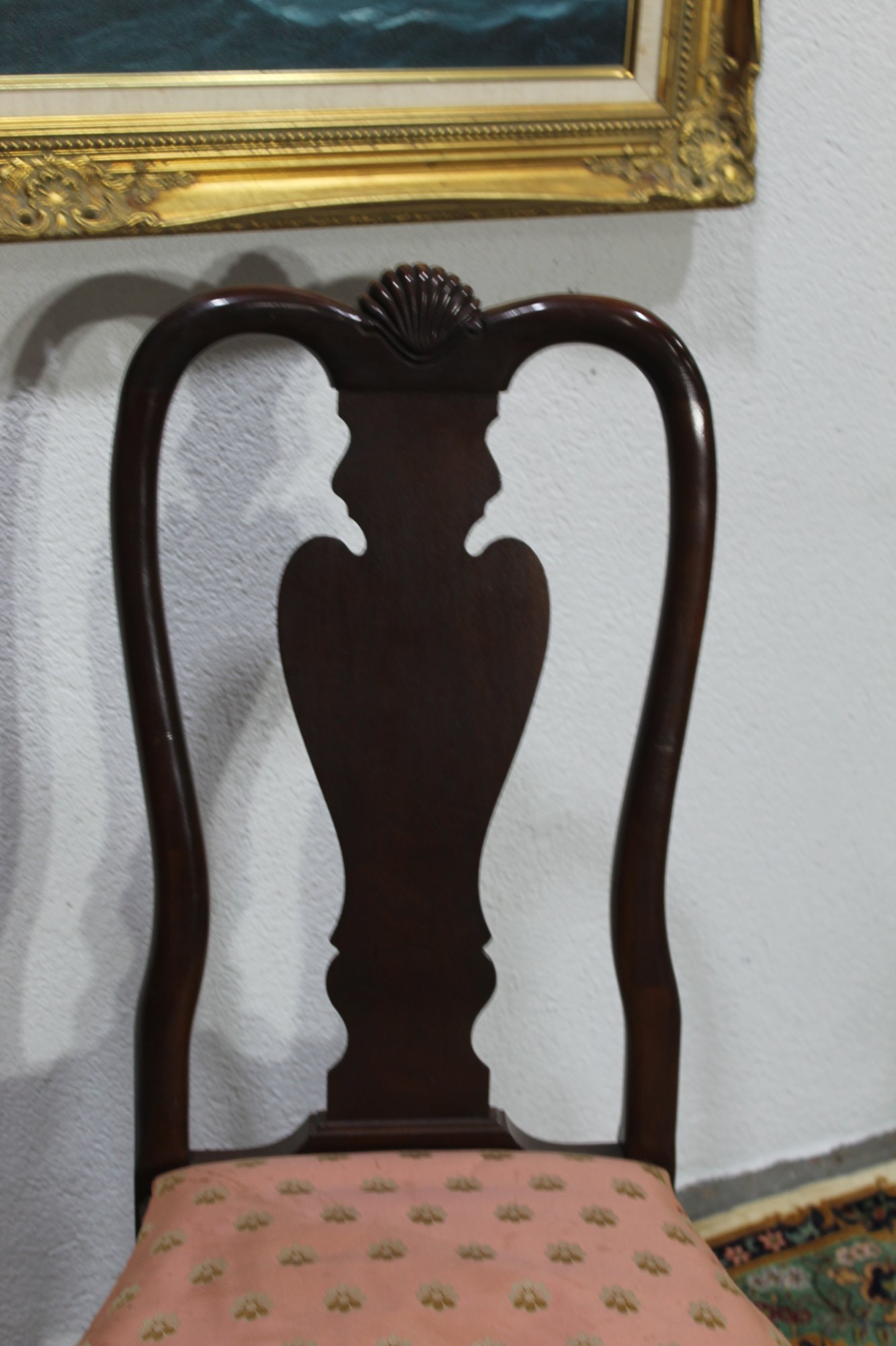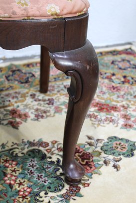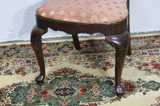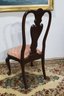 Presenting a timeless Ethan Allen Georgian Court Queen Anne Side Chair, crafted from solid wood with a rich mahogany finish. This elegant piece features a classic Queen Anne style, characterized by a beautifully carved vase-shaped splat back and graceful cabriole legs. The upholstered seat is adorned with a floral patterned fabric in soft peach tones, providing both comfort and sophistication.