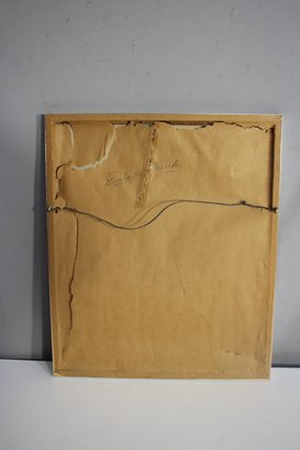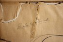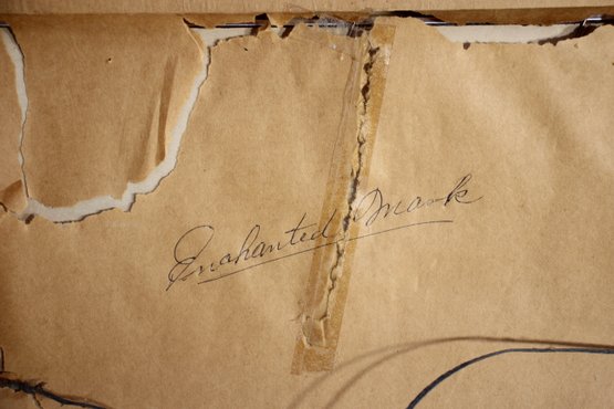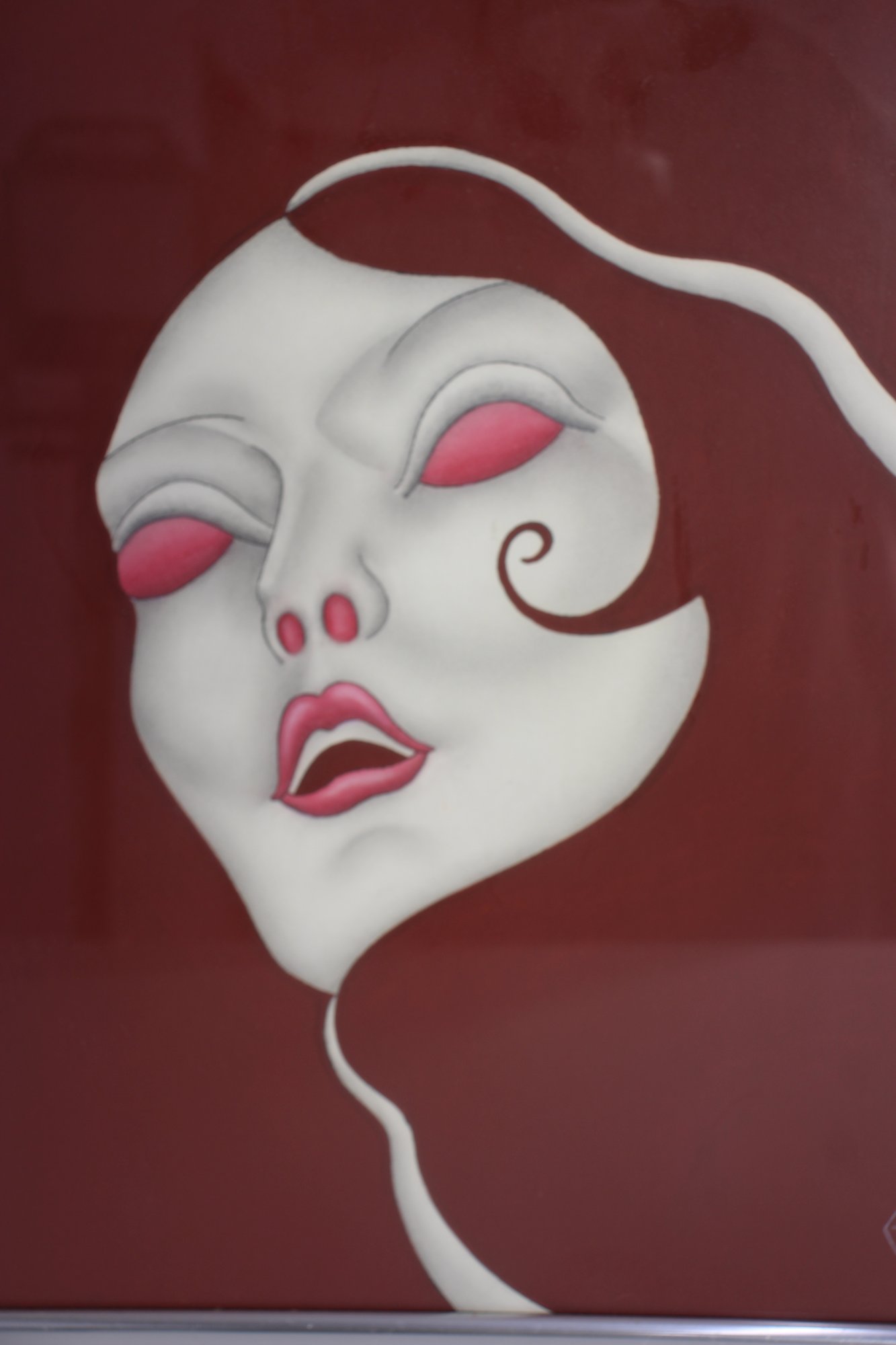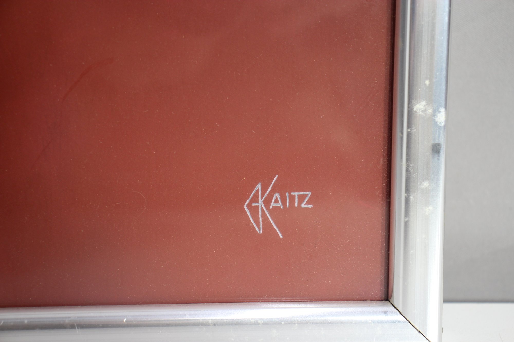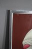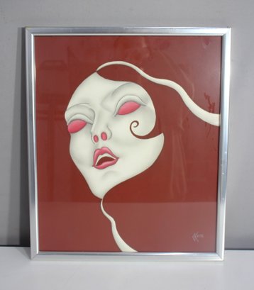 framed artwork by K. Aitz features a surrealist female face with flowing, abstract elements against a deep red background. The expressive composition, enhanced by soft shading and bold contrast, evokes a dreamlike, ethereal quality. The piece is encased in a sleek silver-tone metal frame, preserving its original mid-century modern aesthetic. The back bears the handwritten inscription "Enchanted Mask," adding a personal or thematic touch. Perfect for collectors of surrealist or contemporary art, this unique work will add an air of mystery and elegance to any space.
