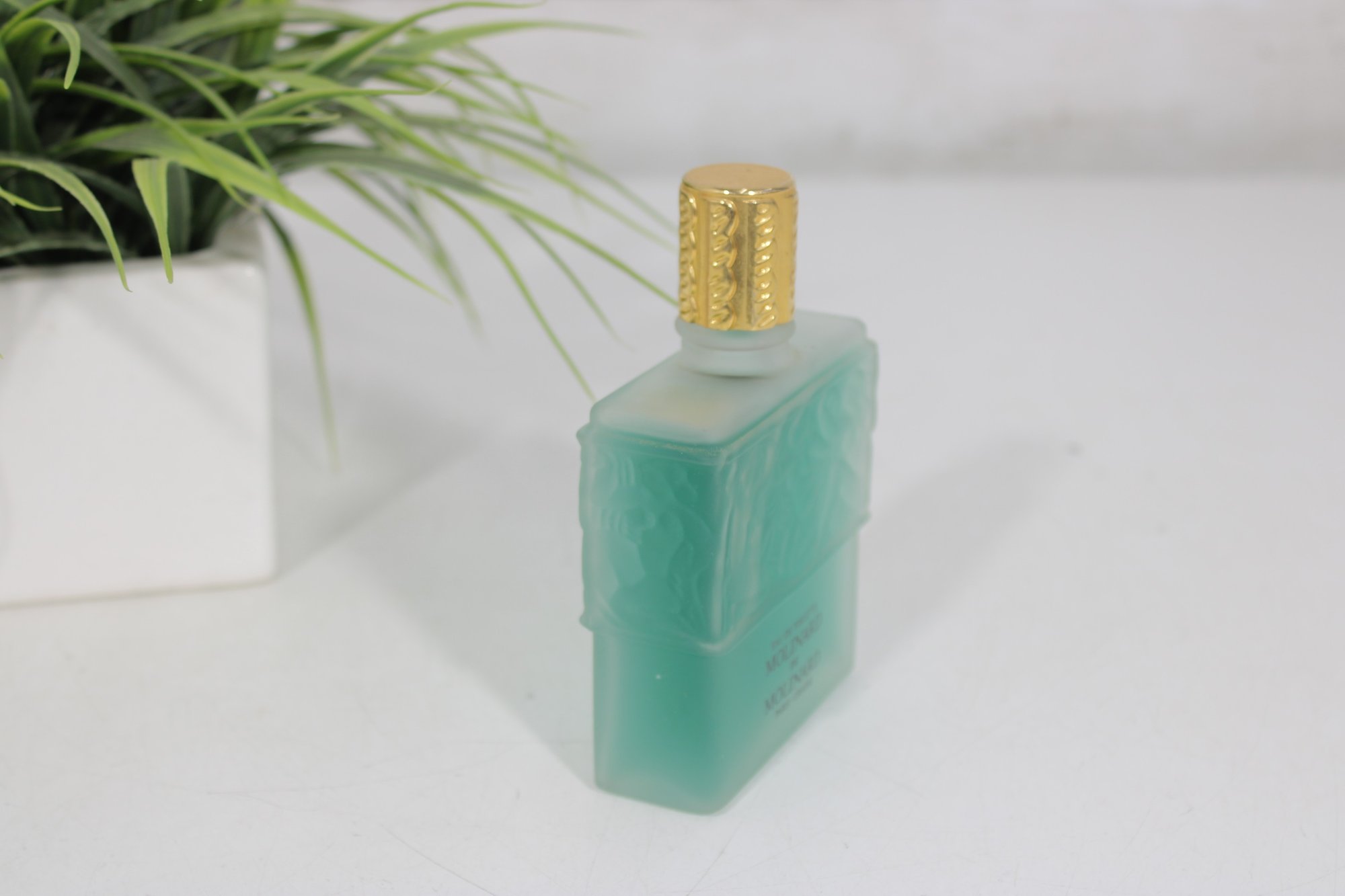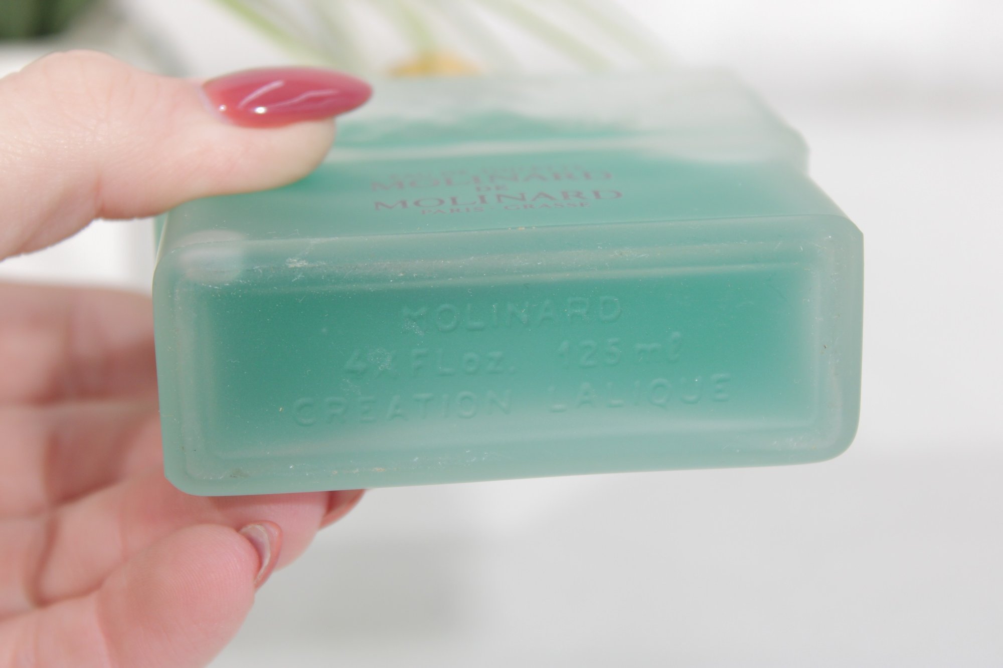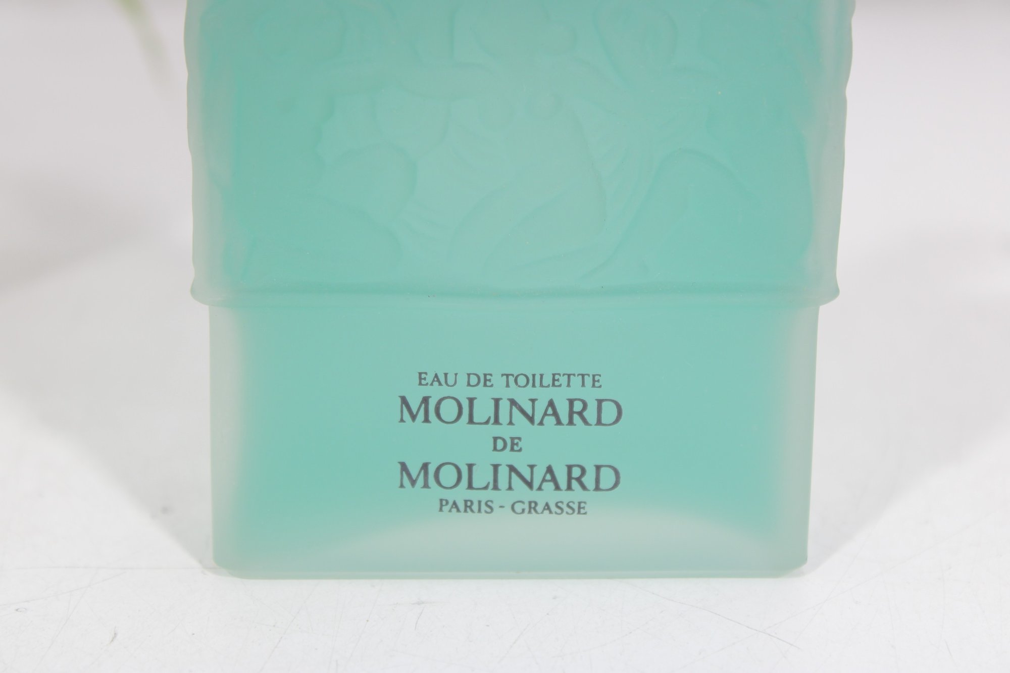 This elegant frosted glass bottle features raised decorative detailing and a gold-tone cap, showcasing the refined craftsmanship associated with Lalique design. A stunning presentation piece that blends fine French perfumery with art glass aesthetics.