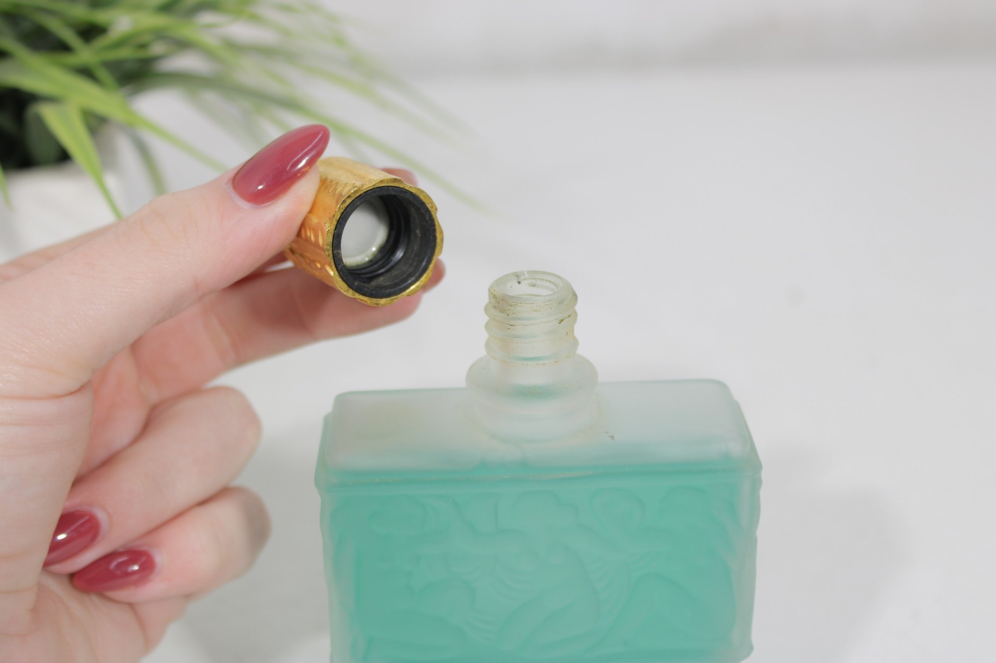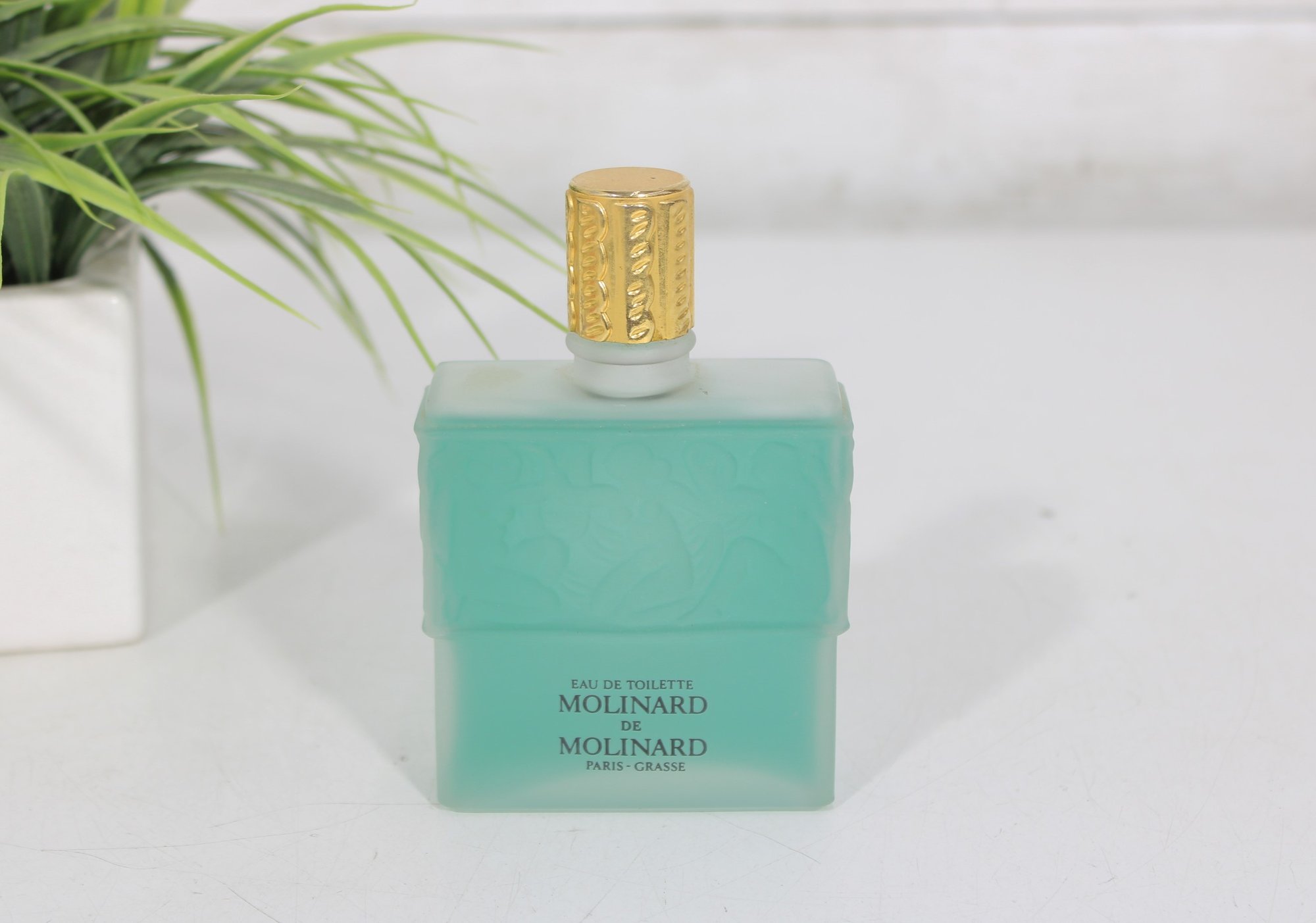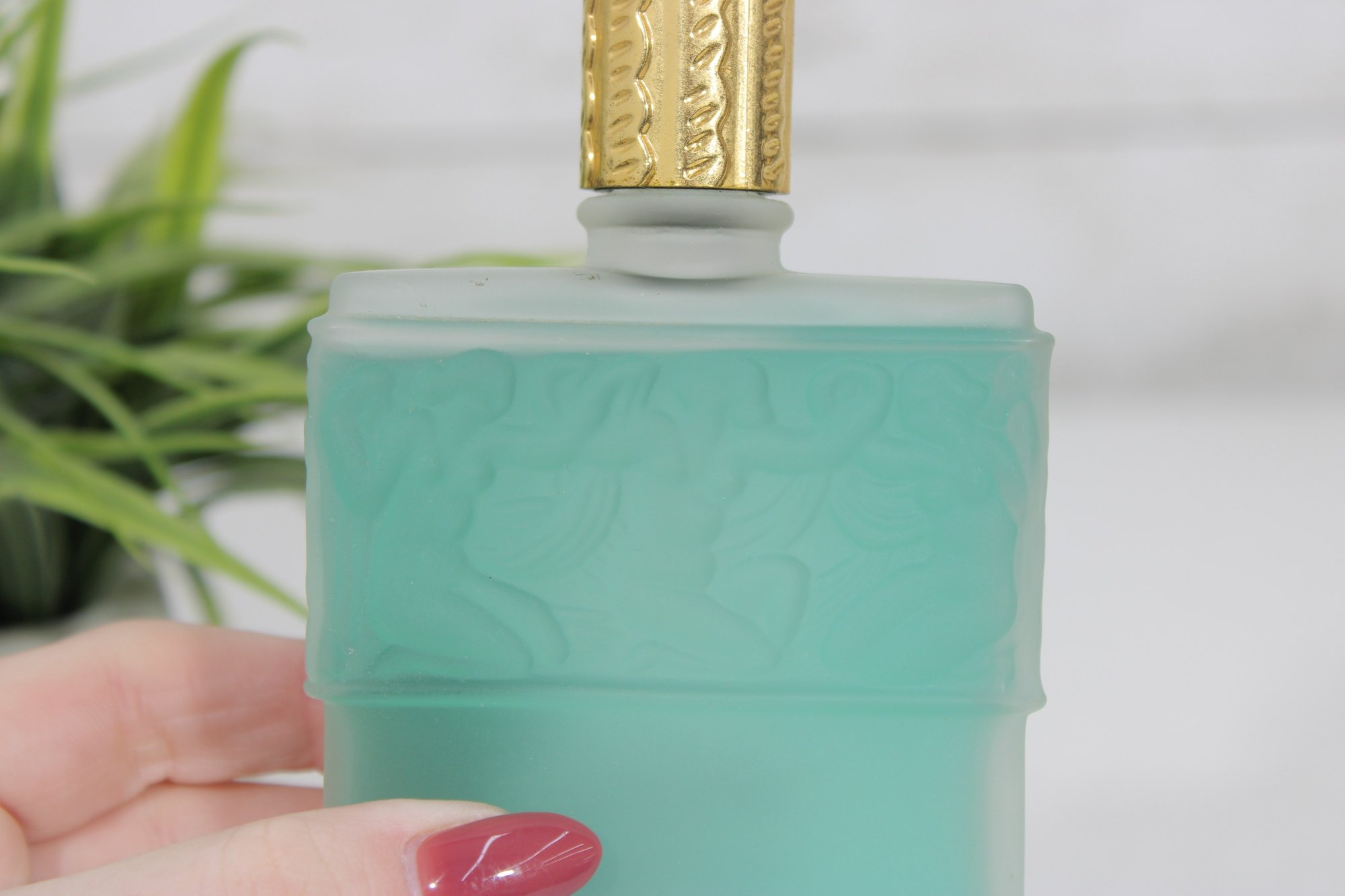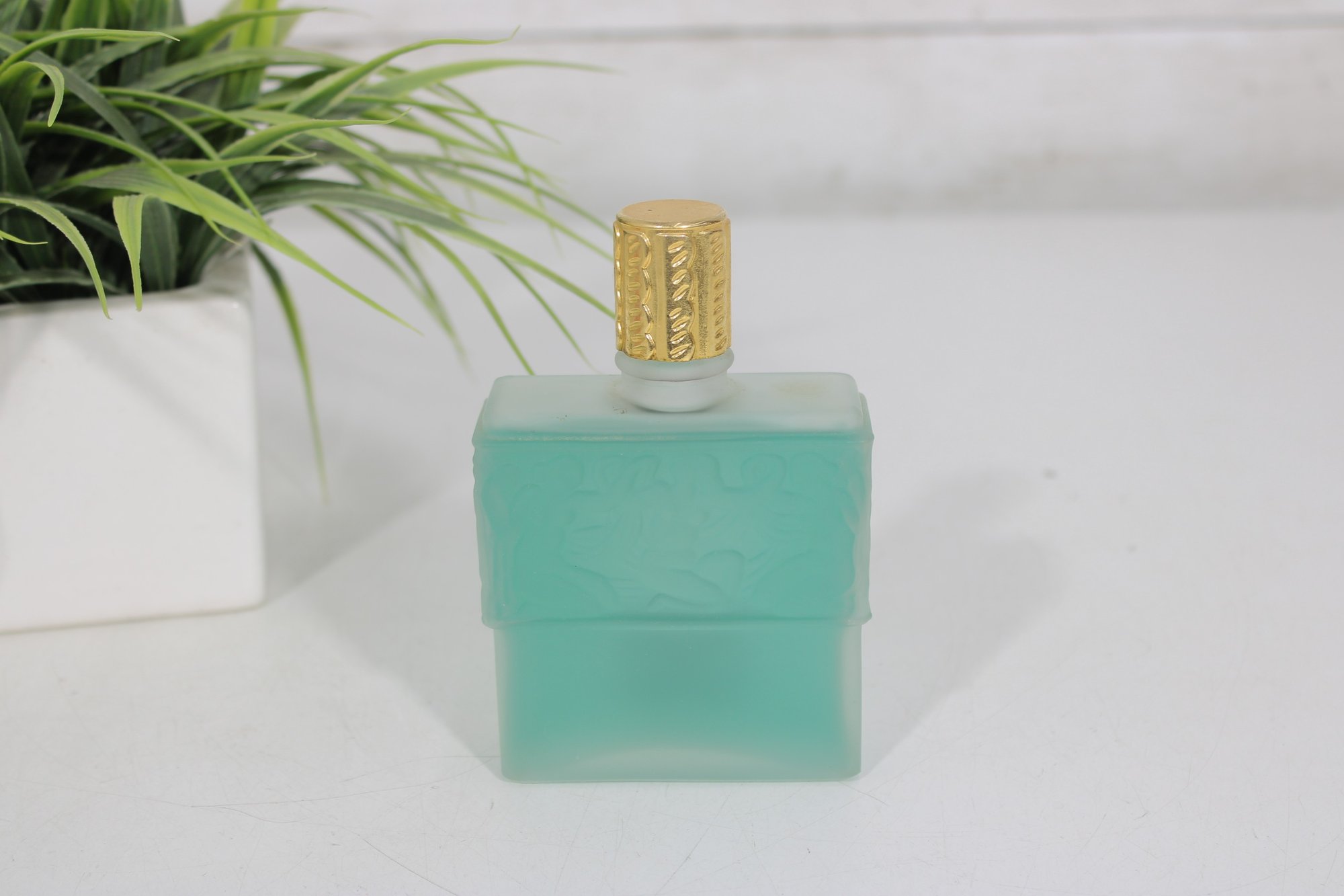 This elegant frosted glass bottle features raised decorative detailing and a gold-tone cap, showcasing the refined craftsmanship associated with Lalique design. A stunning presentation piece that blends fine French perfumery with art glass aesthetics.