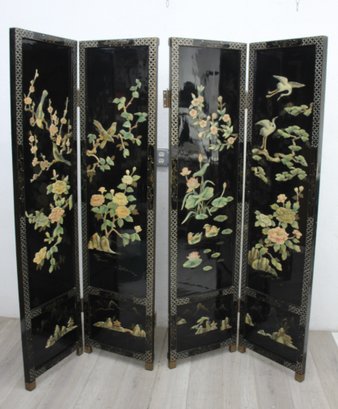 An elegant Chinese lacquer folding screen, featuring four panels adorned with intricate hand-painted designs of cranes, flowers, and delicate foliage. The artwork is skillfully inlaid and highlighted with gold accents, adding a luxurious touch to the overall design. Each panel showcases a beautiful scene inspired by nature, capturing the grace of birds in flight and floral motifs. The frame is crafted with a geometric pattern that enhances the overall visual appeal, and the reverse side features a contrasting gold floral design. This folding screen can be used as a decorative room divider or a stunning wall piece, adding a touch of sophistication to any interior.