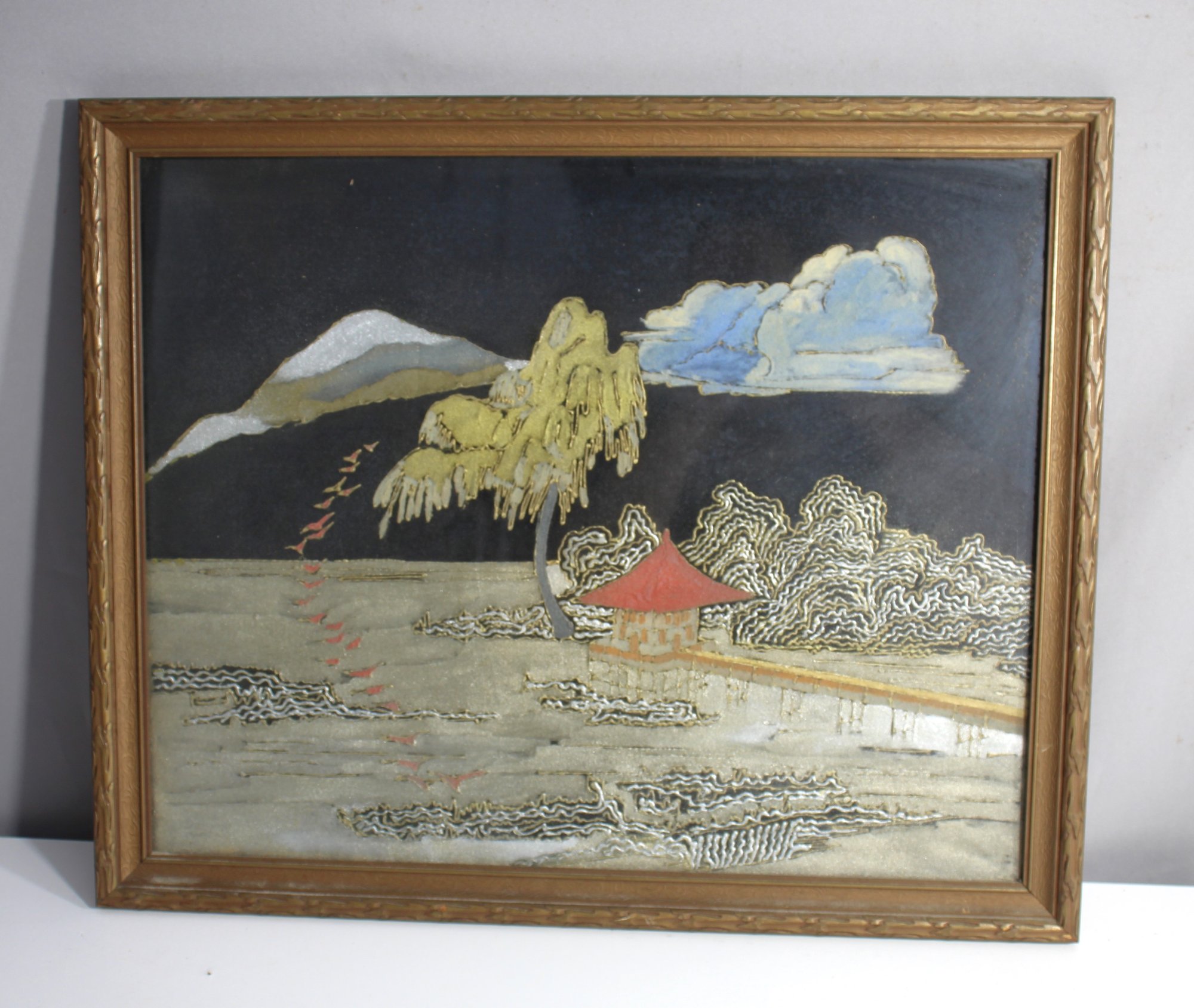 , features a tranquil lakeside view adorned with a willow tree, clouds, and a traditional Eastern structure, possibly a pagoda, under a mountainous backdrop. The delicate brushwork highlights intricate details and textures, creating a vivid tableau that transports viewers into a calming, picturesque setting. The use of gold and muted colors adds a touch of elegance and richness, making it a striking piece for any collector or enthusiast of hand-painted art.