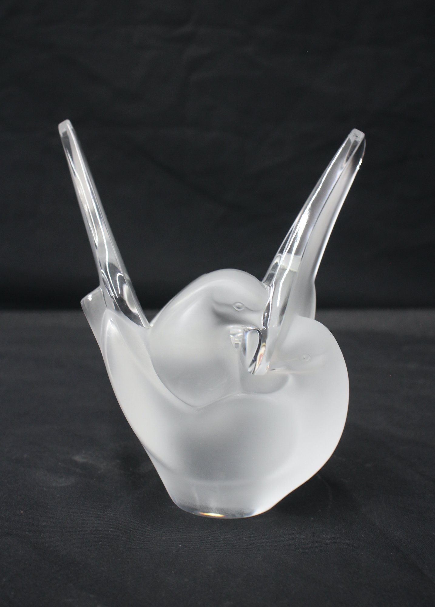 Add timeless elegance to your collection with this stunning Lalique crystal sculpture, "Two Doves." Featuring frosted and clear crystal, this piece beautifully captures the gentle intimacy of two doves entwined. Expertly crafted and signed by Lalique, it reflects the brand's legacy of precision and artistic beauty. This sculpture is perfect for collectors or as a centerpiece for any space. The base is etched with the Lalique hallmark, ensuring authenticity. A wonderful gift or addition to your home decor.