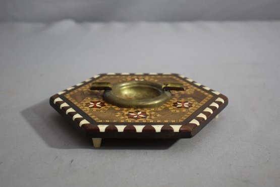 The body of the ashtray is crafted from a rich, deep-toned wood, likely walnut, which has been carefully inlaid with a symphony of geometric patterns. The embellishments include an array of contrasting light and dark woods, along with mother-of-pearl accents that catch the light and draw the eye. Each corner is adorned with a delightful rosette motif, adding a touch of elegance to the piece.