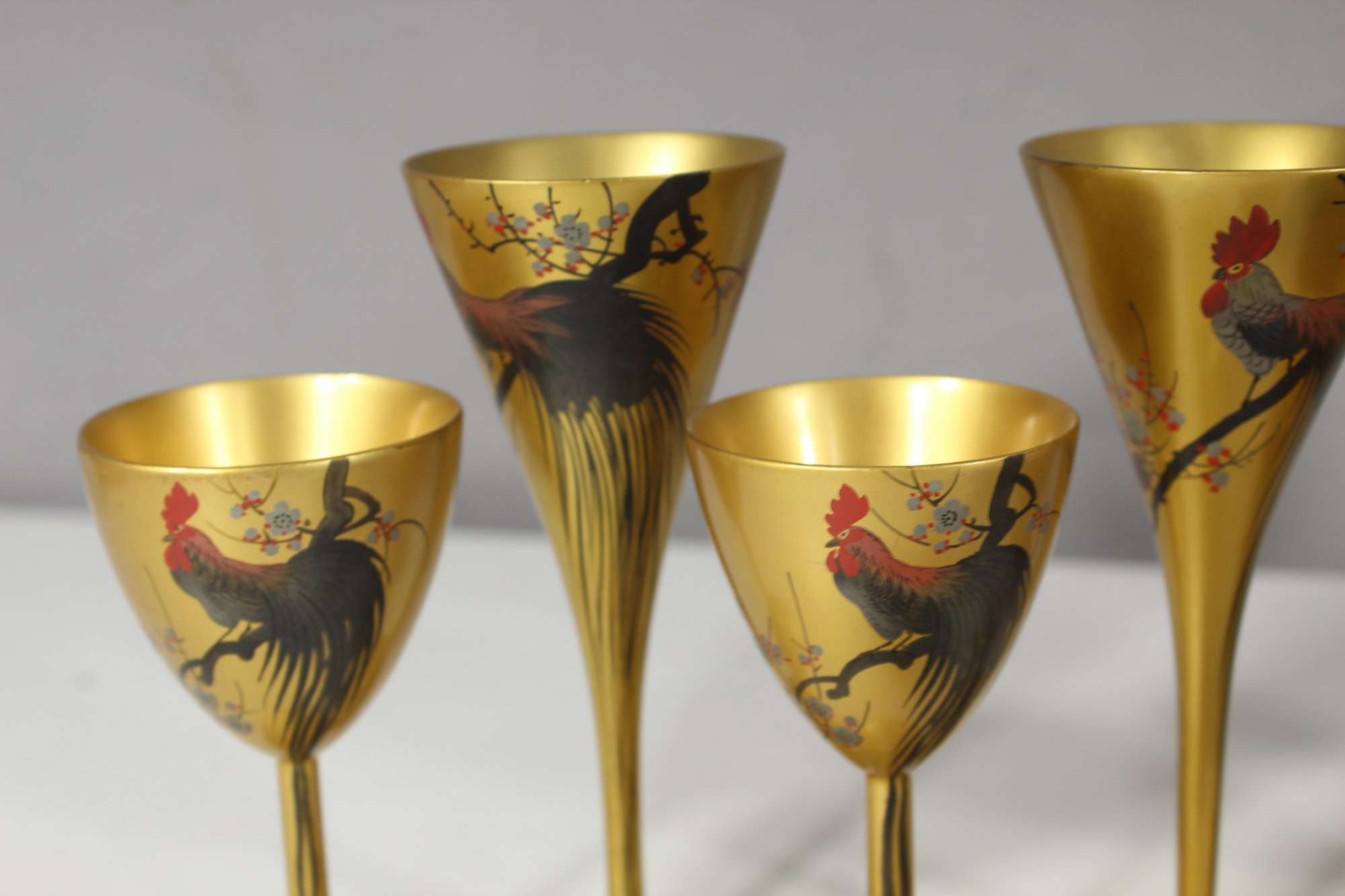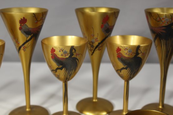 6 Goblets: Golden finish with hand-painted rooster and floral designs.