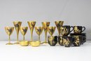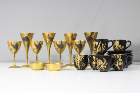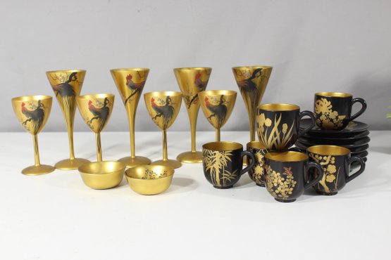 This stunning vintage lacquerware collection features a harmonious blend of tea cups, saucers, goblets, and small bowls, all adorned with intricate hand-painted gold detailing. The vibrant designs showcase roosters, florals, and elegant natural motifs, bringing a touch of sophistication and artistry to any setting.