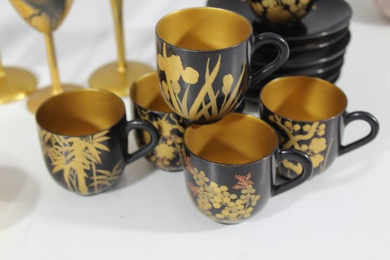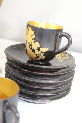 6 Tea Cups with Saucers: Black lacquerware with gold interior and floral decorations.