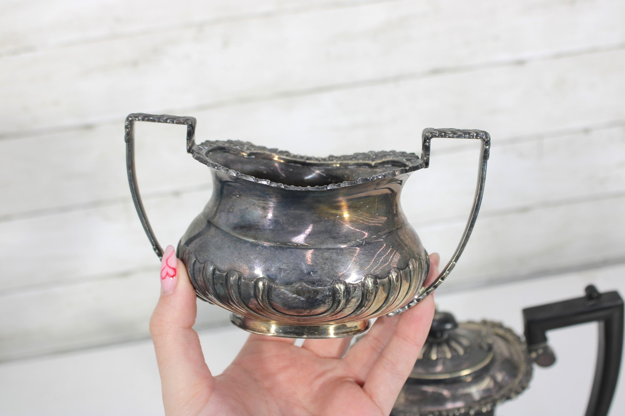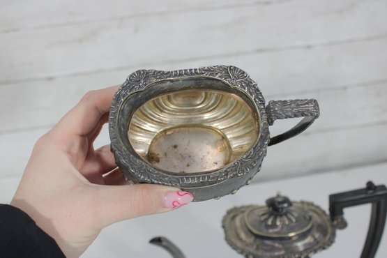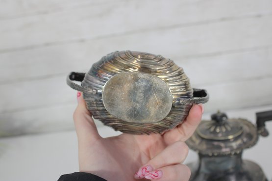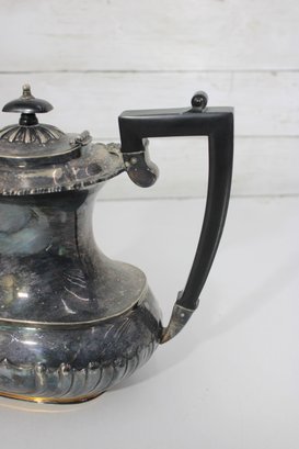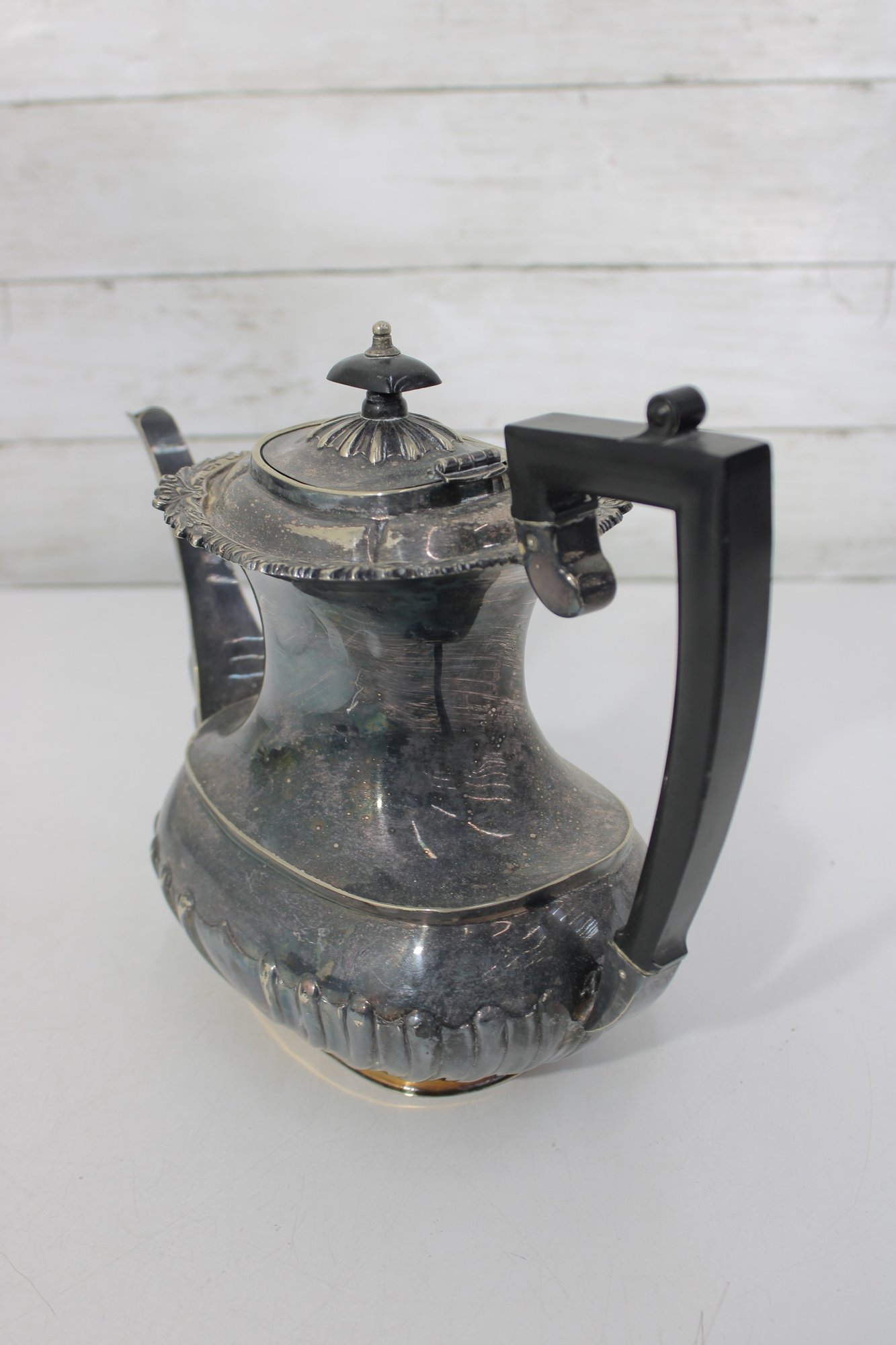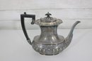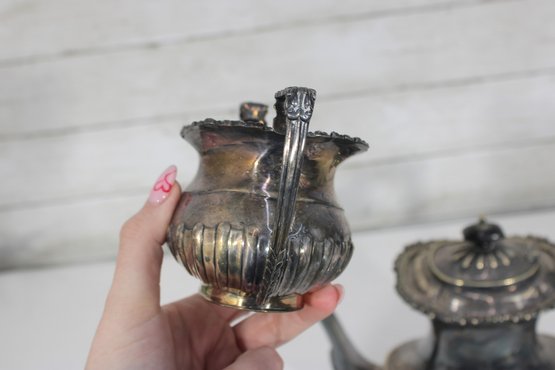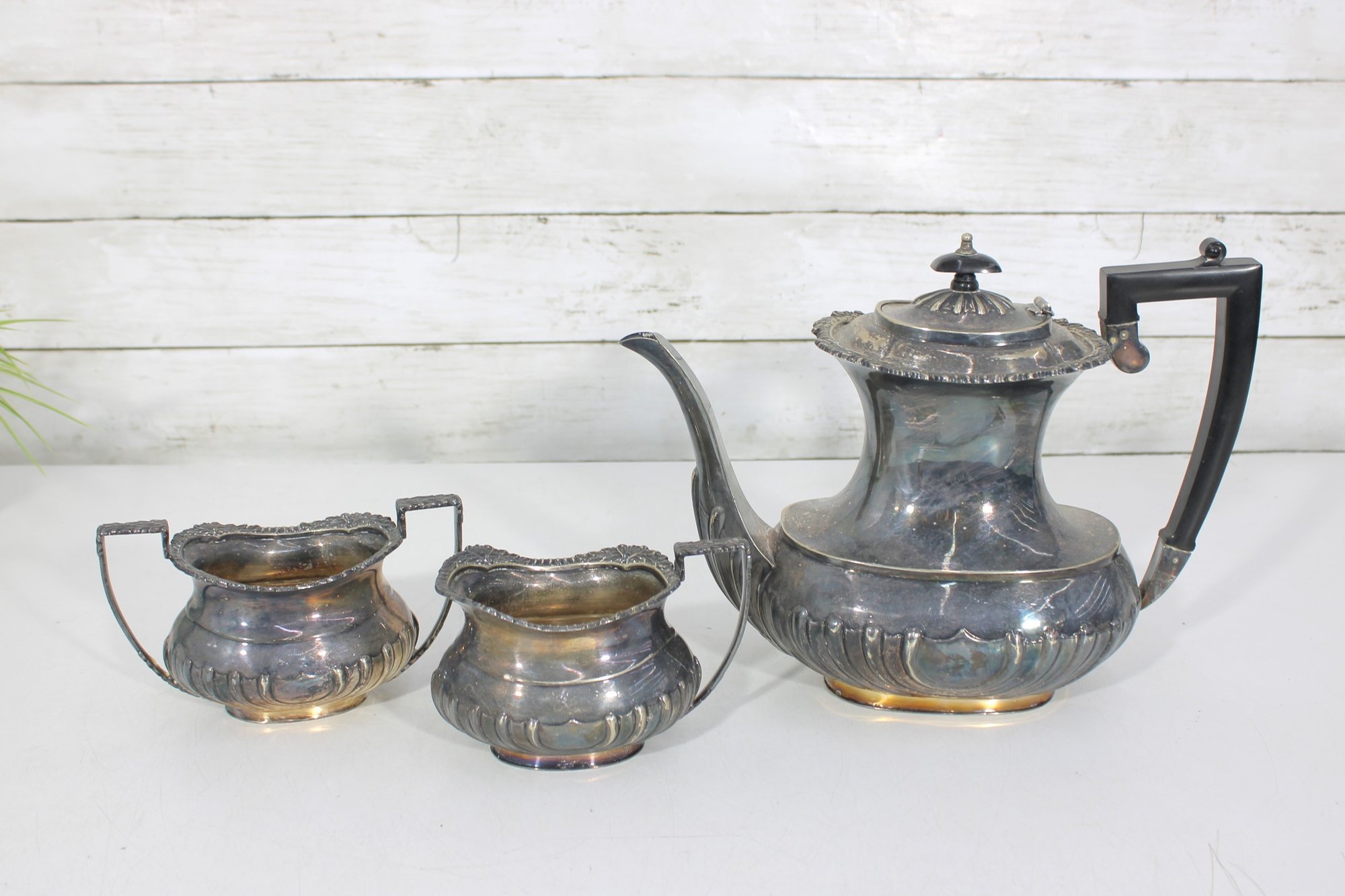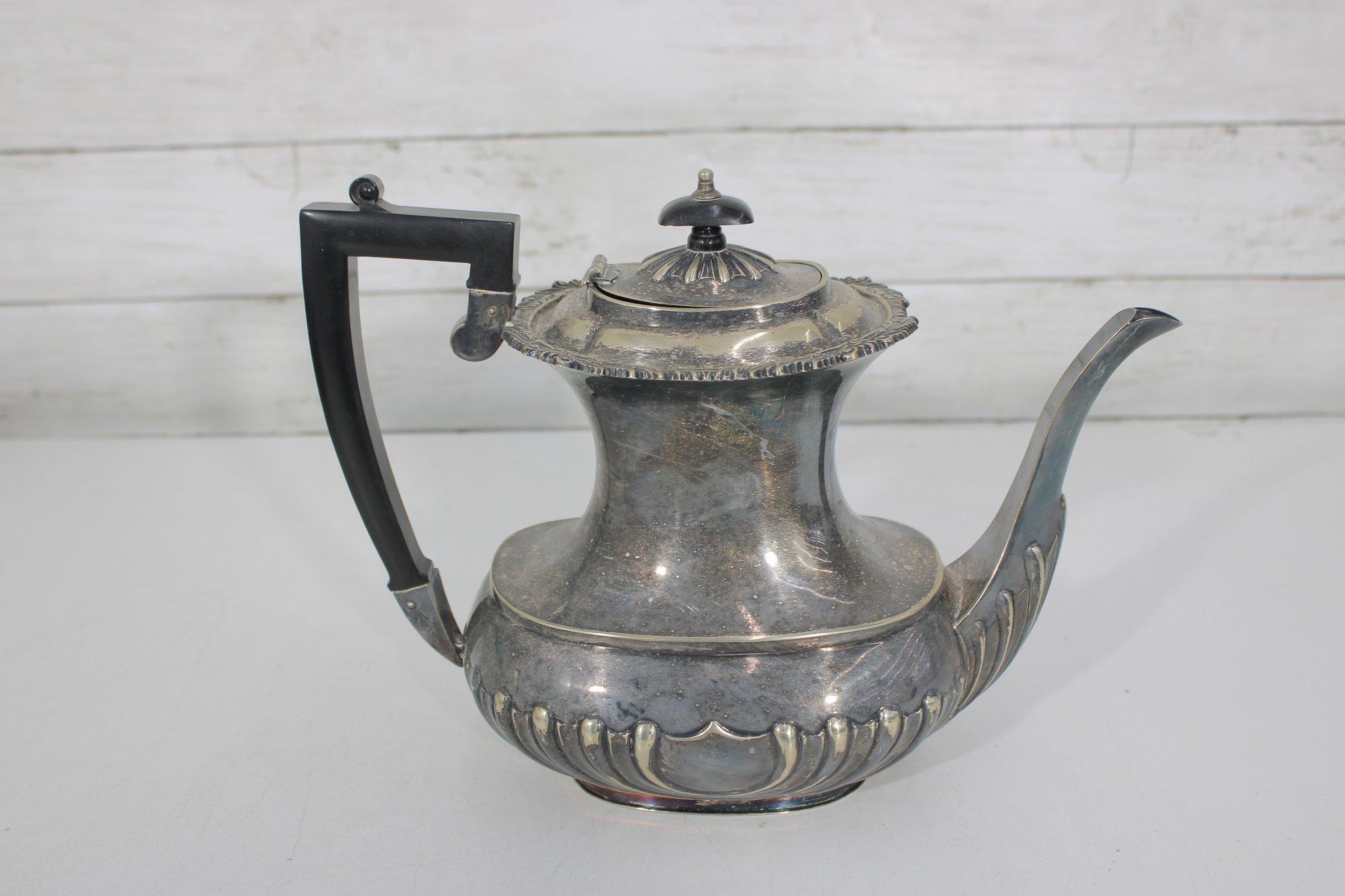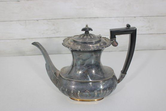Crafted in traditional Sheffield style, the pieces feature elegant scalloped detailing along the lower body, decorative rims, and a timeless rounded form. The teapot has a graceful curved spout, hinged lid, and a black handle for safe and comfortable pouring.