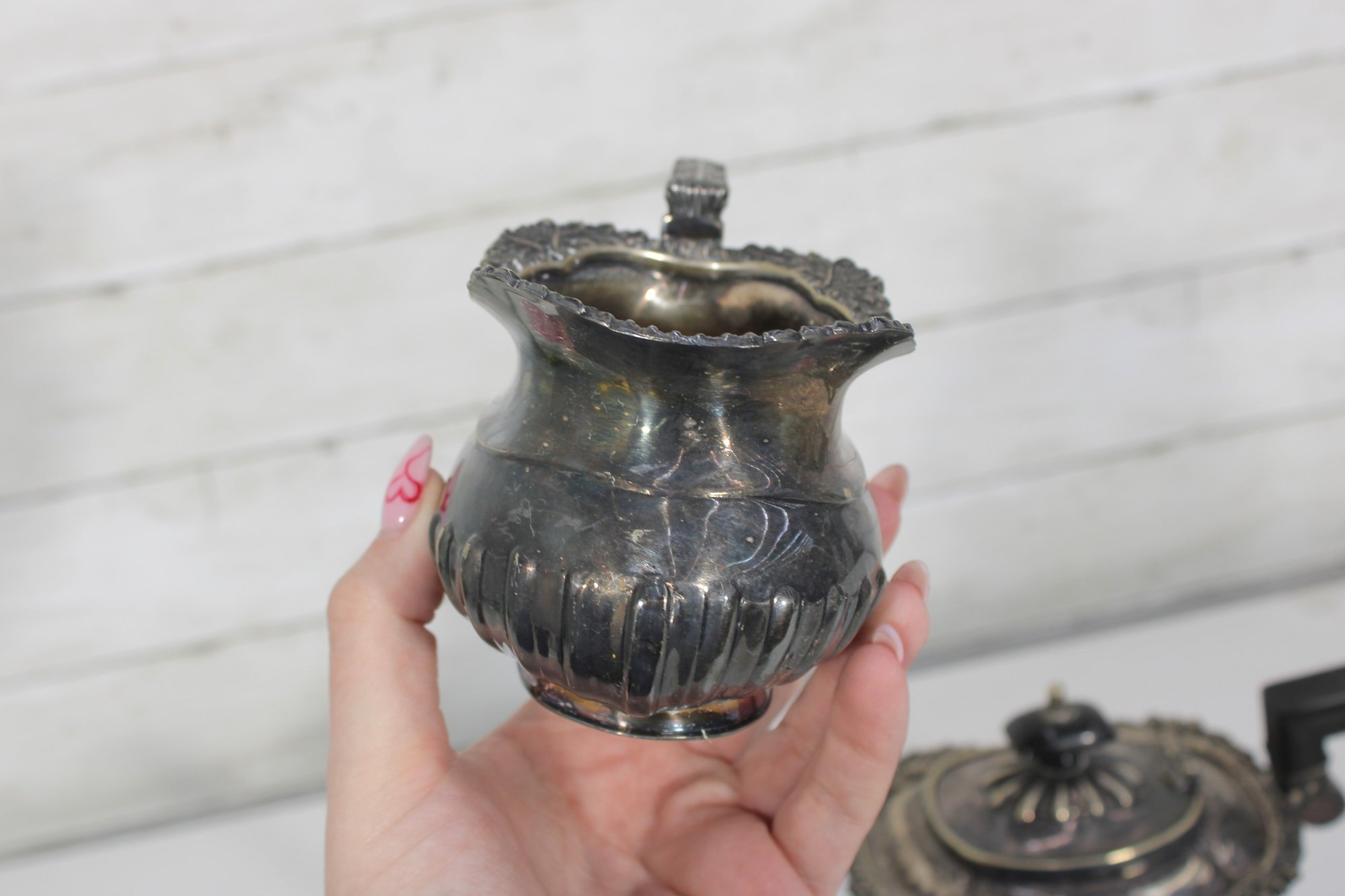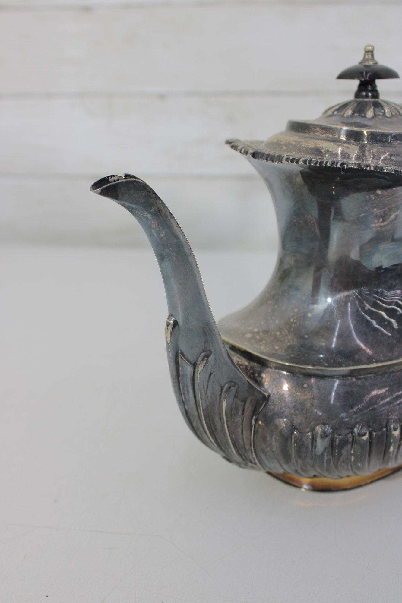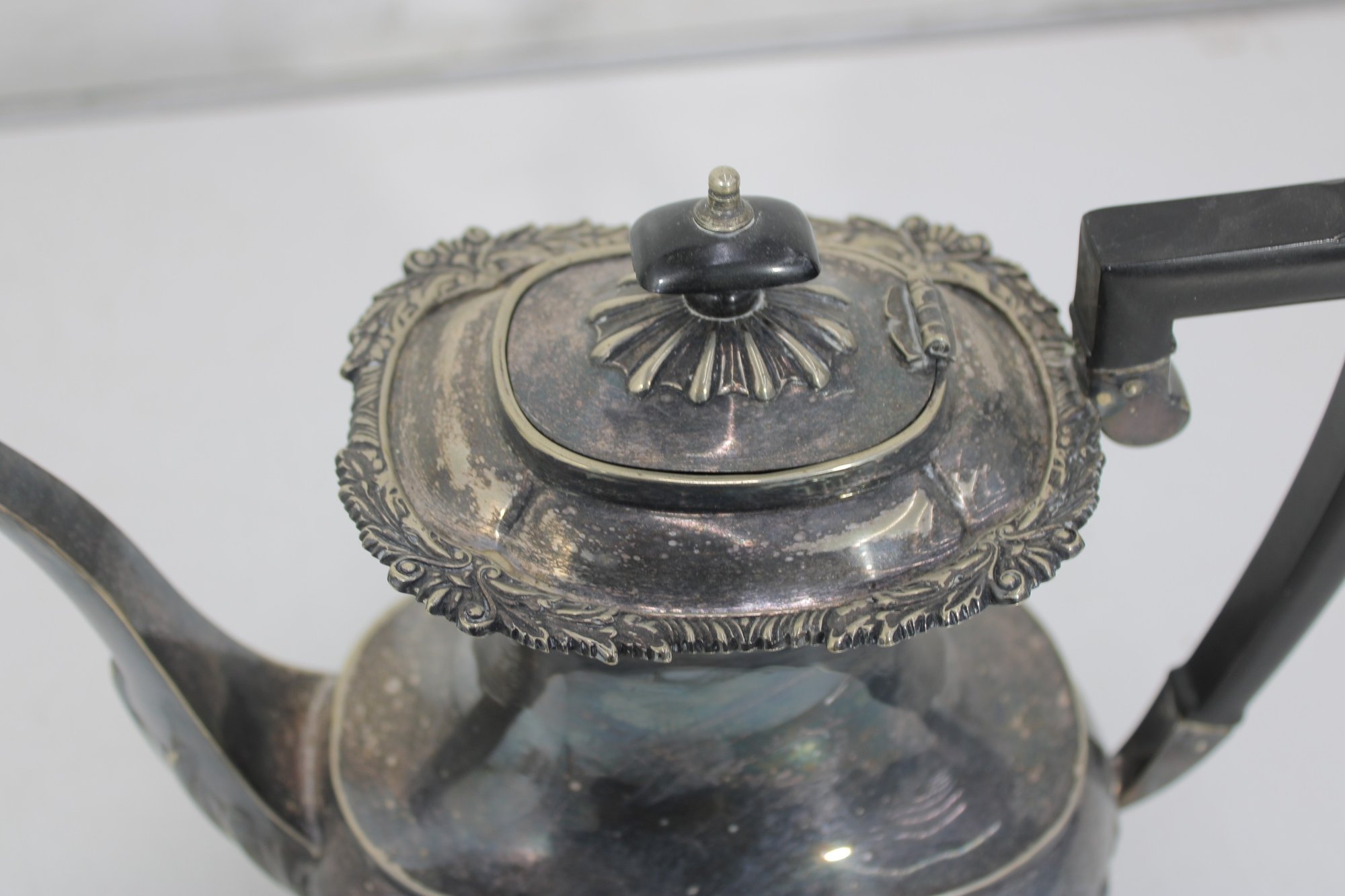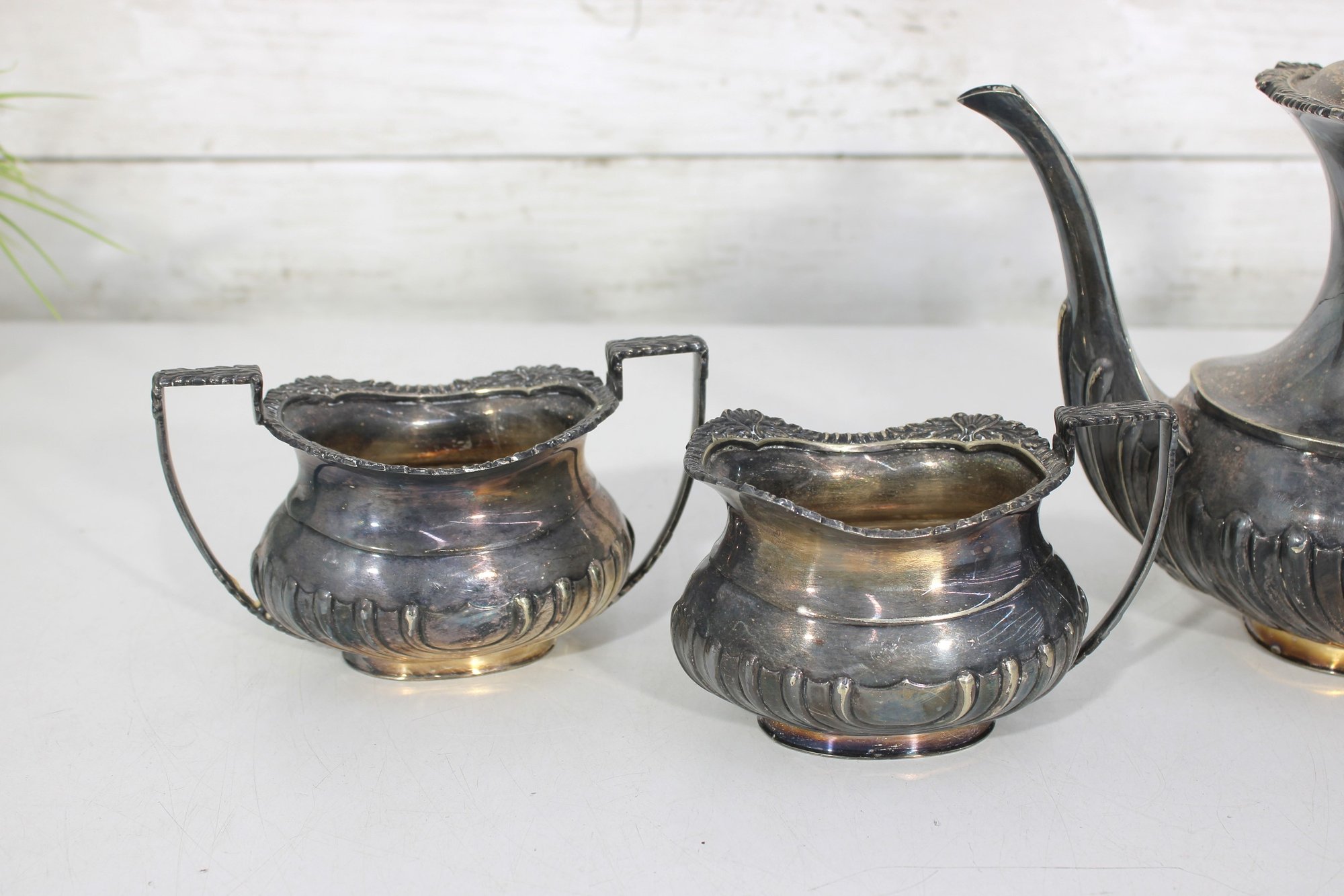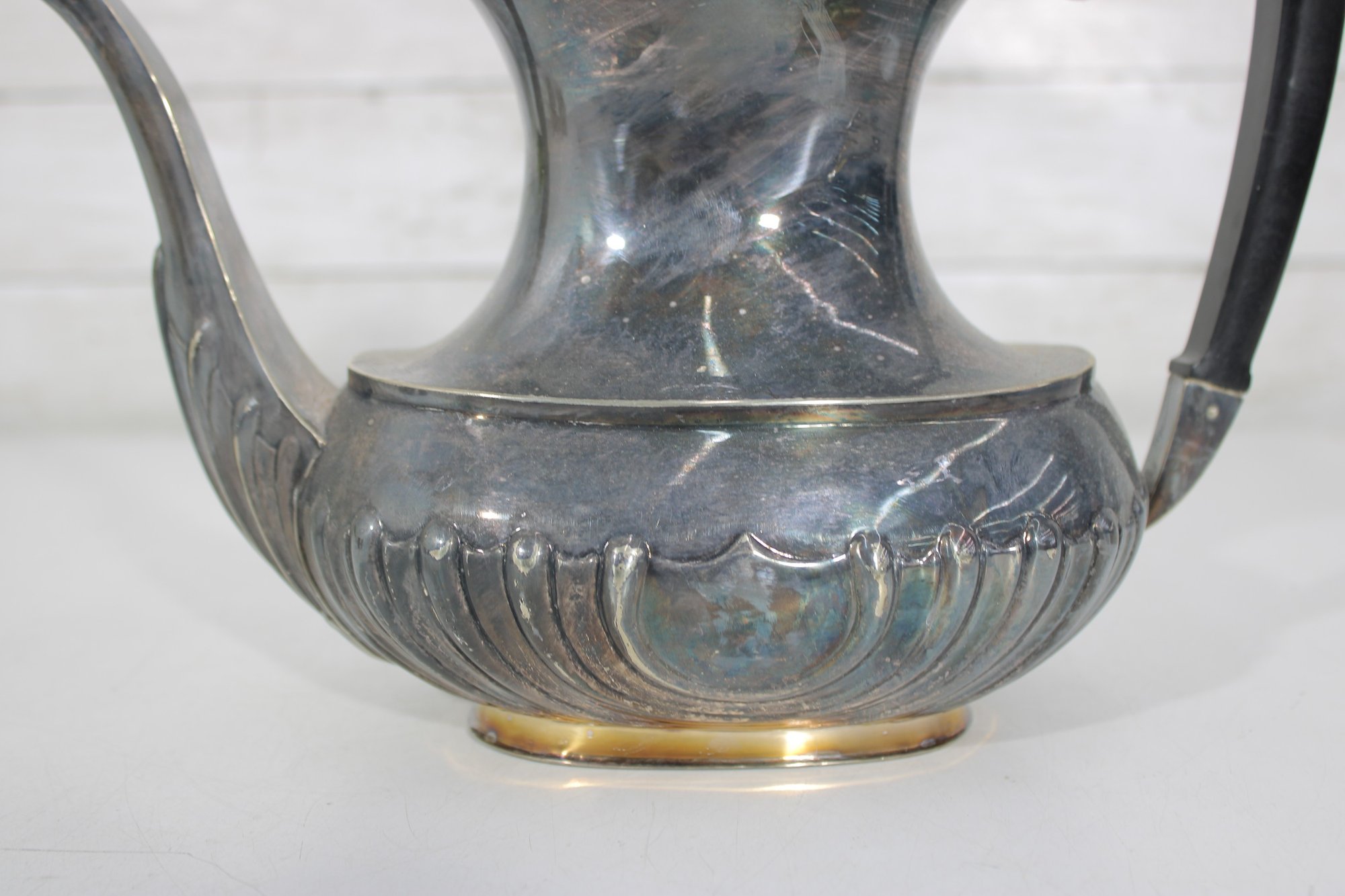 Crafted in traditional Sheffield style, the pieces feature elegant scalloped detailing along the lower body, decorative rims, and a timeless rounded form. The teapot has a graceful curved spout, hinged lid, and a black handle for safe and comfortable pouring.