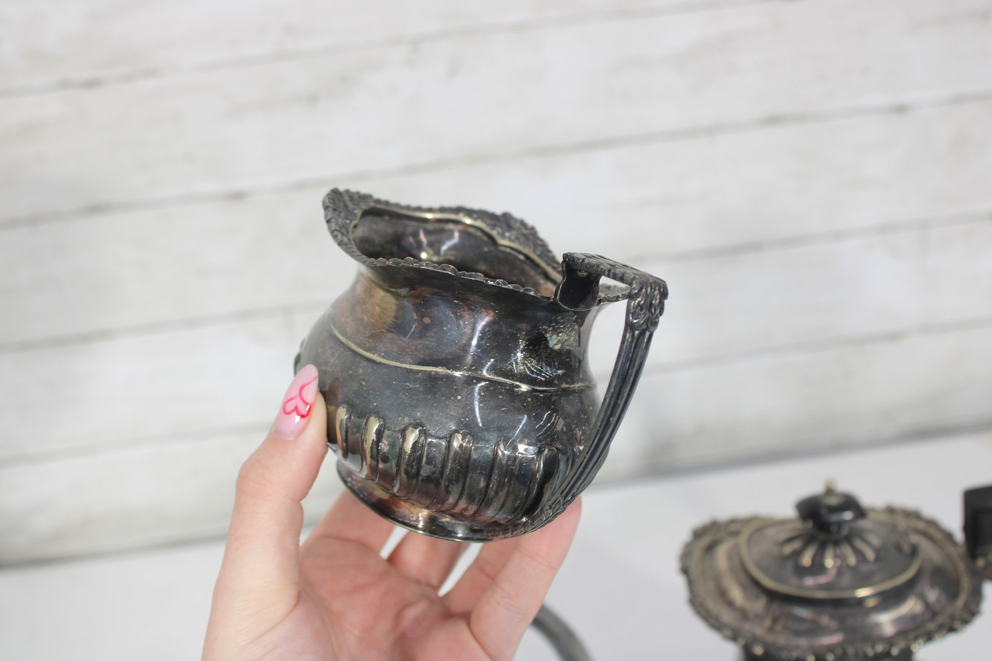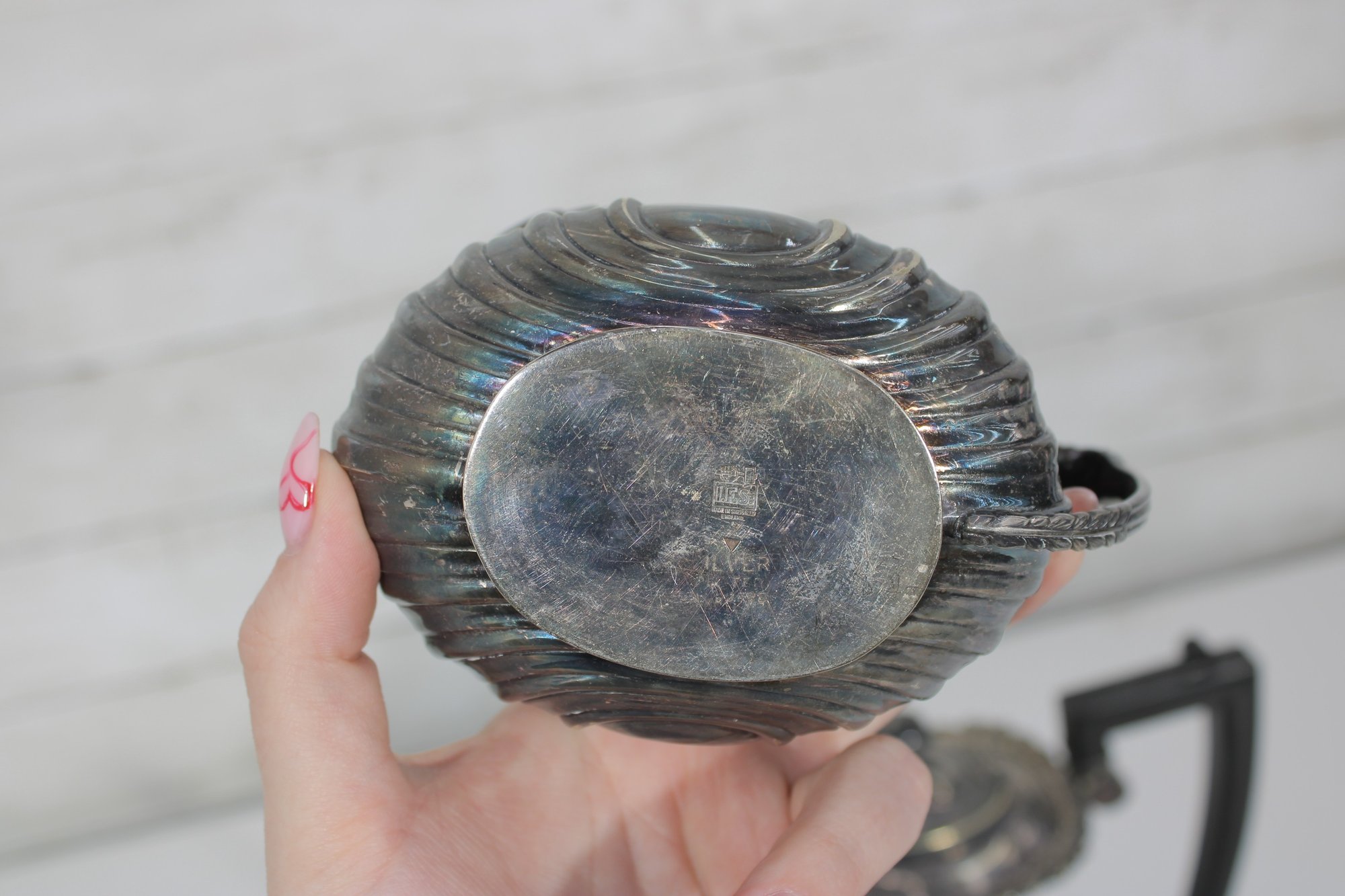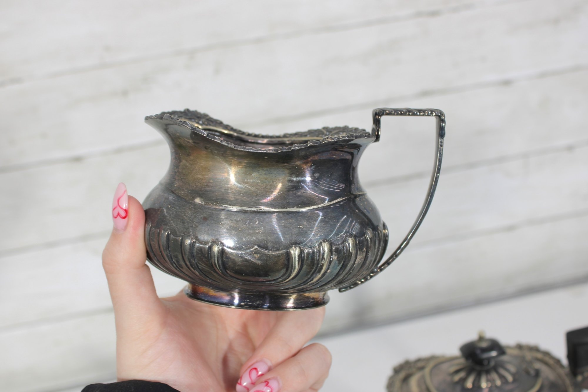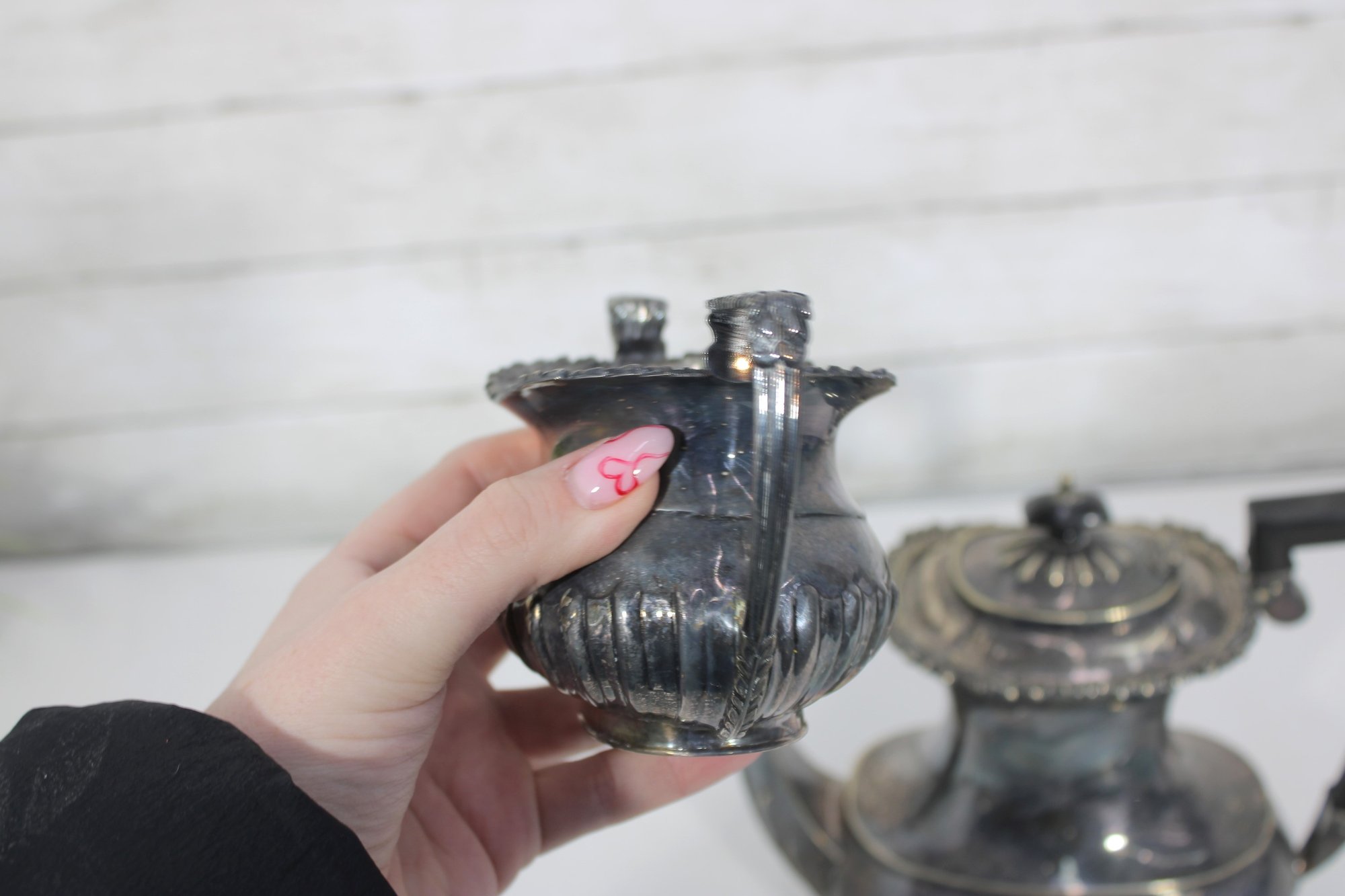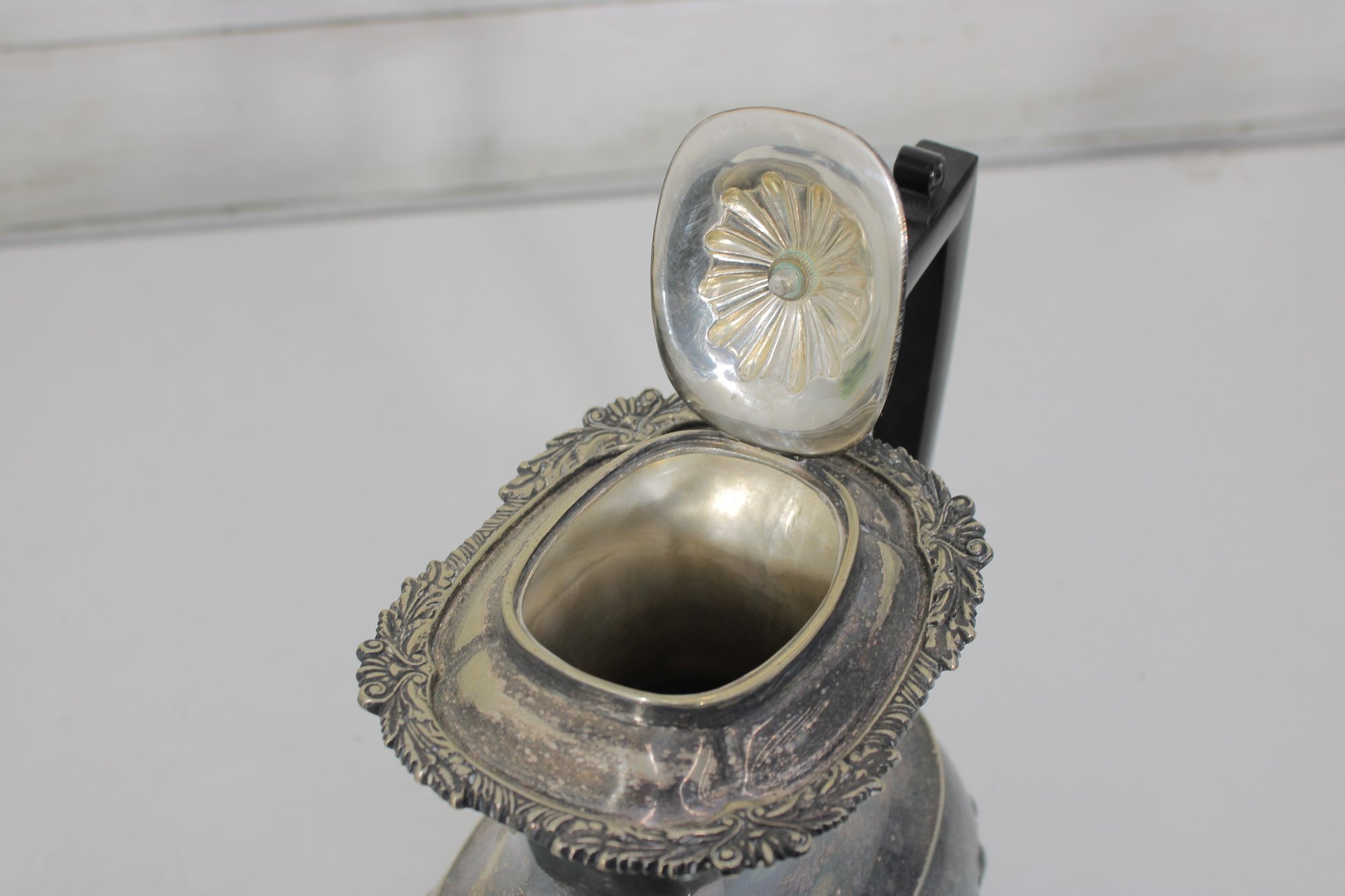 Crafted in traditional Sheffield style, the pieces feature elegant scalloped detailing along the lower body, decorative rims, and a timeless rounded form. The teapot has a graceful curved spout, hinged lid, and a black handle for safe and comfortable pouring.