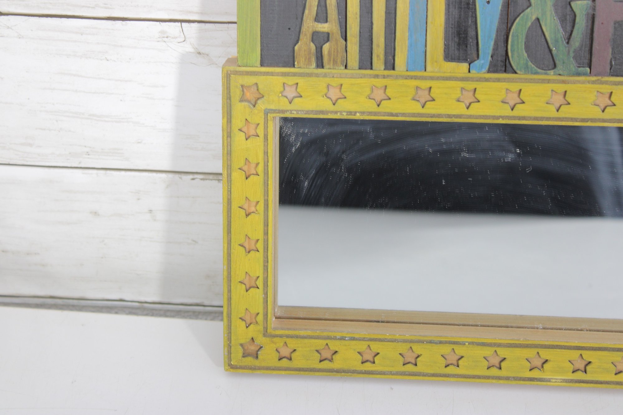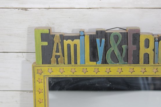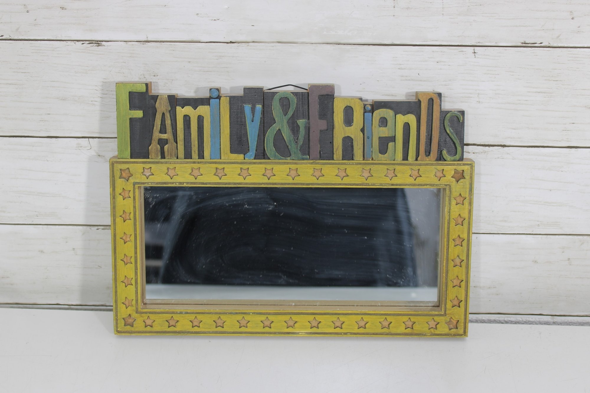 warmth and welcoming charm to your home with this decorative “Family & Friends” wall mirror, measuring 12.5” wide x 9” high. With its colorful lettering and rustic-inspired design, this piece blends heartfelt sentiment with functional décor.