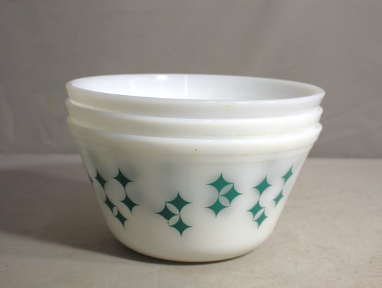 mid-century modern charm to your kitchen with this set of three Federal Glass Atomic Star milk glass mixing bowls. Featuring a distinctive green starburst pattern on classic white milk glass, these bowls are both stylish and functional. Each bowl measures 5 inches high and 9 inches in diameter, making them perfect for mixing, serving, and displaying.
