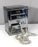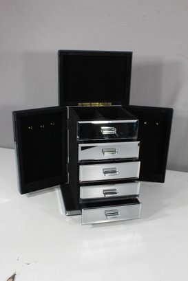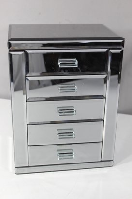 Enhance your vanity or dresser with this stunning mirrored jewelry box. This elegant piece features four spacious drawers and two side panels that open to reveal additional storage for necklaces, bracelets, and other treasures. The high-shine finish and sleek design make it both functional and a statement piece for any room.
