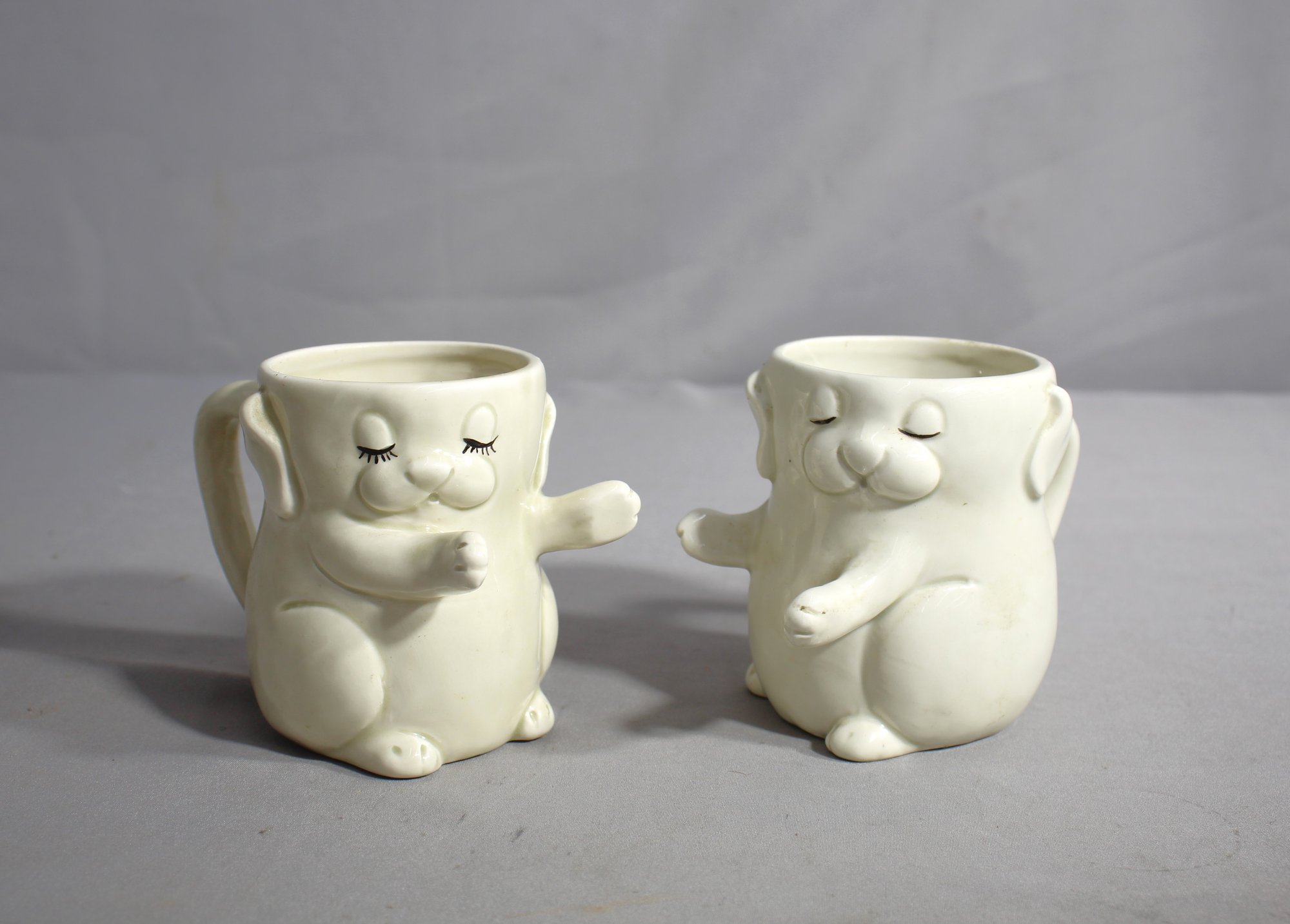 Crafted with care in Japan, these white, ceramic mugs feature an adorable floppy-eared puppy design, one with eyes closed as if giving a kiss, and the other with eyes demurely fluttering. With their arms in a hugging posture, they're designed to nestle together perfectly, symbolizing companionship and affection. These whimsical mugs are not only functional drinkware but also serve as an endearing decorative piece that brings a touch of playful romance to any setting.