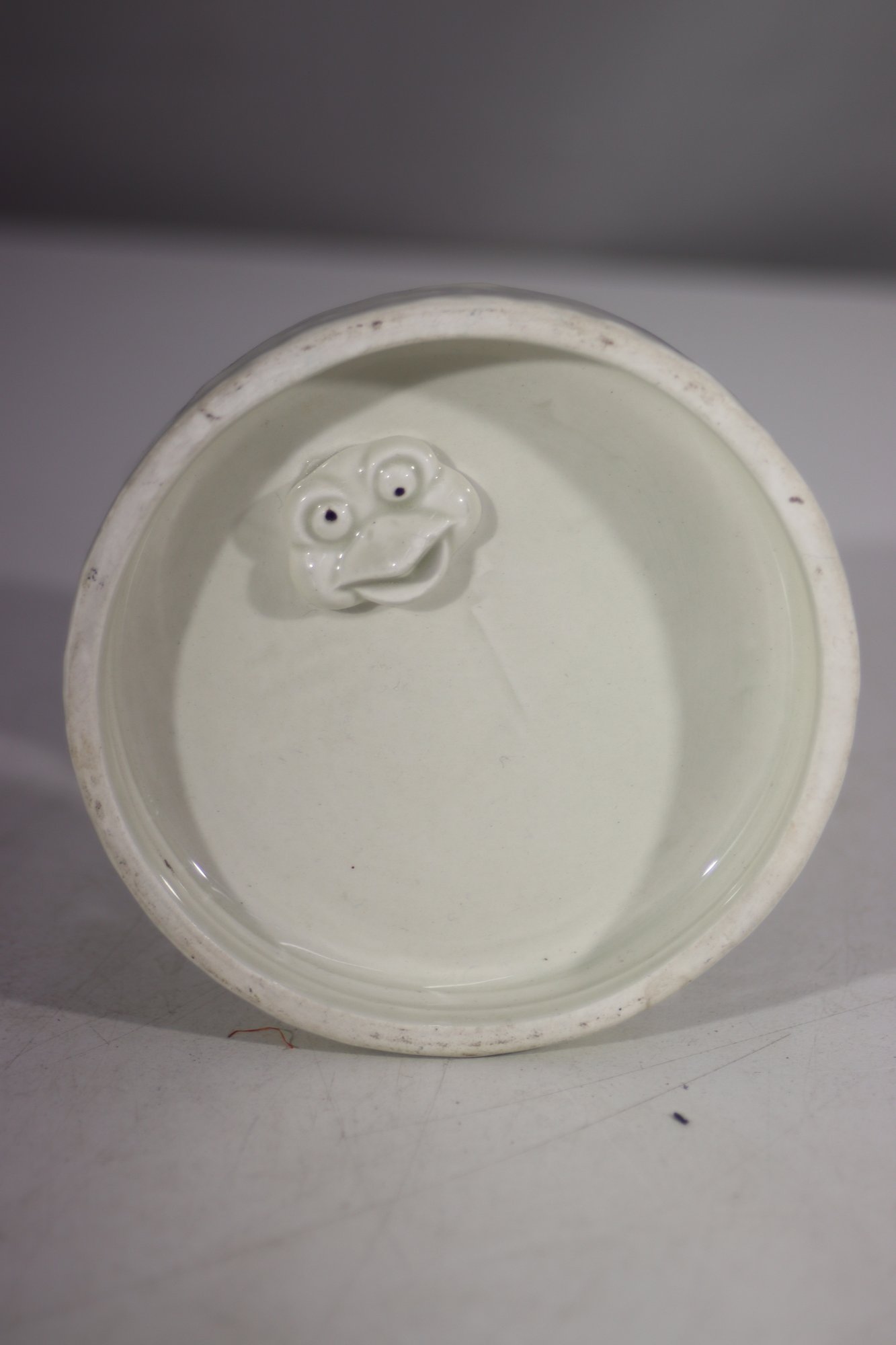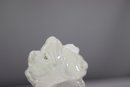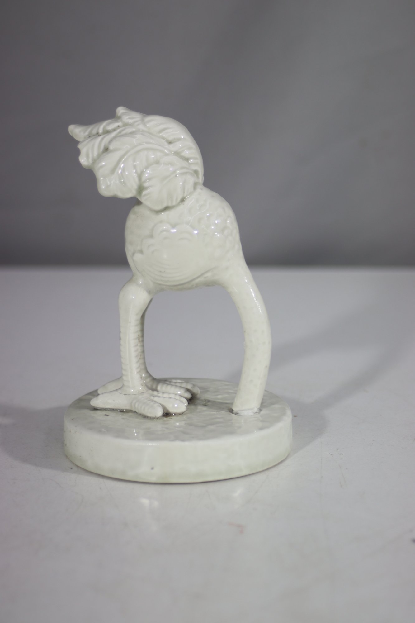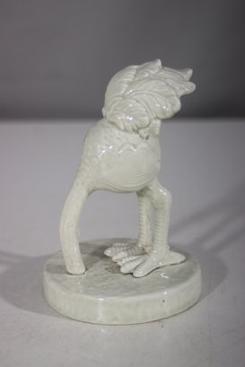 figurine stands on a round base, featuring a textured design with detailed feather patterns. The figurine has a unique artistic interpretation, with an exaggerated head and a stylized body. It has a small chip on the tail, as shown in the close-up image.