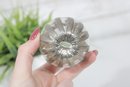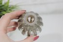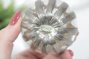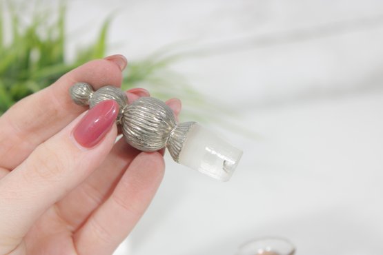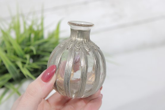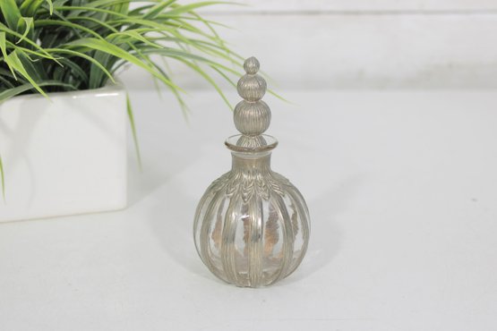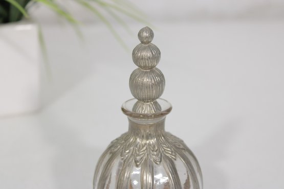 This beautifully detailed bottle features a rounded ribbed glass body accented with a metallic silver finish overlay. The ornate stopper showcases tiered, fluted detailing that complements the flowing vertical lines of the bottle.