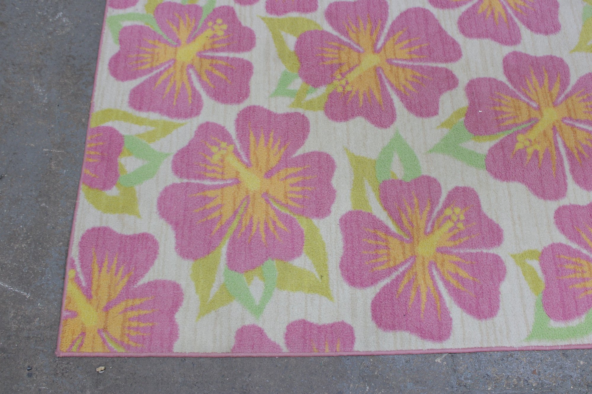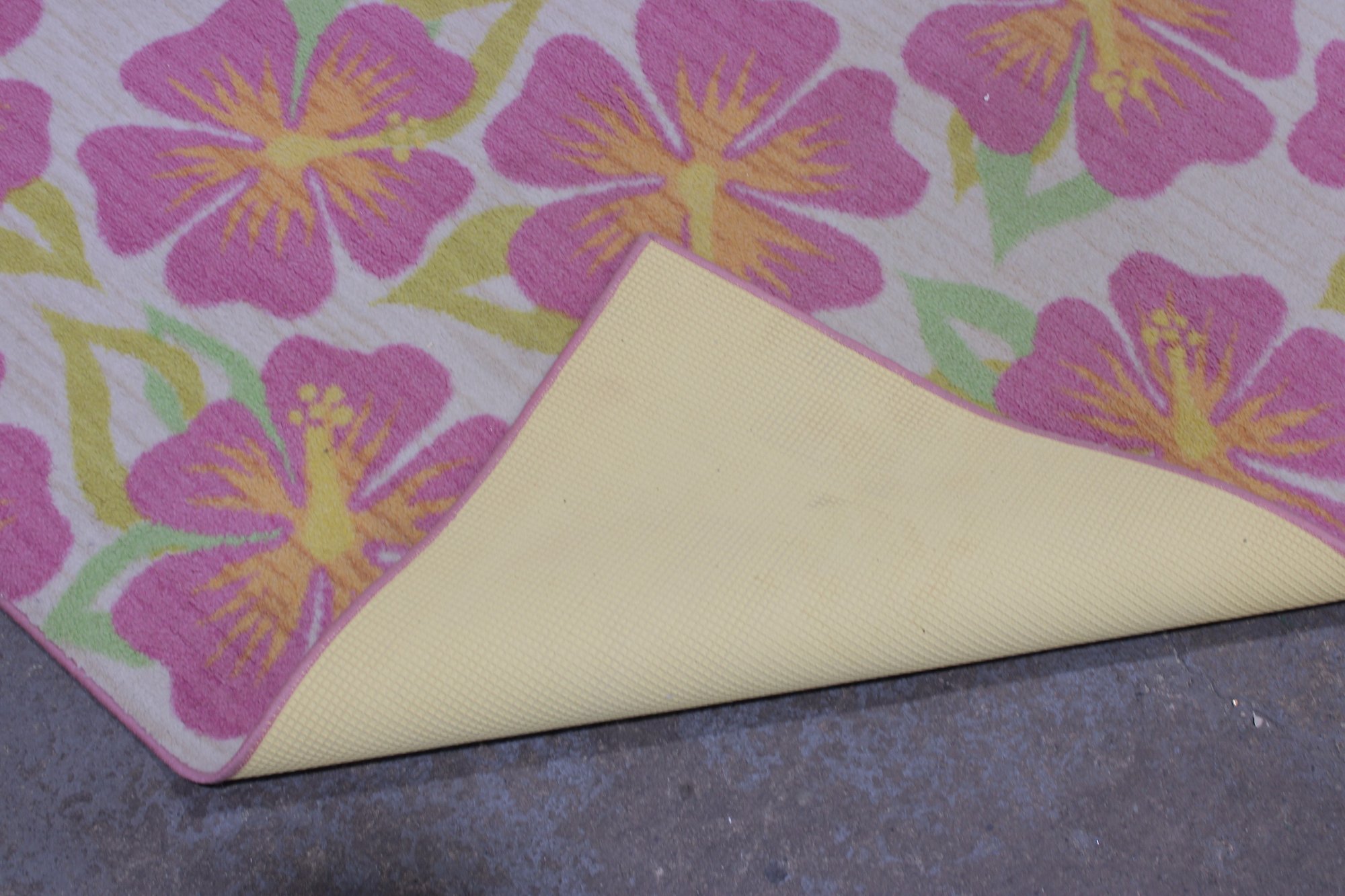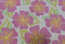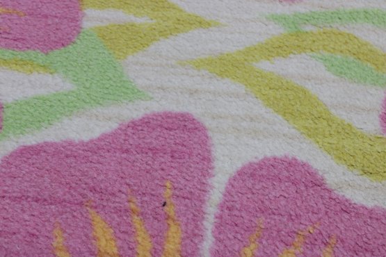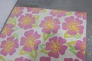 Vibrant floral area rug featuring bold tropical-style blossoms in shades of pink, yellow, and soft green set against a light neutral background. The oversized flower pattern brings energy and color to a room while still feeling soft and inviting.