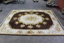 This exquisite Aubusson-style area rug, measuring 121.5" x 98", features a sophisticated brown center framed by cream and adorned with intricate floral designs. The centerpiece showcases a stunning medallion surrounded by elegant rose motifs, with a detailed border that enhances its classic beauty.