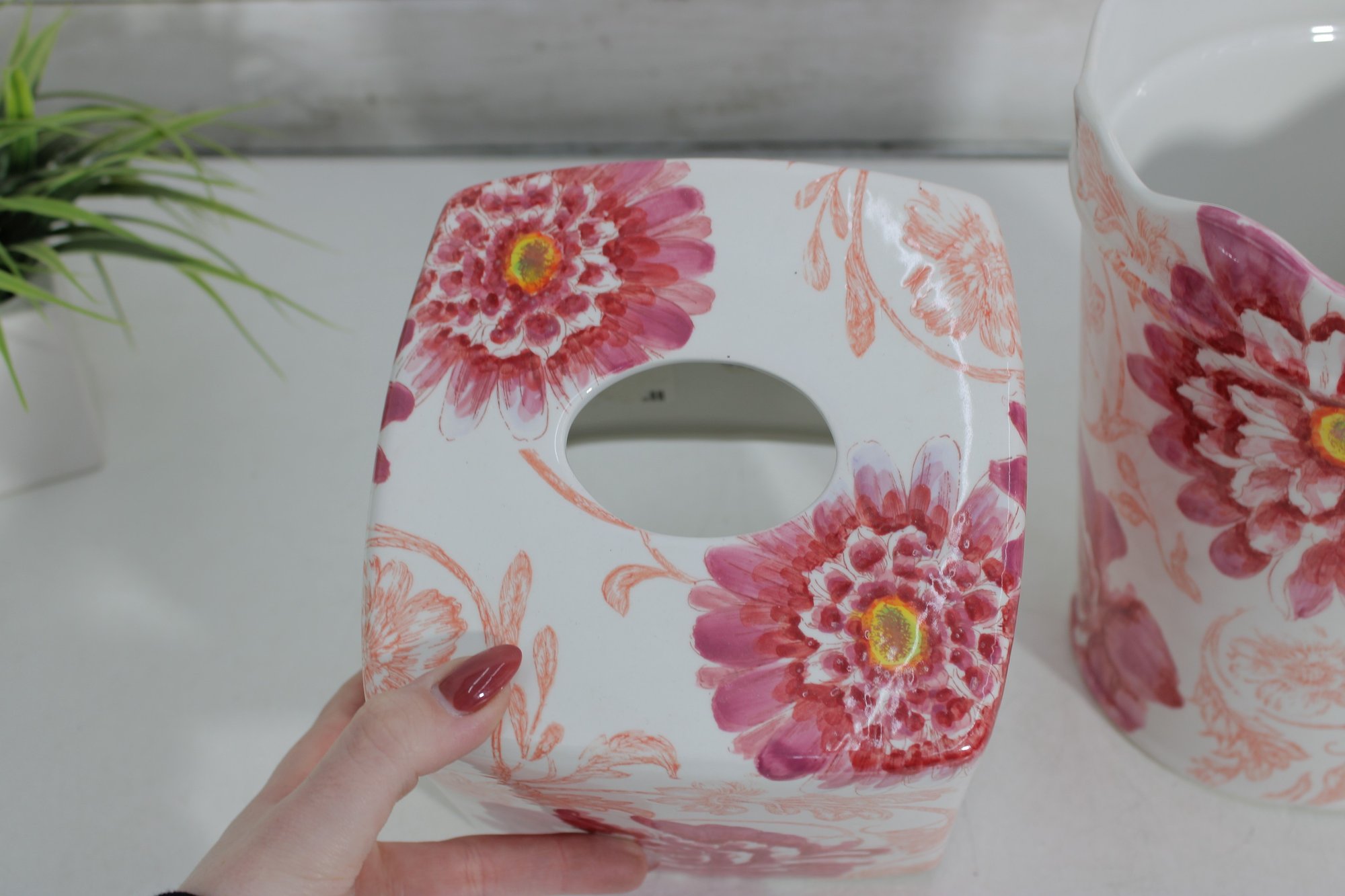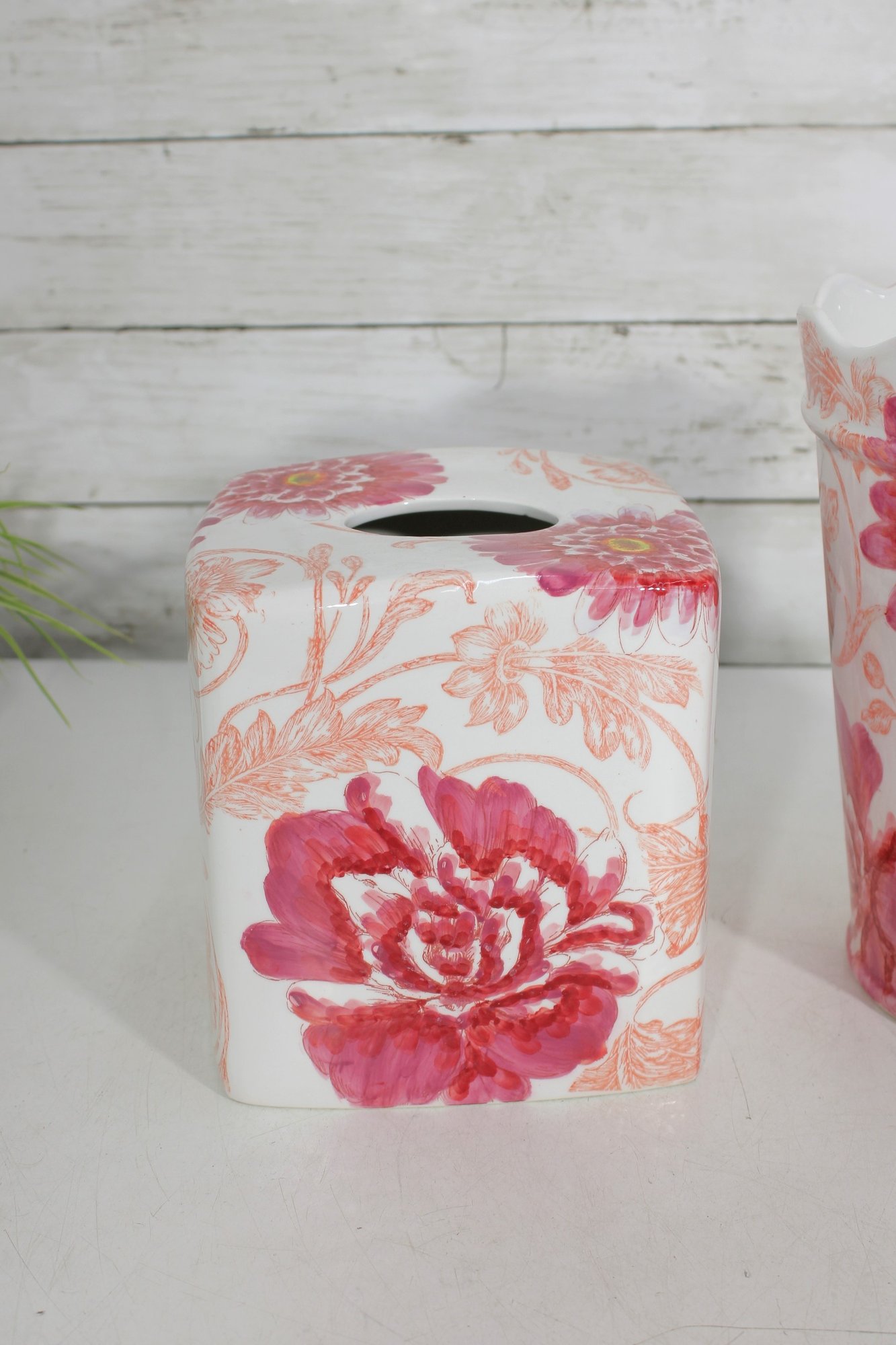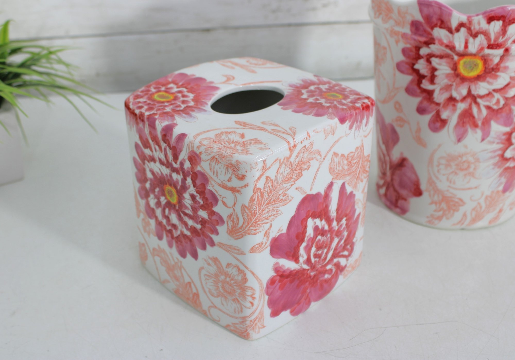 Brighten your space with this beautiful matching porcelain wastebasket and tissue box cover set, featuring vibrant pink floral designs on a soft white background. Feminine, cheerful, and elegant, this set adds a fresh decorative touch to any bathroom or vanity area.