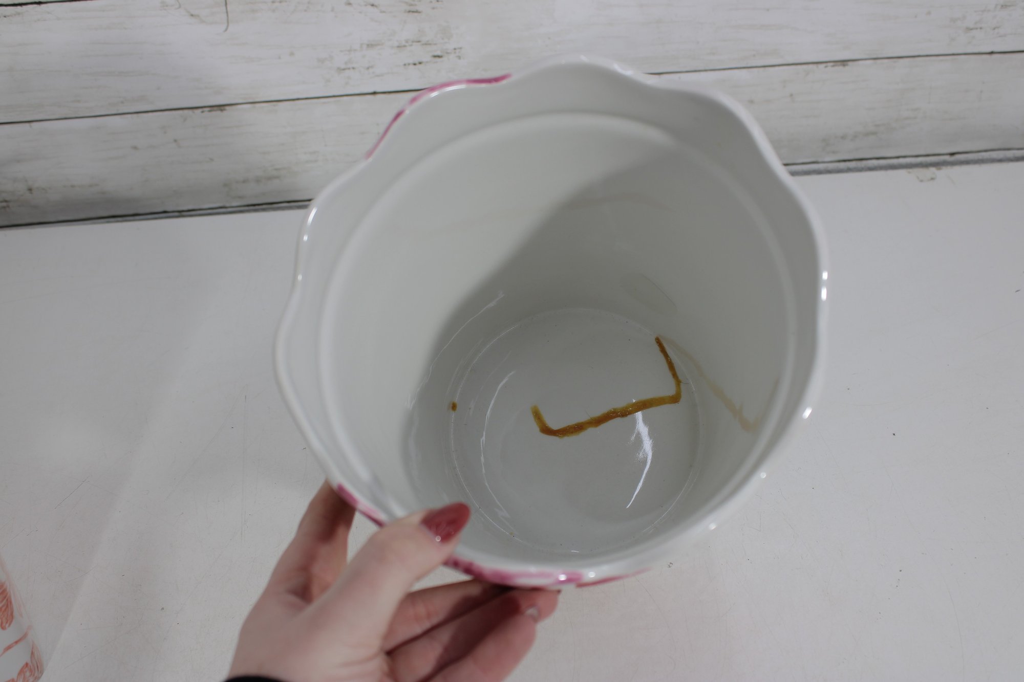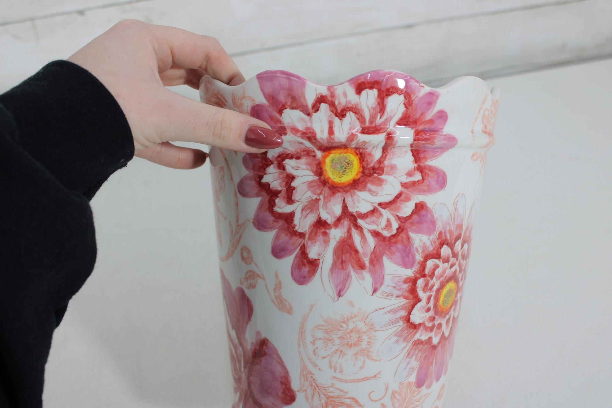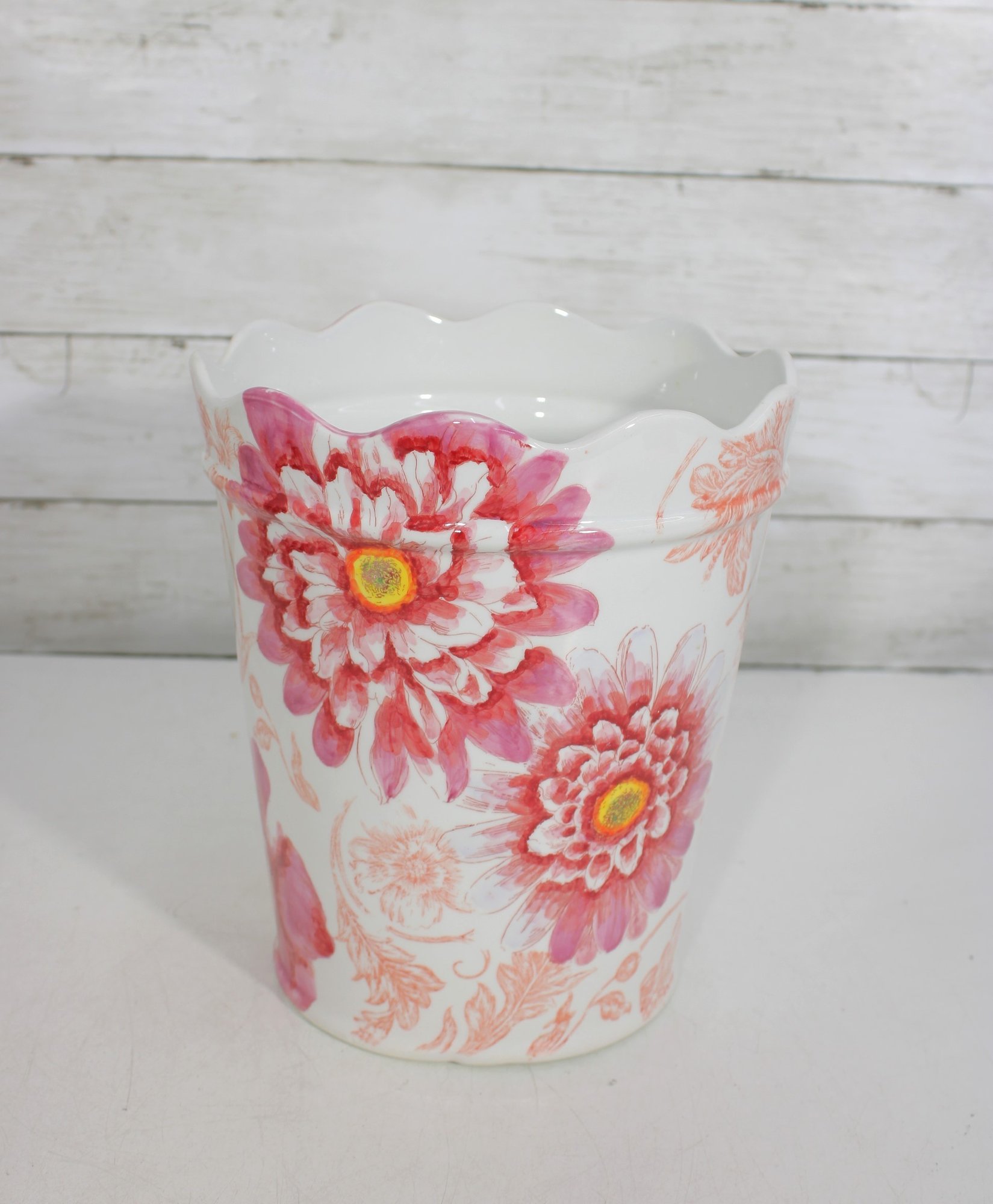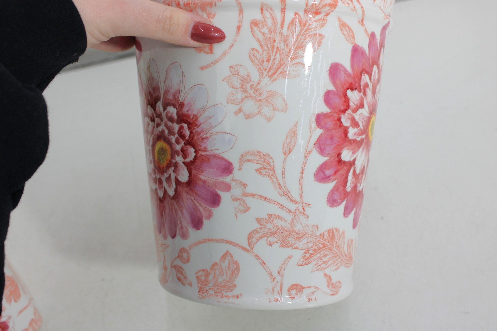 Brighten your space with this beautiful matching porcelain wastebasket and tissue box cover set, featuring vibrant pink floral designs on a soft white background. Feminine, cheerful, and elegant, this set adds a fresh decorative touch to any bathroom or vanity area.