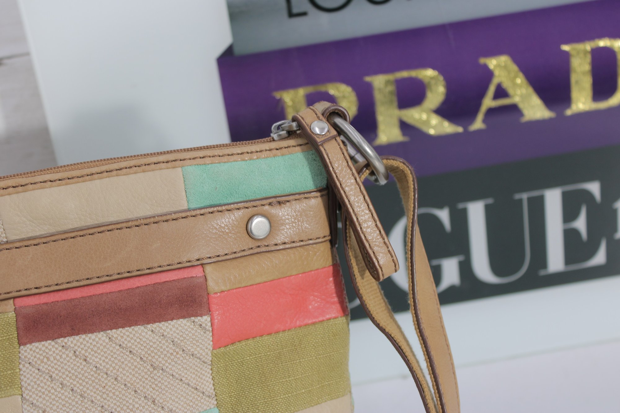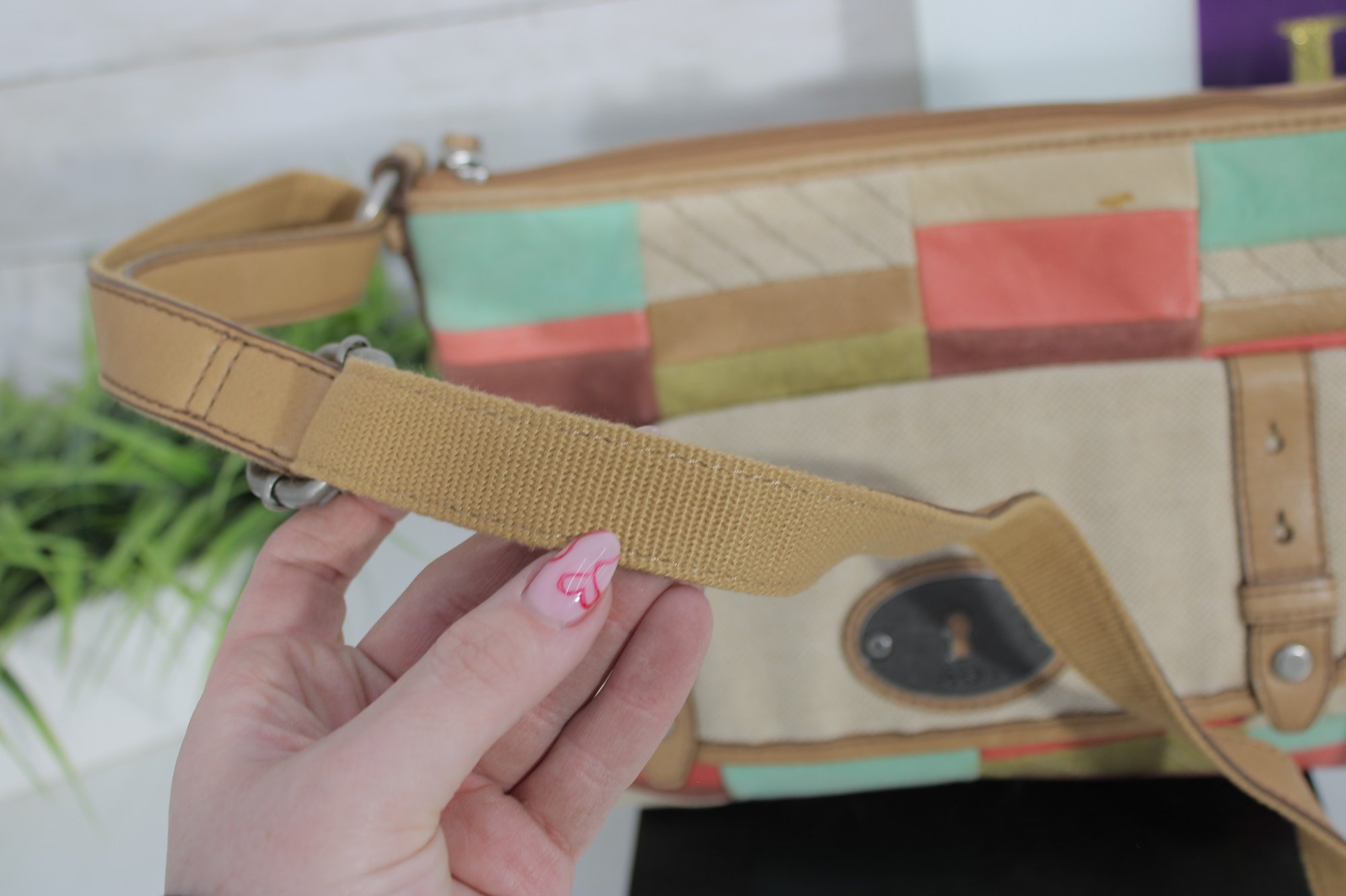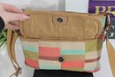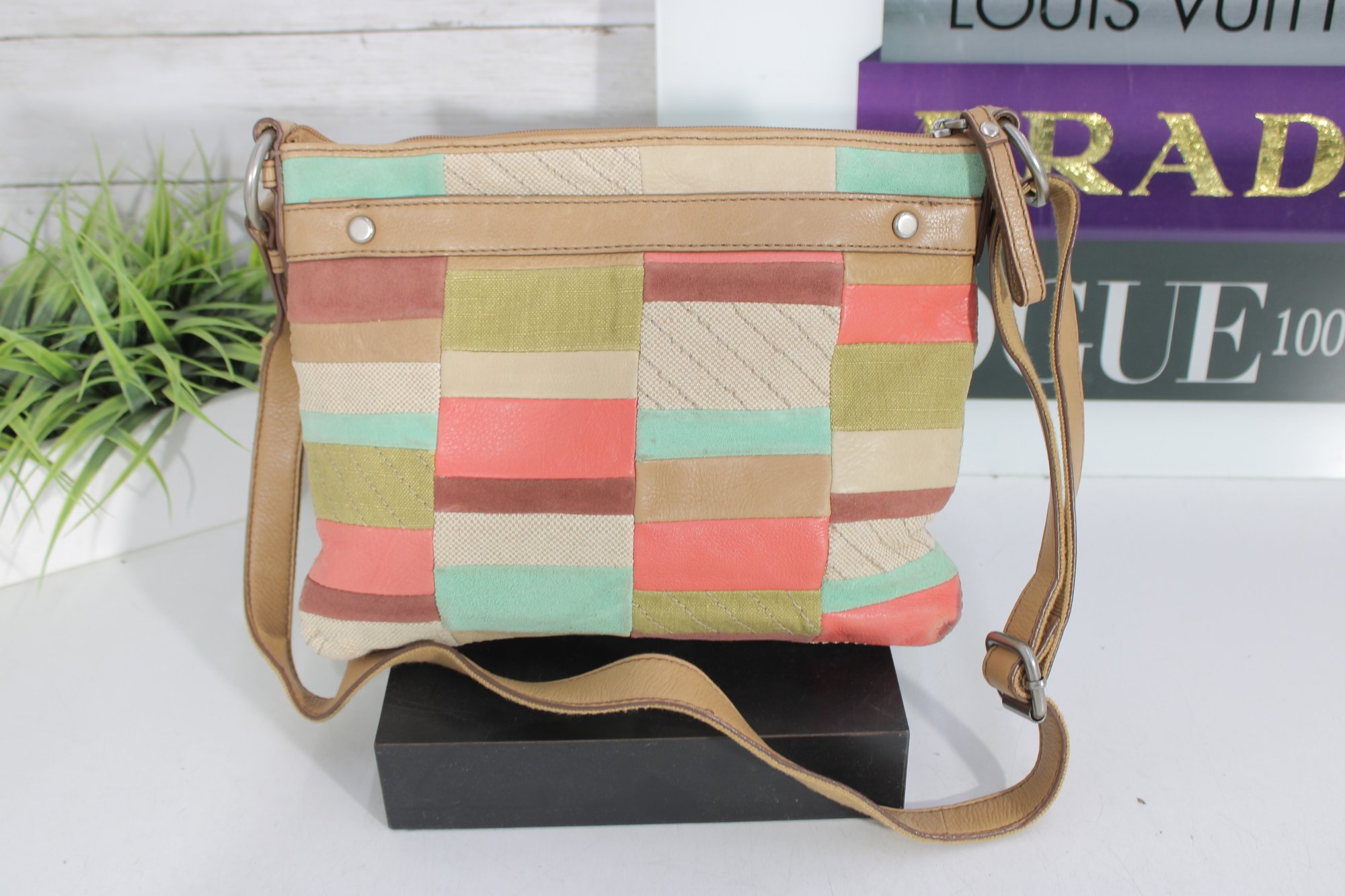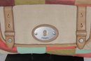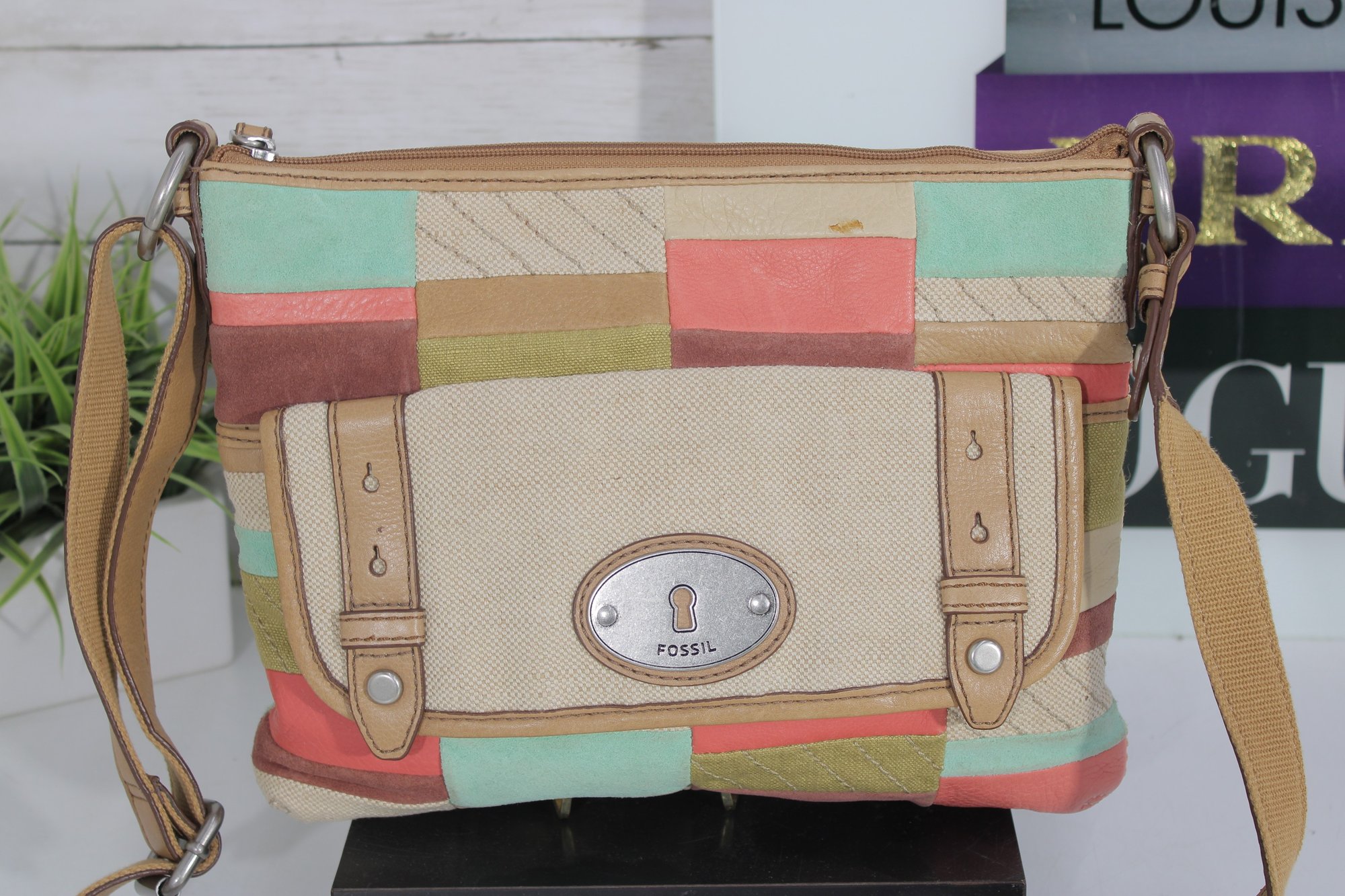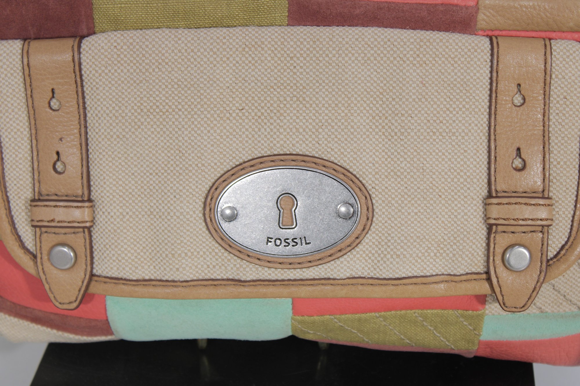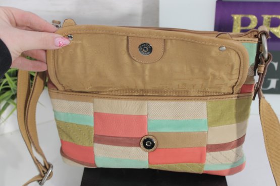 Fossil patchwork crossbody bag featuring a beautiful mix of soft pastel tones and neutral canvas with tan leather trim. This eye-catching purse combines Fossil’s classic vintage-inspired look with a fun, colorful patchwork design.