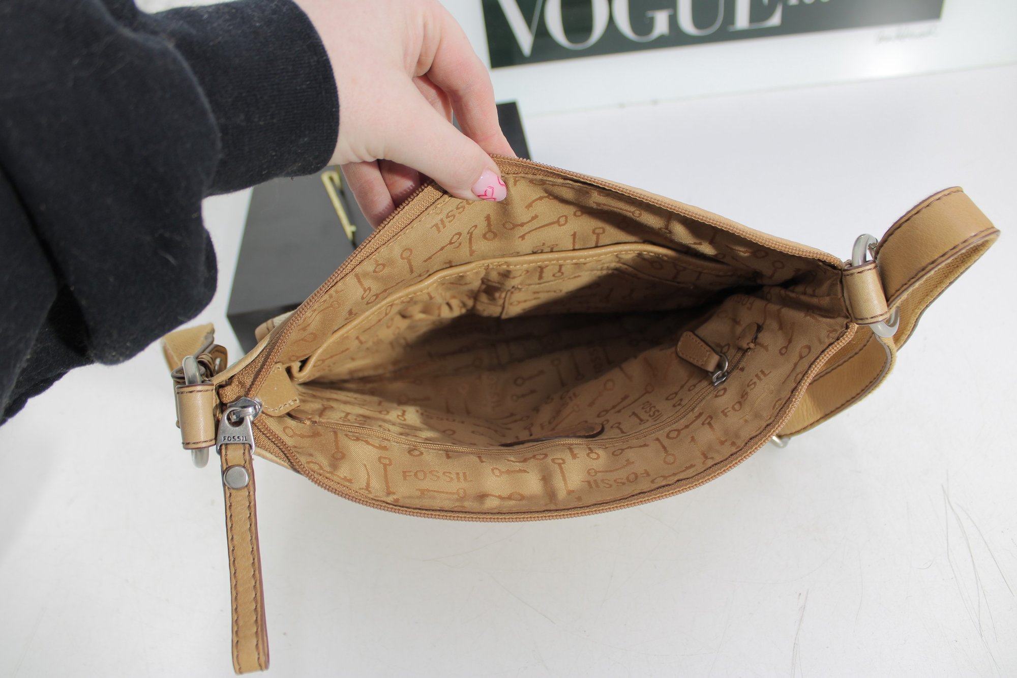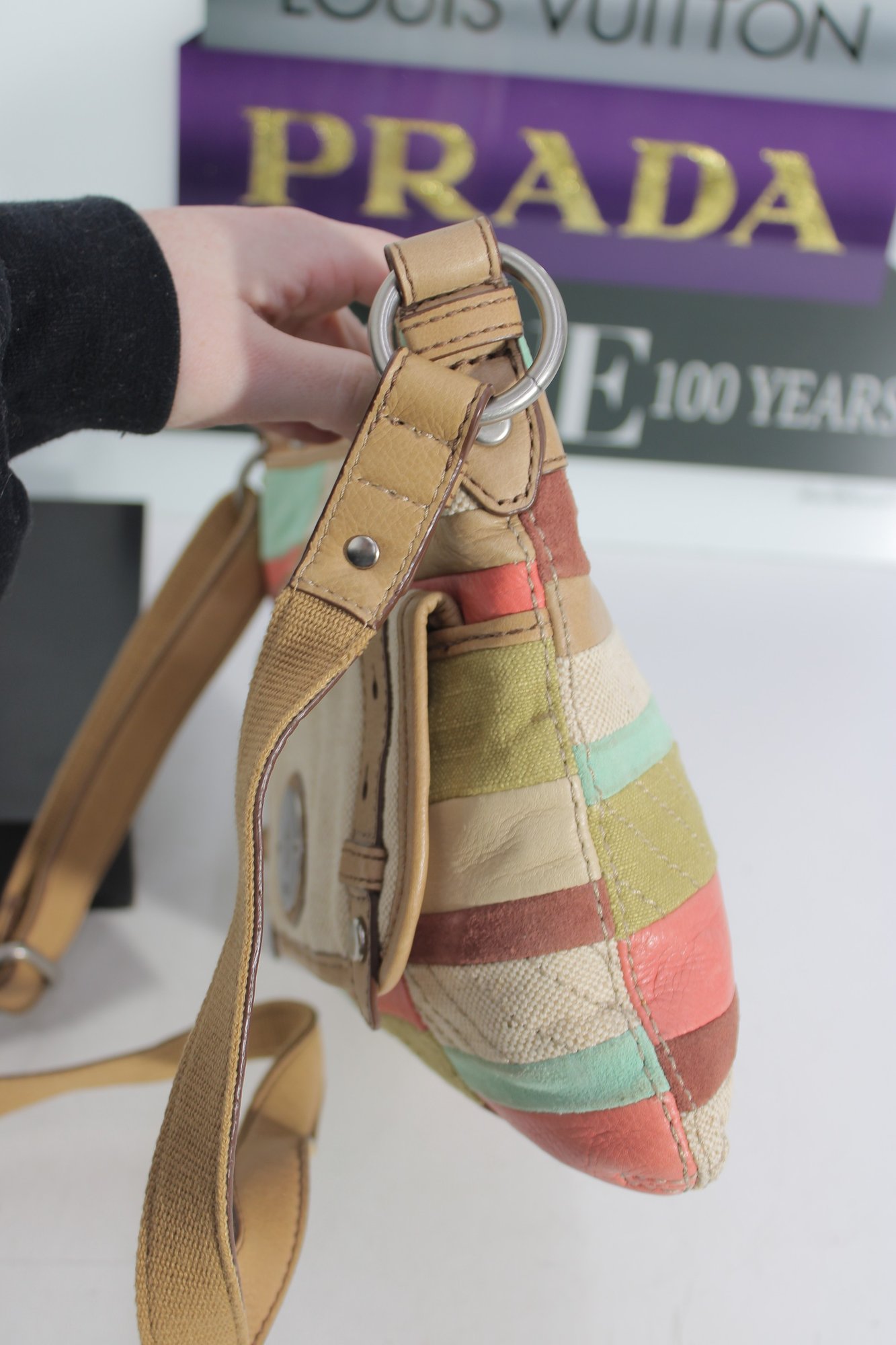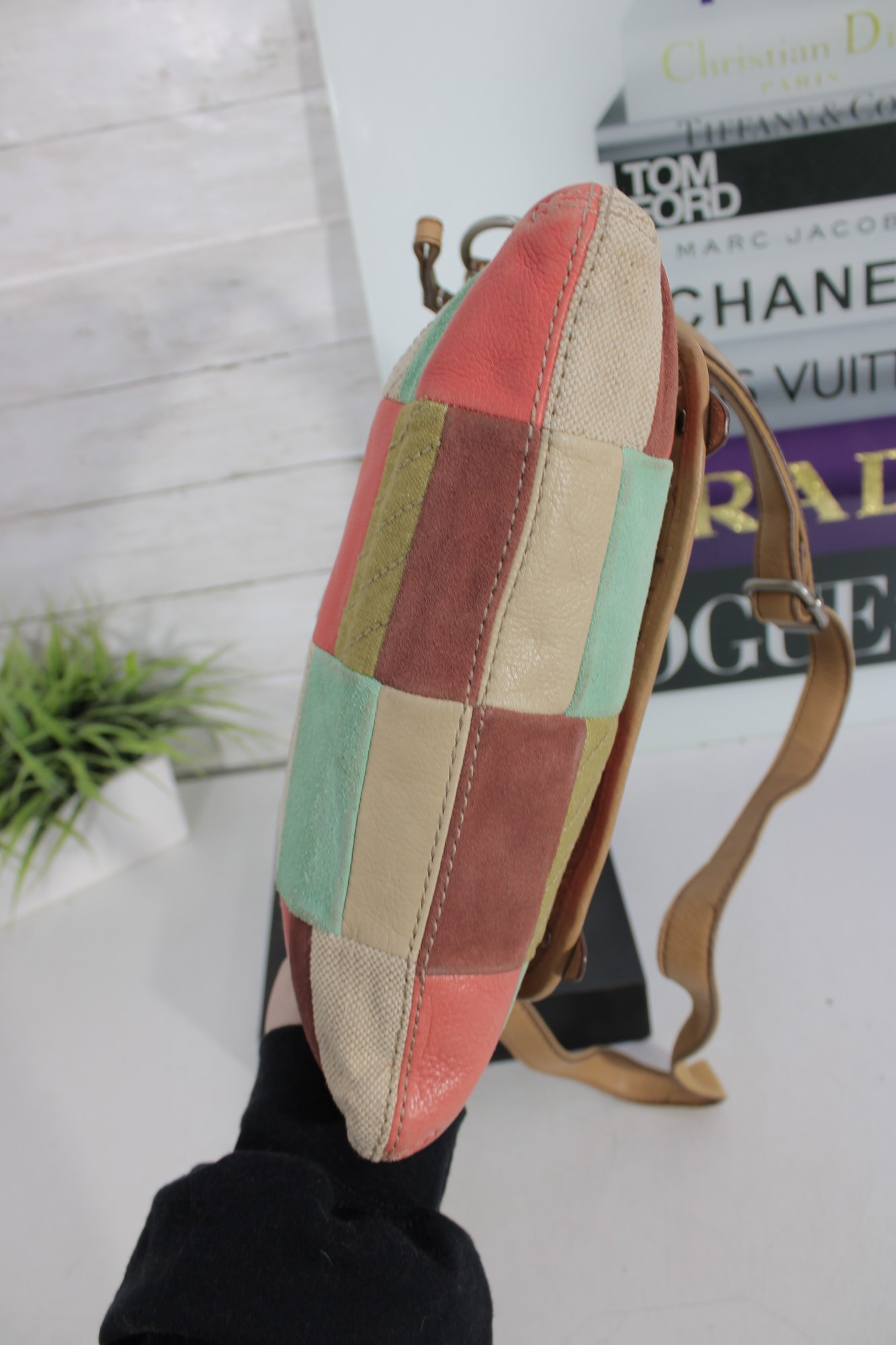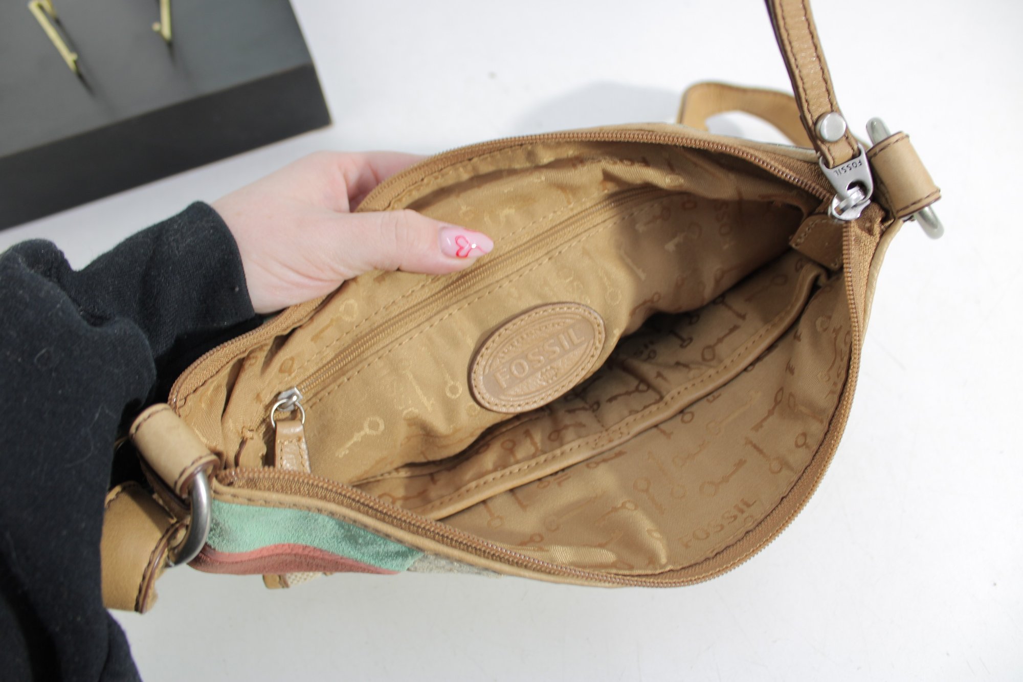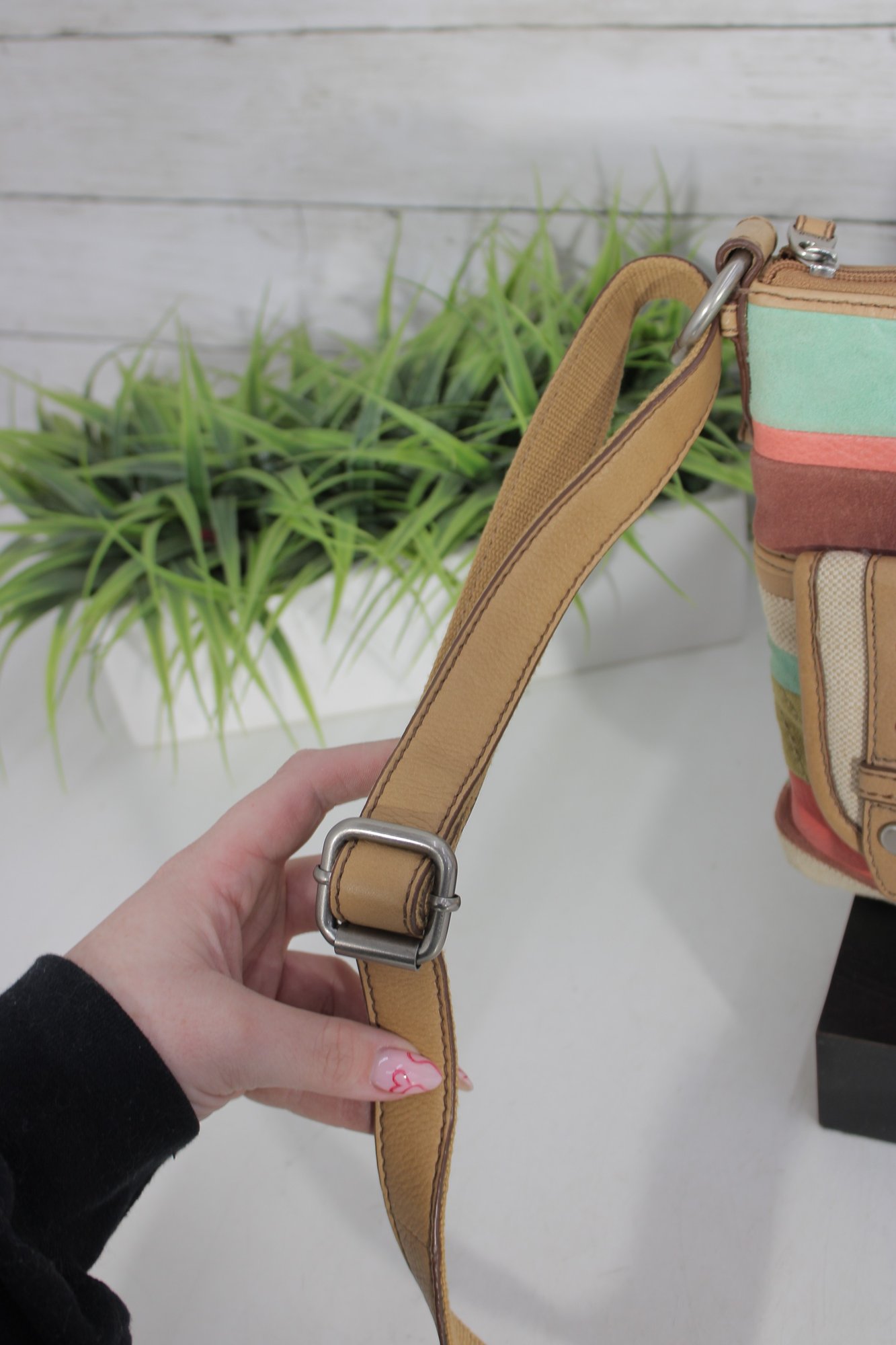Fossil patchwork crossbody bag featuring a beautiful mix of soft pastel tones and neutral canvas with tan leather trim. This eye-catching purse combines Fossil’s classic vintage-inspired look with a fun, colorful patchwork design.