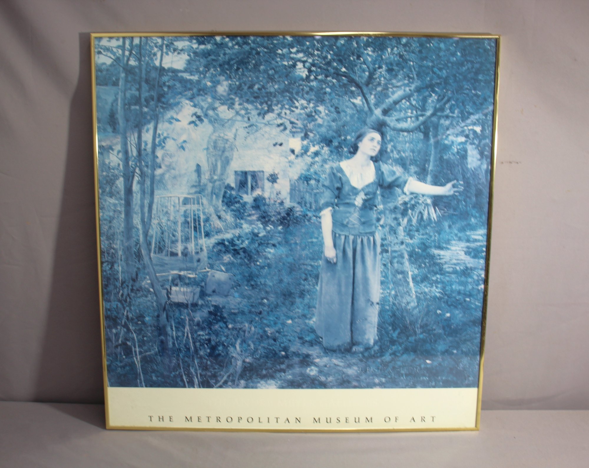 framed poster from the Metropolitan Museum of Art, featuring an iconic representation of Joan of Arc. This poster, with its distinctive cyanotype blue, captures the historical and heroic essence of Joan amidst a tranquil garden setting.