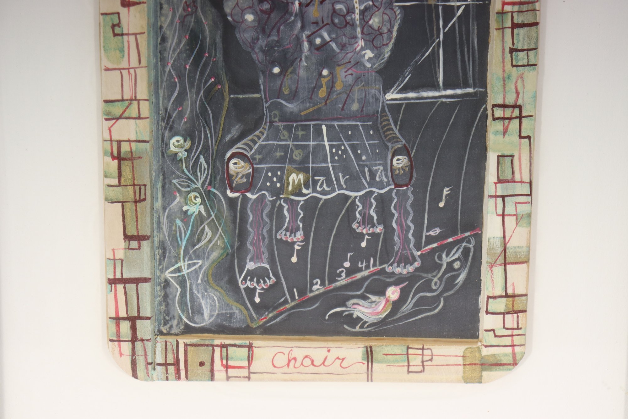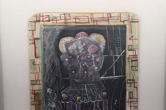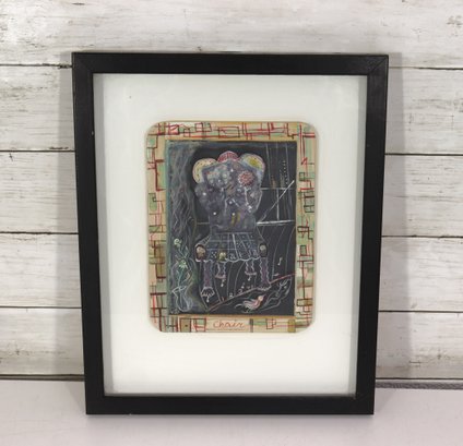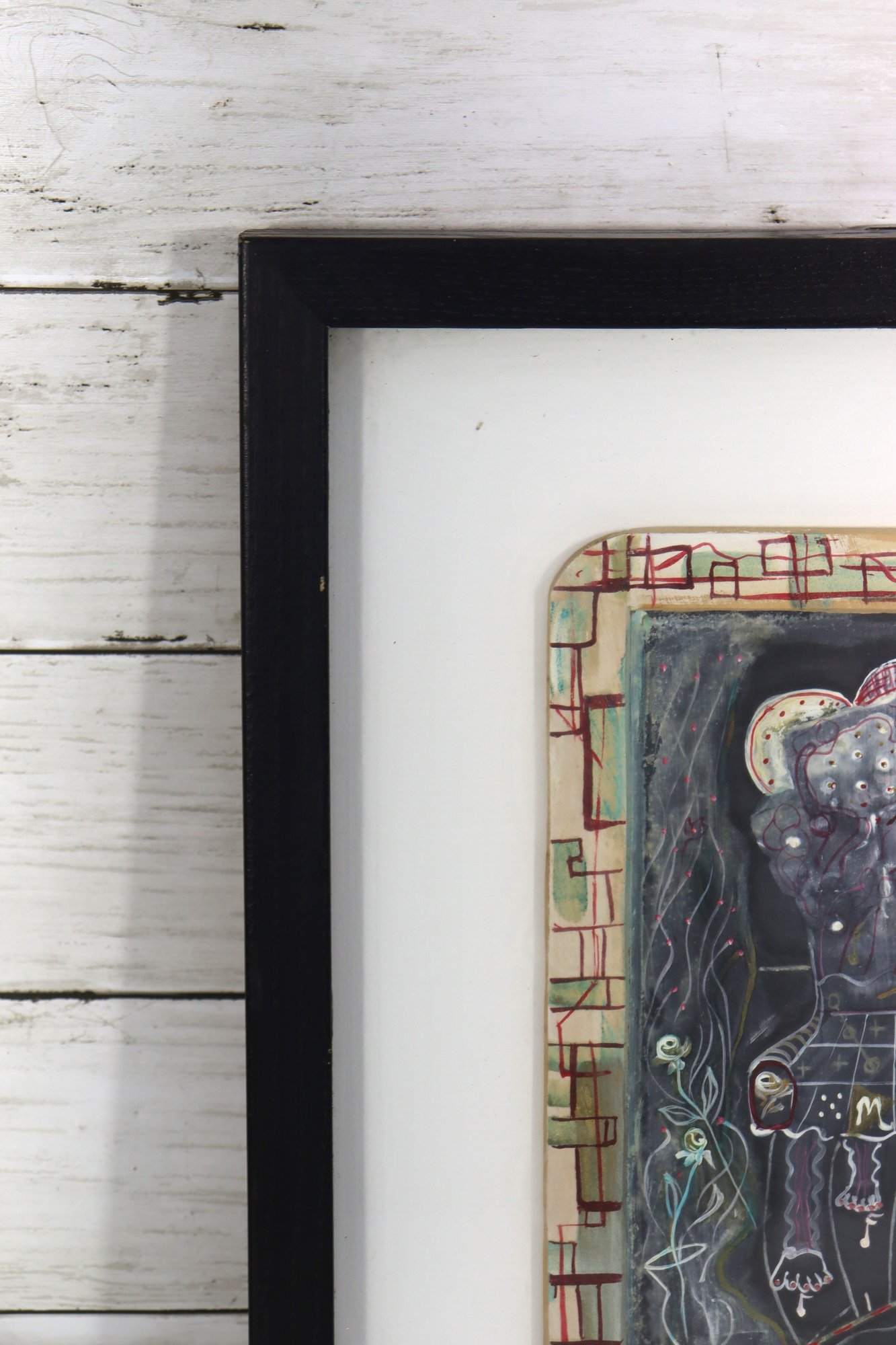 a striking abstract figurative art print, presented in a clean black frame with a wide white mat. The artwork features a surreal, expressive figure rendered in layered textures, symbolic markings, and bold linework, creating a visually compelling and thought-provoking composition.