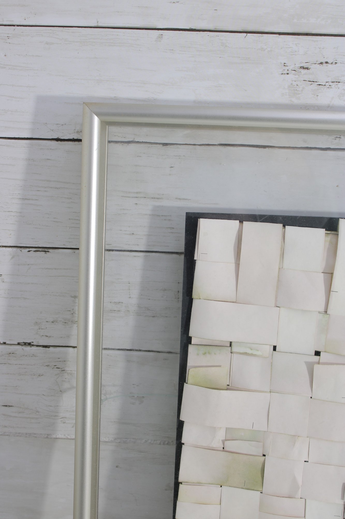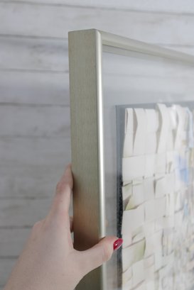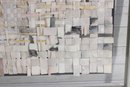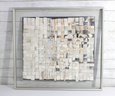 abstract mixed media collage artwork, beautifully framed and measuring approximately 28.5" x 31". This piece features a layered composition of small, hand-arranged paper elements creating a woven, mosaic-like texture across the surface.