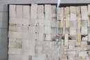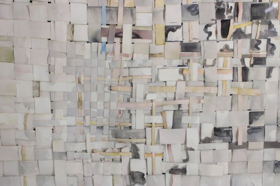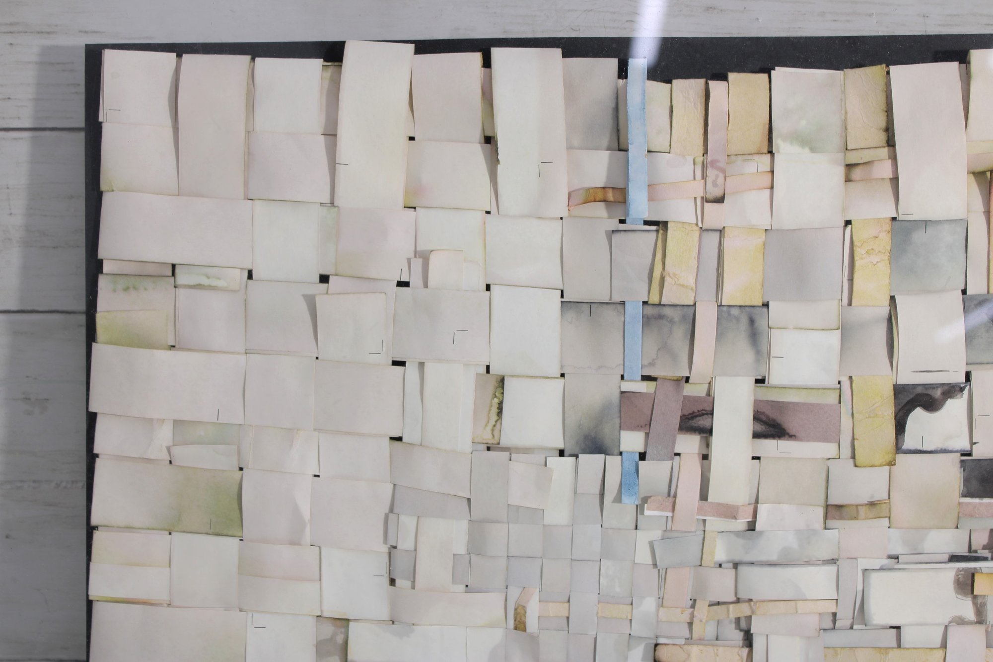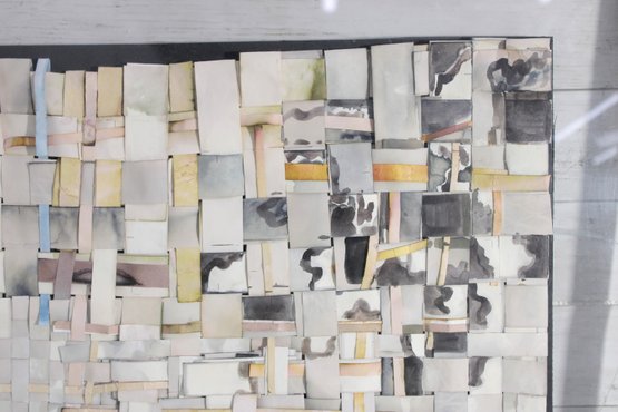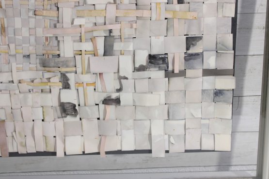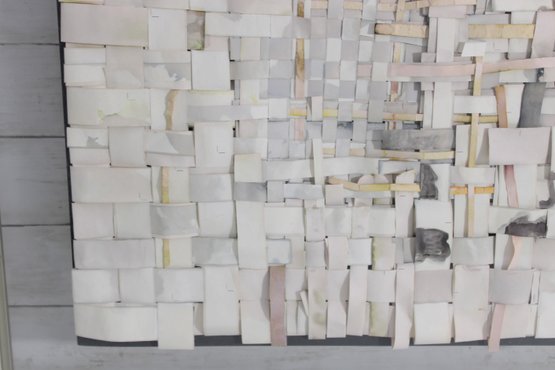 The artwork showcases a subtle, neutral palette of creams, whites, grays, and soft muted tones, with occasional hints of color peeking through, adding depth and visual interest. The dimensional construction gives the piece a sculptural quality that changes with light and viewing angle.