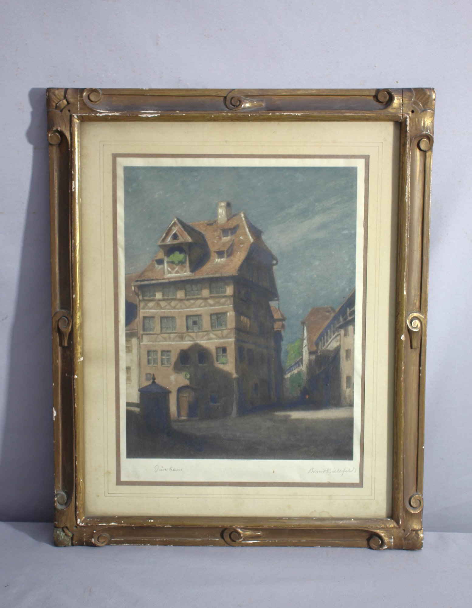 the historic dwelling of the Renaissance master, Albrecht Dürer, in Nuremberg. This print captivates with its attention to architectural detail and the serene ambiance of the streetscape it portrays. A mood of tranquil antiquity pervades the piece, inviting the viewer to step into the cobblestone roads of a time past.