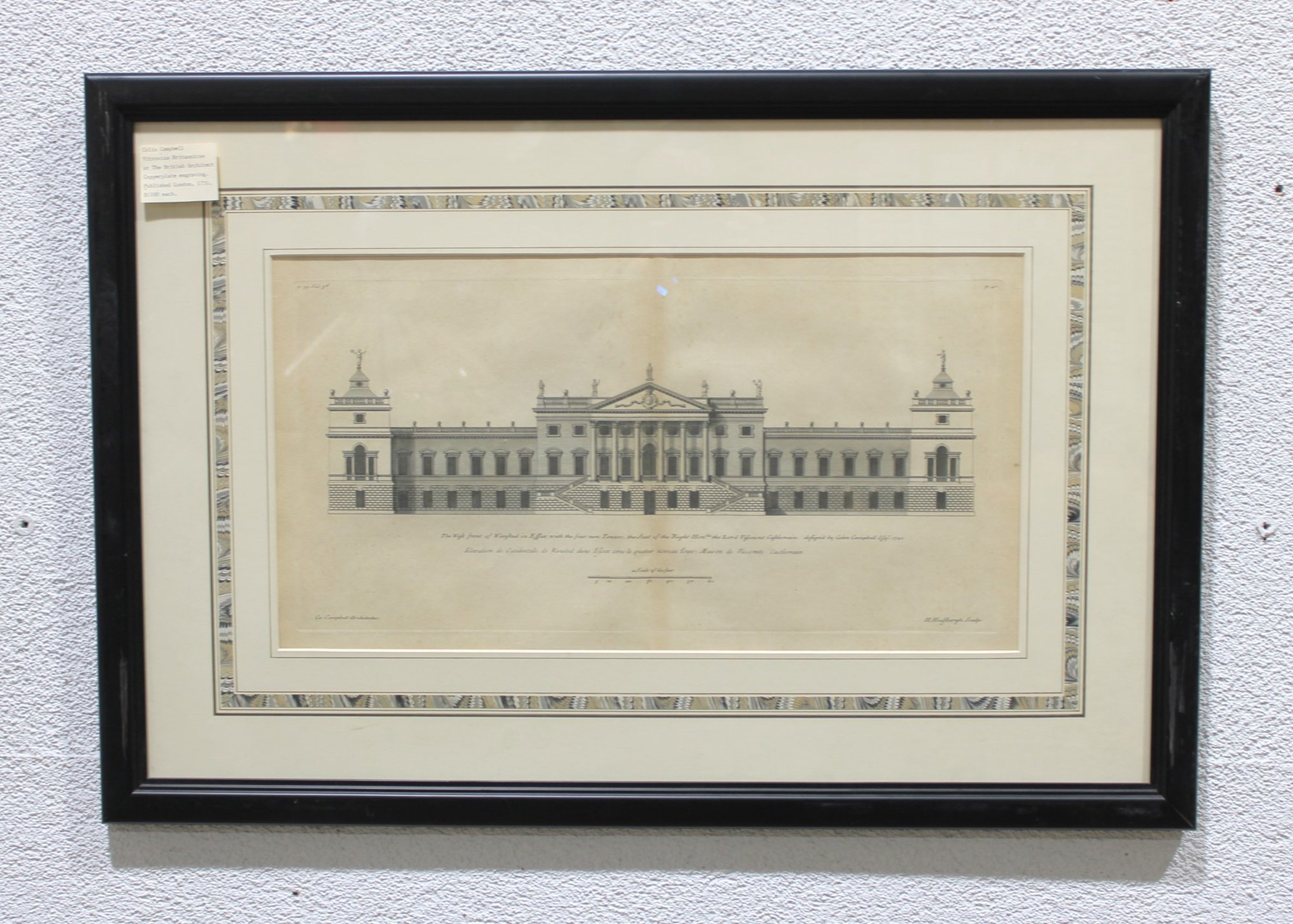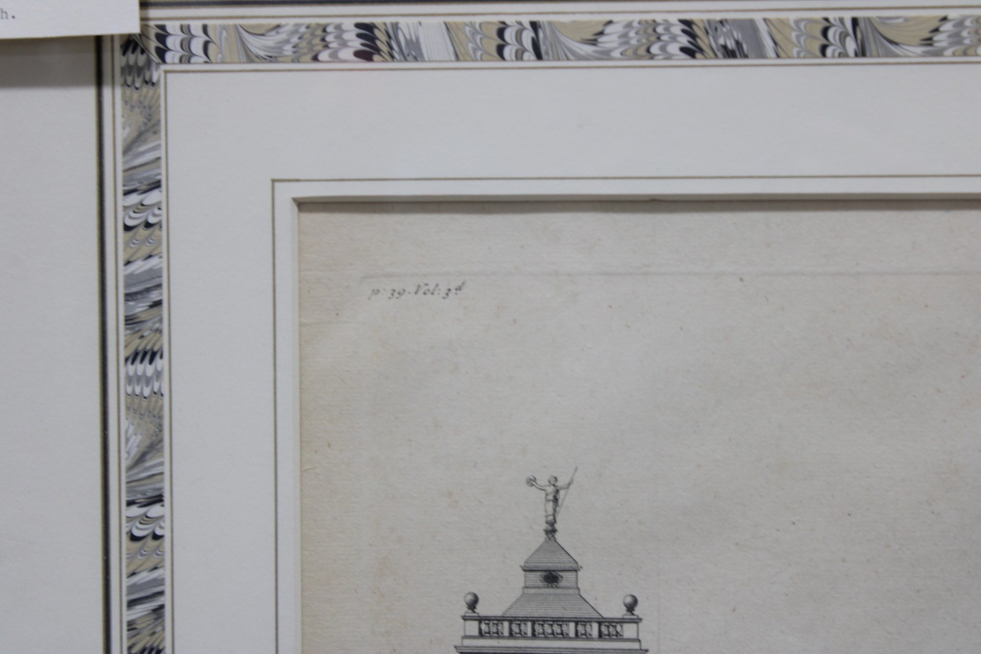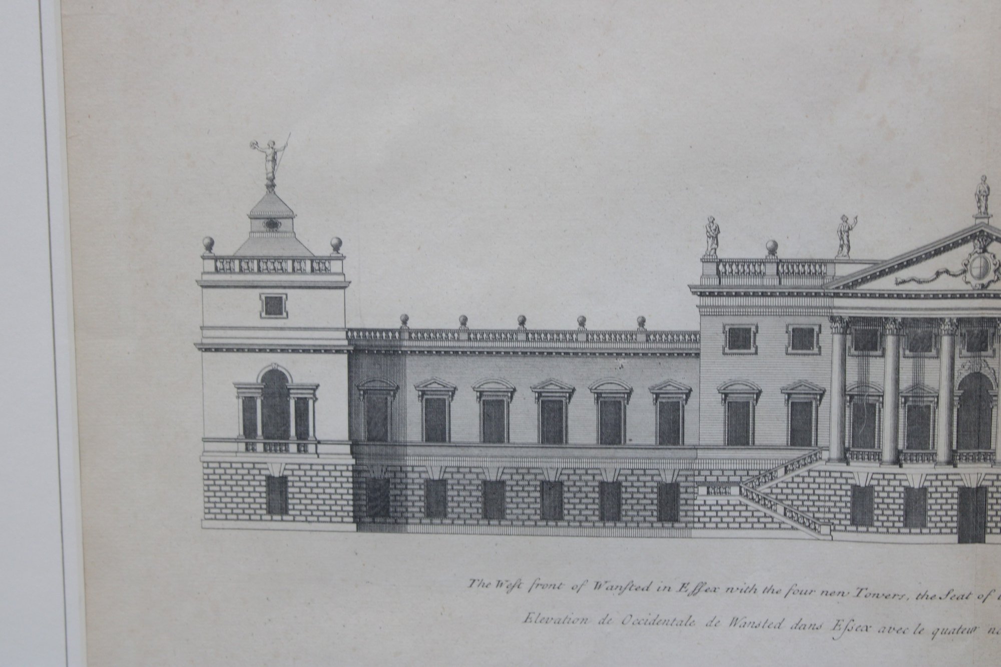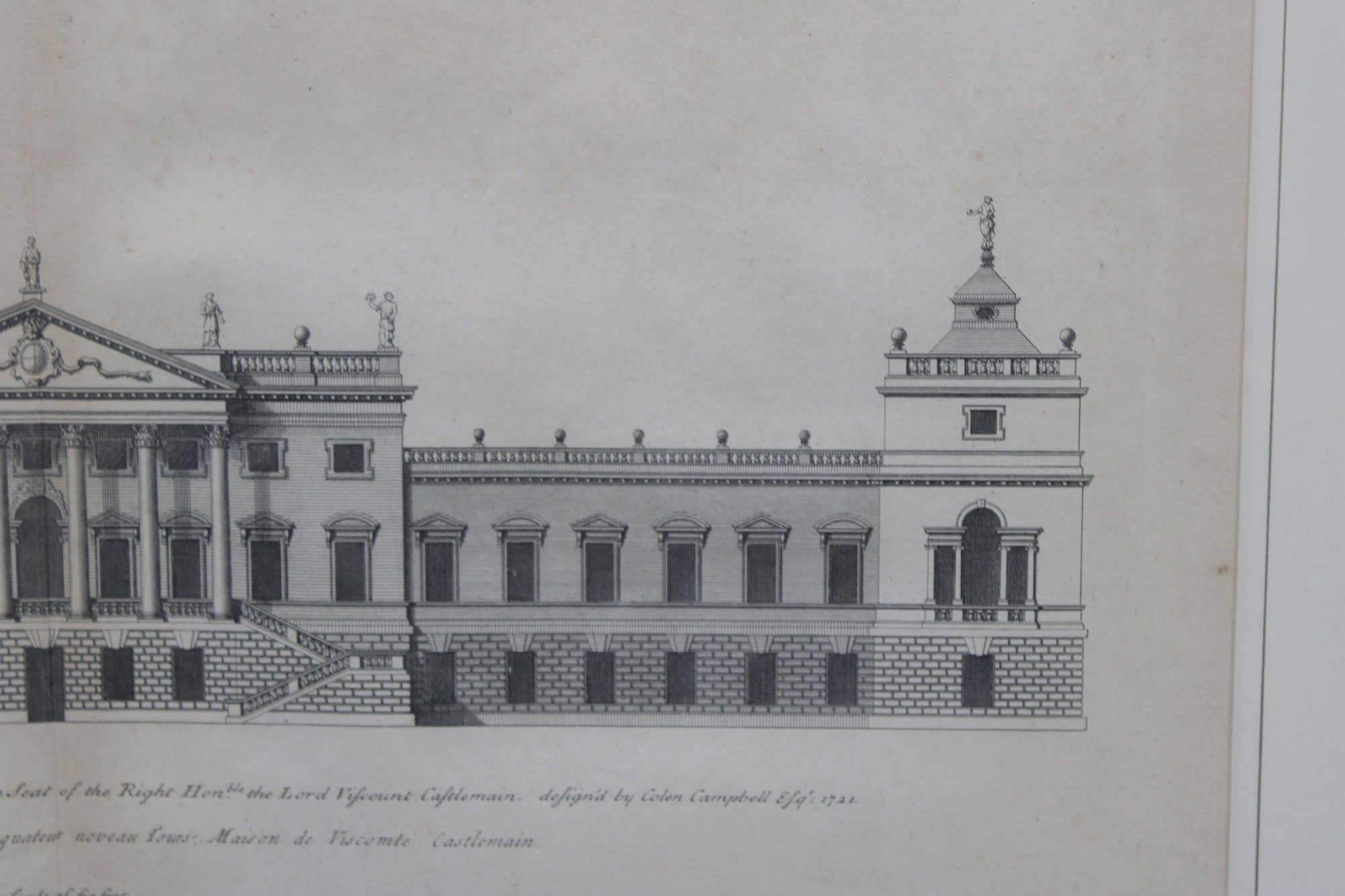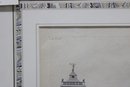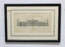 a framed antique architectural engraving, depicting a formal elevation of a grand classical building with colonnades, pediments, and sculptural roof details. The image reflects traditional European architectural design and appears to be taken from an early architectural or academic publication.